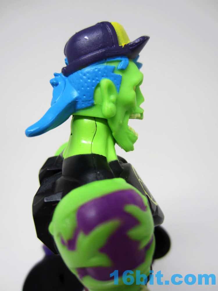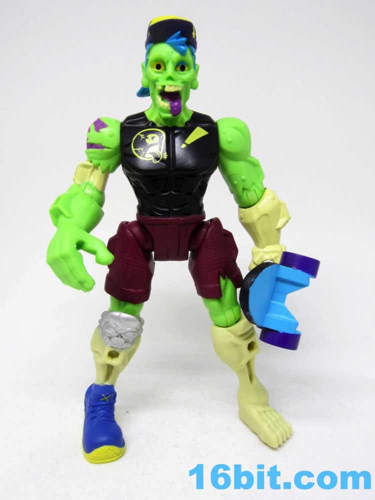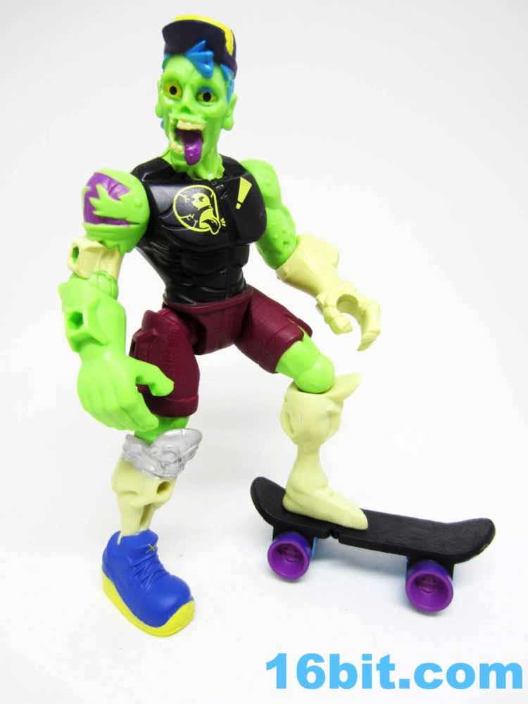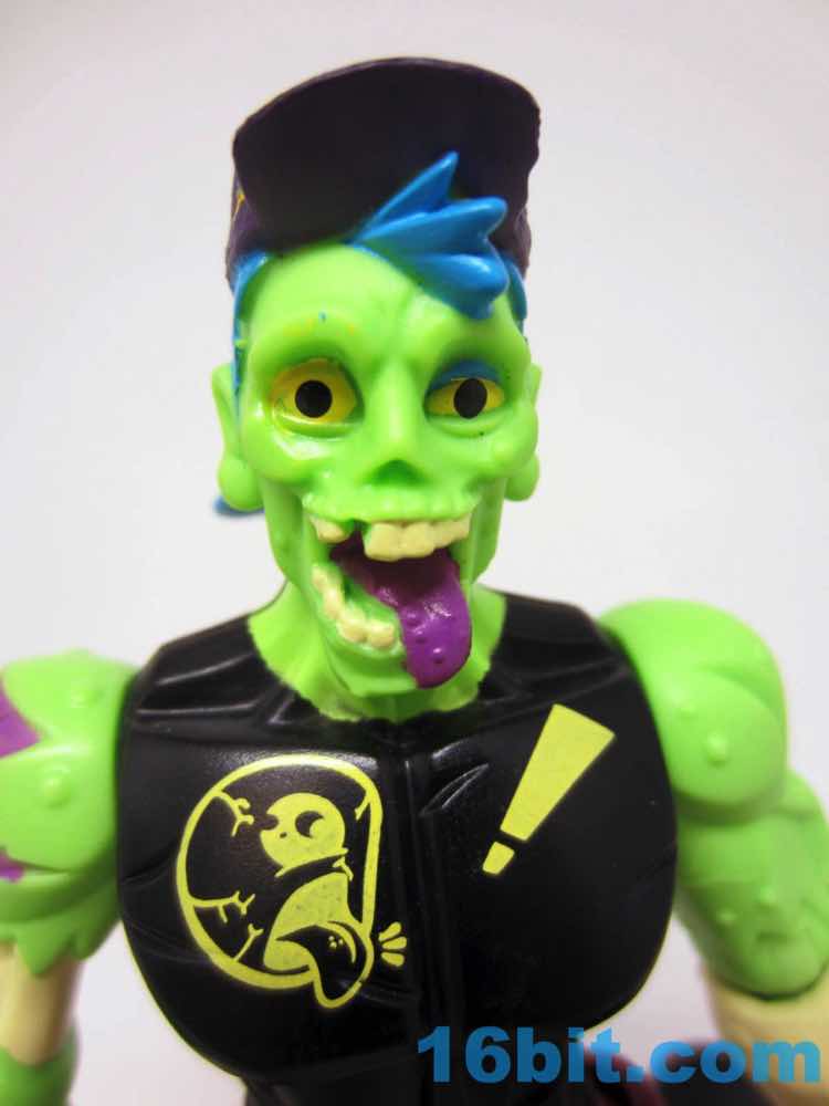 The sculpting is decent - I'm not as inspired as the other figures, but you do have warty flesh and exposed bones, not to mention very modern bright blue tennis shoes with yellow soles. A silver kneepad covers what is left of a leg, and there are some pretty nifty monster skate company designs on his shirt and on the bottom of his skate deck. The head is pretty fancy, with ugly long blue hair, missing teeth, and a tongue sticking out - clearly inspired by a rich history of the likes of Ed "Big Daddy" Roth and numerous gross-out toys which would follow in the 1980s. And tons of other stuff. It's a custom, clearly. The black shirt, green arms, and exposed bone make the figure look like a pre-made mash-up more than most of the others, with distinctive body parts and clothing coming together to build a disjointed yet youthful looking member of the undead. While he isn't a riff on classic monsters as much as the others, the strange level of originality here does impress.