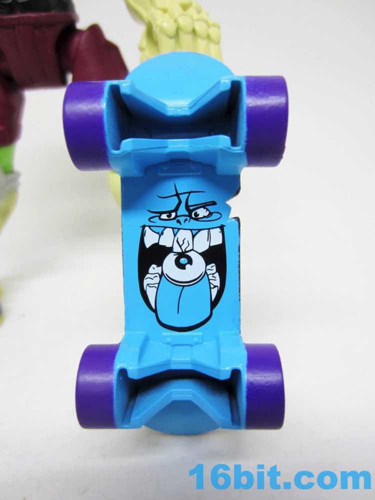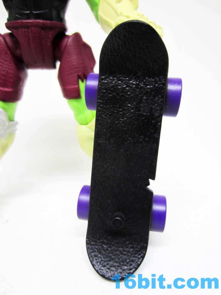 His only accessory is decorated nicely and can be carried in his hand without a fight - but it's kinda cruddy. The skateboard is painted very nicely, with a purple top with a blue bottom featuring some decent graphics. The wheels are painted on, but don't turn - it's just one big (cheap) solid piece. As such it's great for holding, as it looks like a budget Tech Decks toy. The texture on top is fantastic, plus it has a foot peg - so he can stand on top. Balancing him can be tricky, but this is true of actual skateboards as well.
