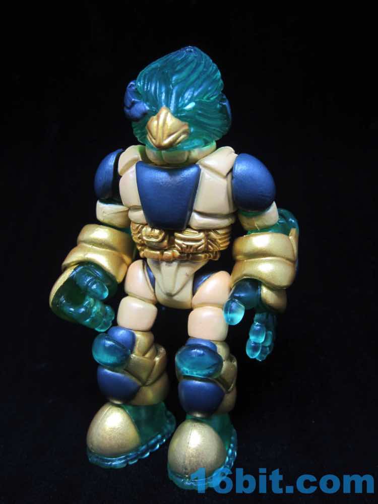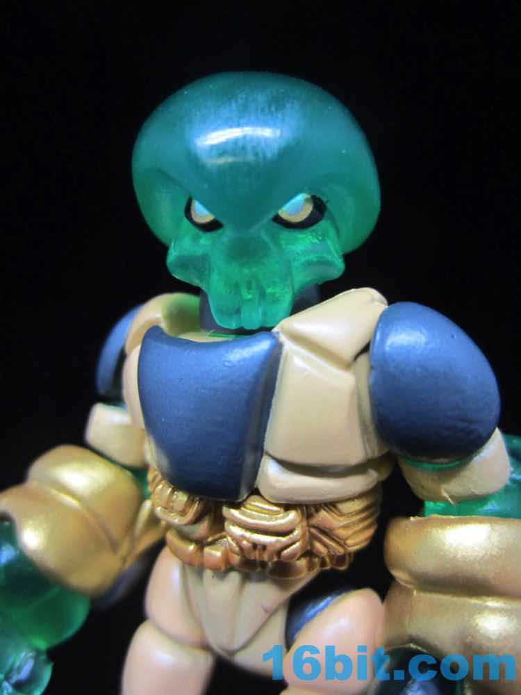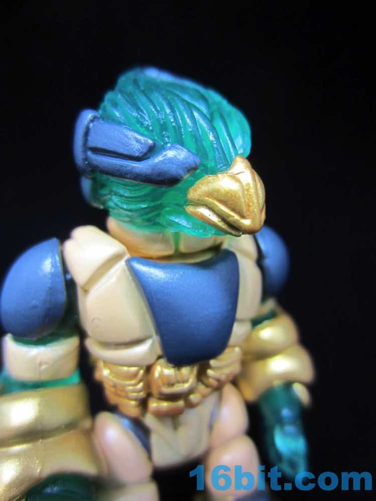 Molded in green, a dense layer of paint brings the figure to life. And so does armor. It's basically a standard Pheyden figure with wrist and shin armor, extra arms and legs, plus two spare heads. The default configuration is gorgeous, but if you want a bird head or a classic Pheyden head? You have those options. Pheyden's eyes are easily the best I've ever seen. A black outline with gold and white in the middle shines beautifully in the light, and there's a grey band around the neck.