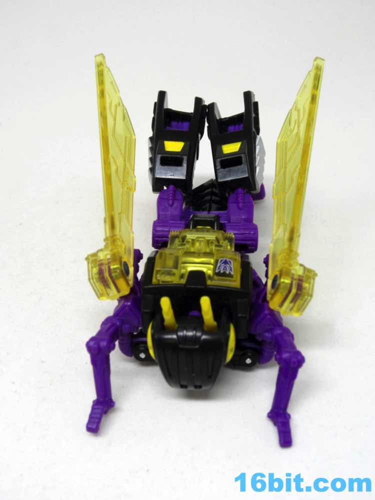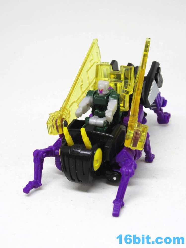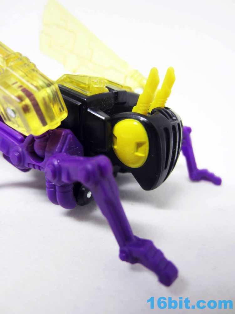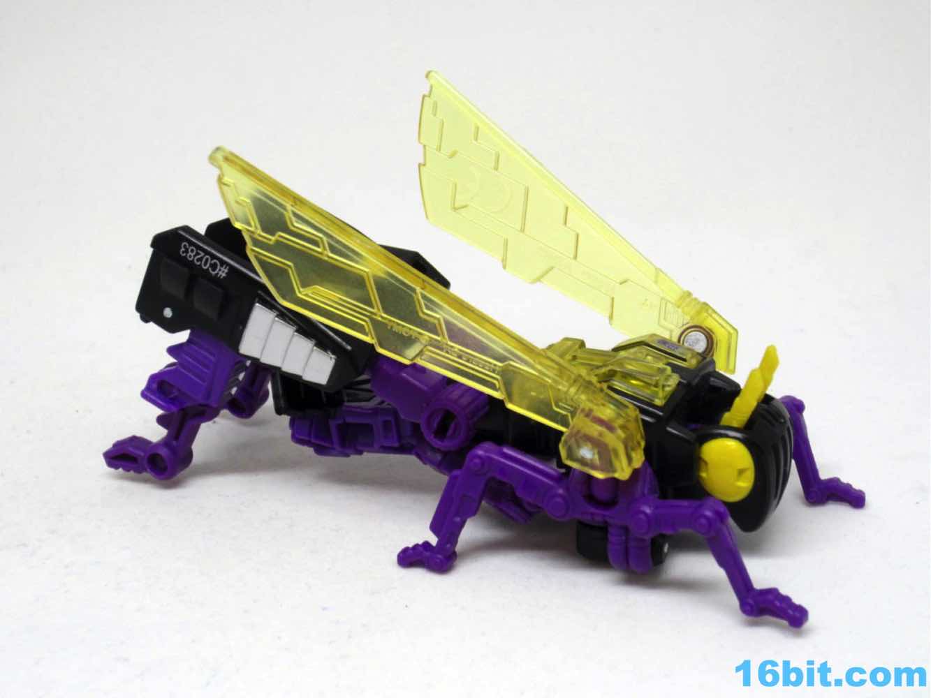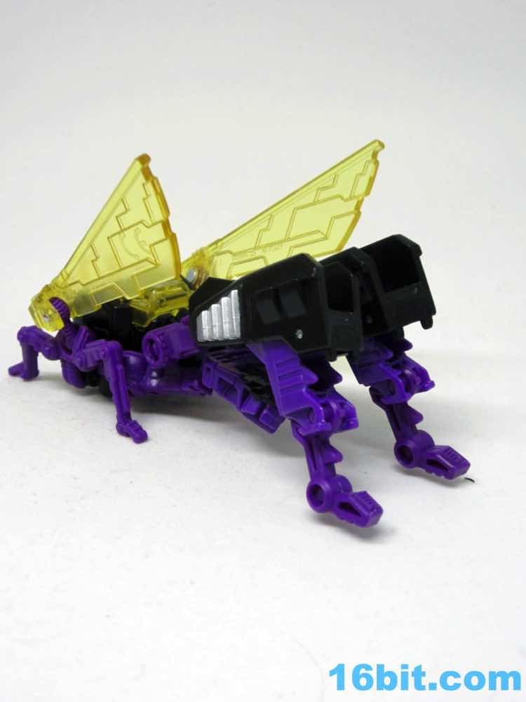 Transformation is sort of a pain, thanks to the aforementioned arm issue. The robot legs are the bug's back legs. The wings are the wings. The head becomes the head. The arms... sort of hang there. It's imperfect, but it works. It's about as convincing as the G1 original, with the added benefit of going wheel-free. It's not as fun as the other bugs as conversions go.