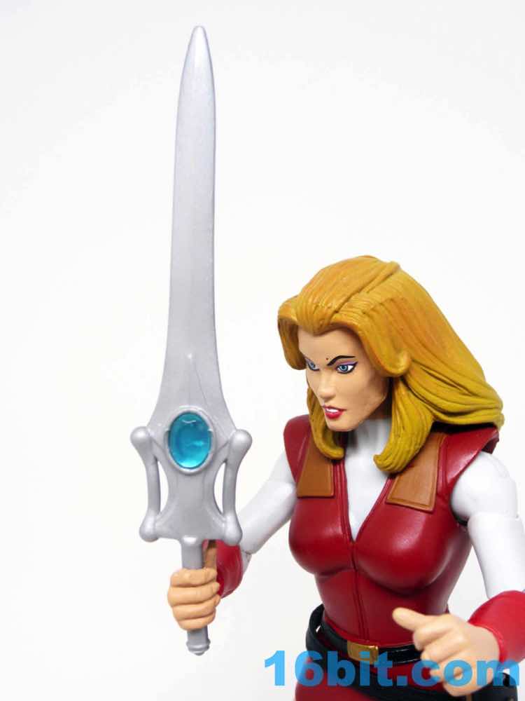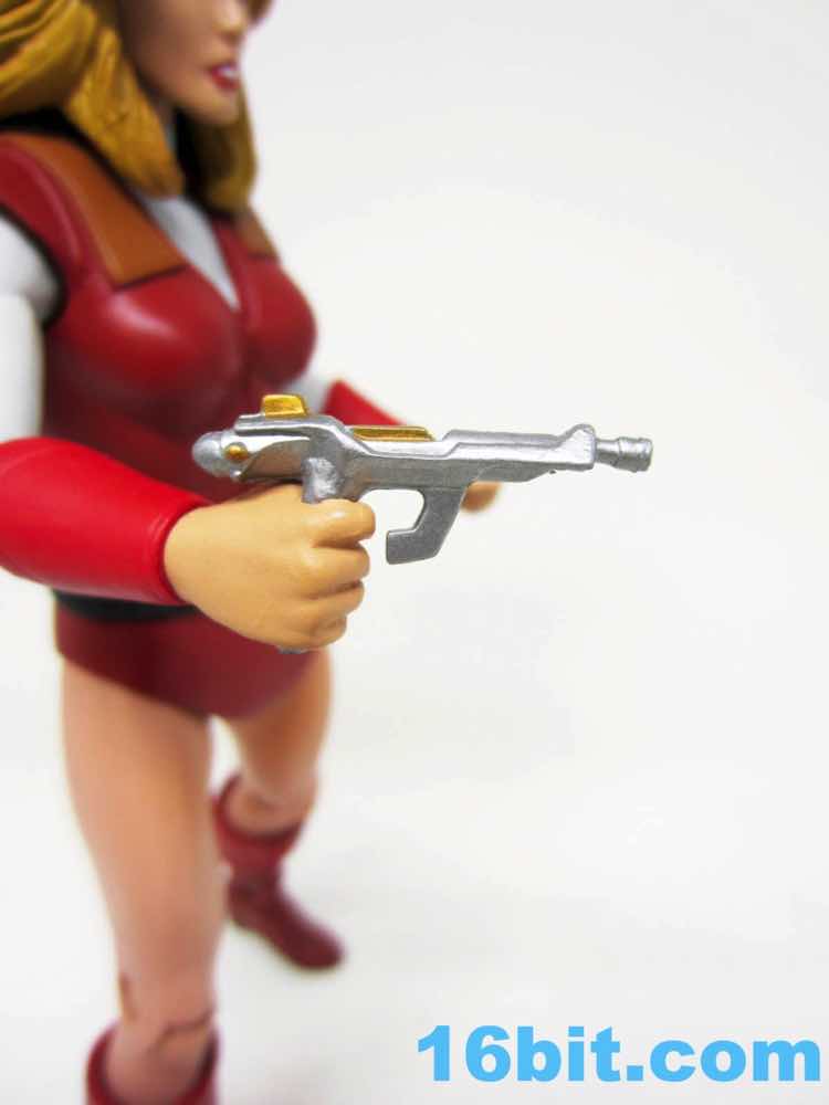While She-Ra would have come with way more gear, Adora's no slouch. There's no big or ridiculous weapons, but you do get a Sword of Protection and a holster with a removable gun. Unlike most figures in this line, she's capable of stowing her gear on her person-- the sword has a spot on her back, and the removable holster fits her pistol perfectly. I love the fact they actually designed a figure that can have her hands free, and be carrying her stuff-- this never happens. The blaster is silver with a little bit of painted detail, and is just about the right size-- small, but not too small. Her sword, which would be later used for She-Ra, is molded in grey and has a blue jewel near the handle. It's a nice touch, a little more paint on it would be nice but as it is you really can't complain. Oh, and a fun little detail: the pistol has an indentation that seems to align perfectly with her left hand, but the gun was packaged in her right. Weird.