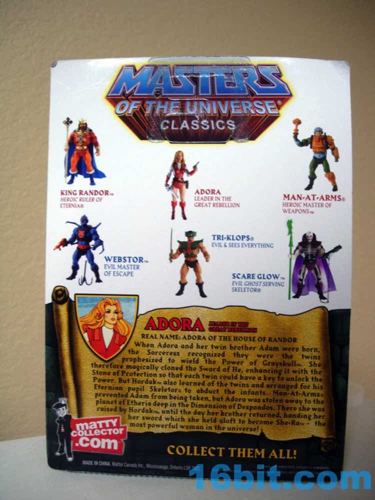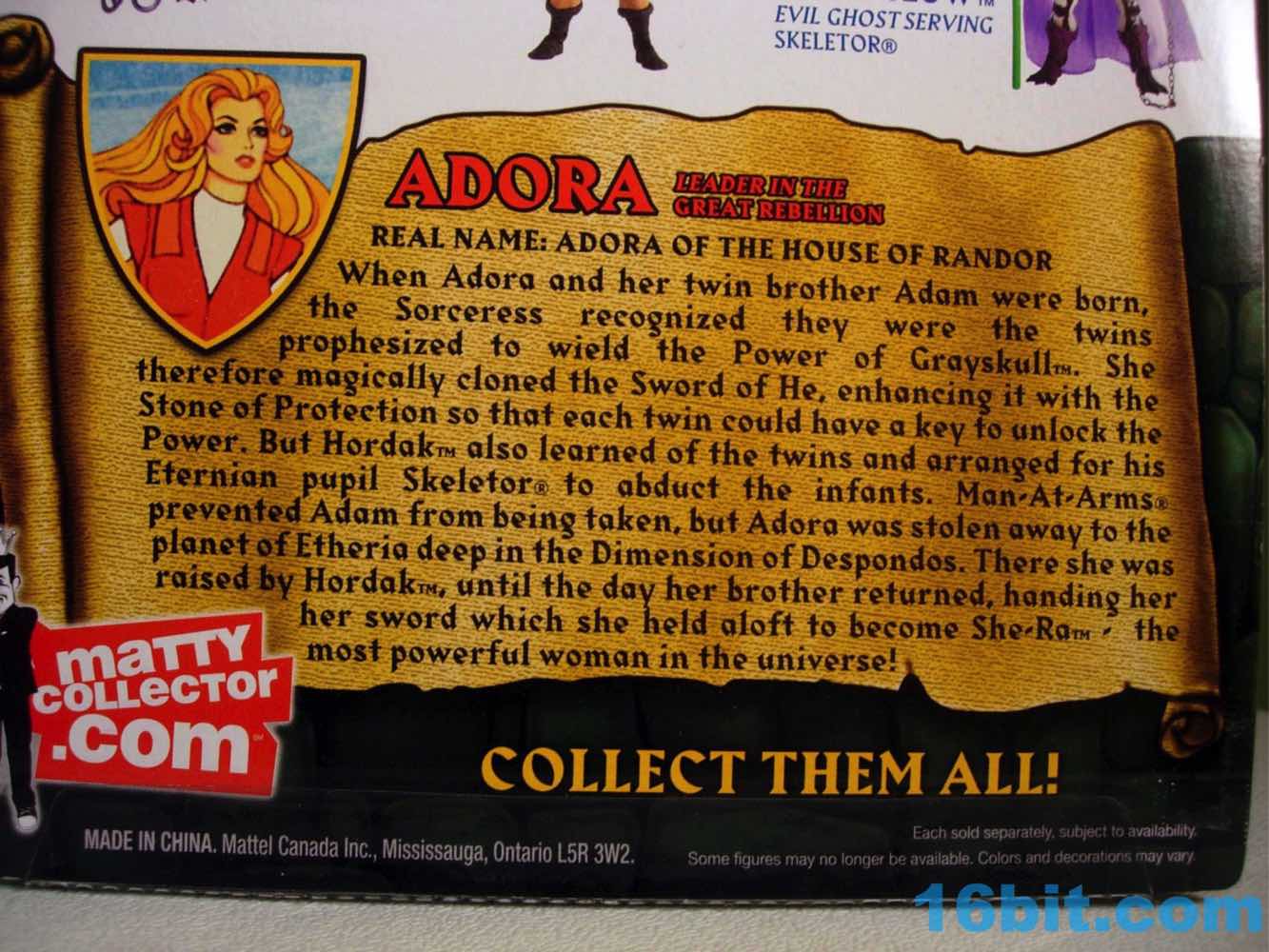 I apparently wrote this five years ago and didn't publish it - that's why the boxed shots look a little wonky, they were taken in 2011. Since Adora wasn't a proper toy in the vintage Princess of Power toy line, it's no surprise that this action figure seemed to draw inspiration largely from the Filmation She-Ra: Princess of Power TV show. But since this figure was made long before the Filmation license was supposedly signed... well, now I'm confused. But this is a good figure, or is at least interesting enough to jump on.