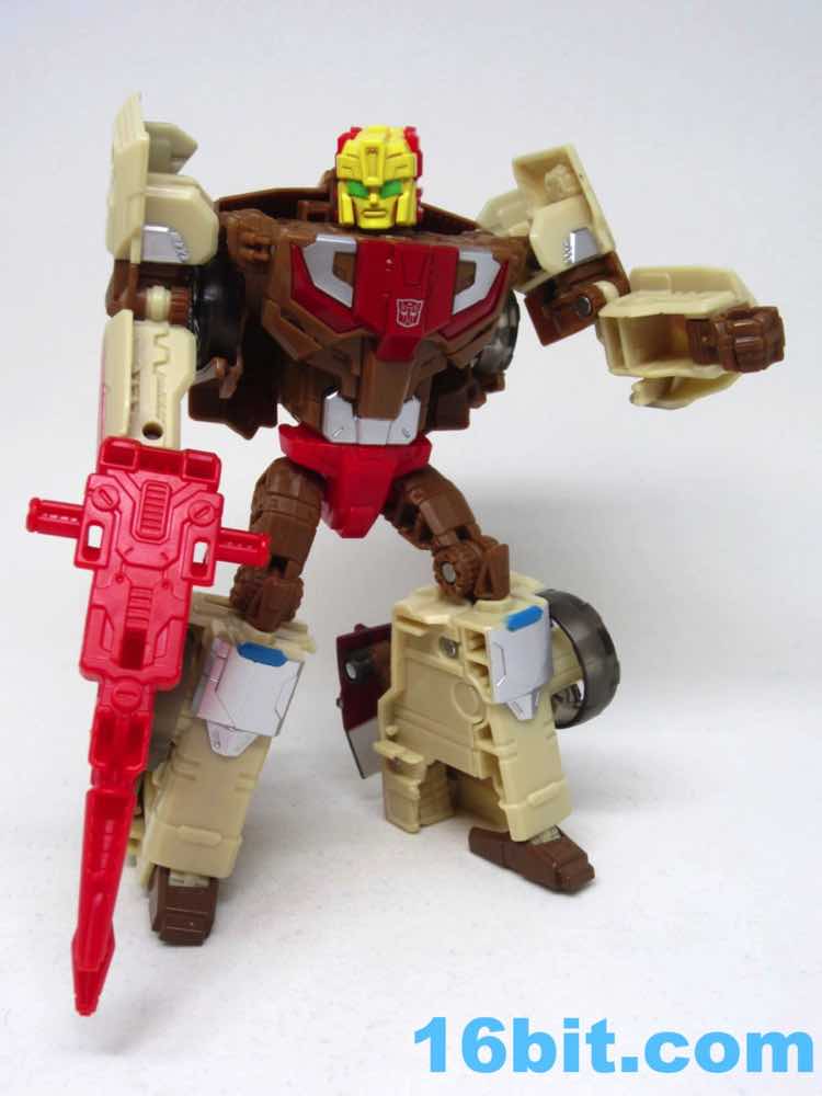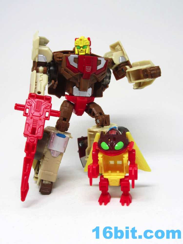The monster mode is almost better than the original. Sure, the original one was taller, but it went from a two-legged bug monster to a two-legged robot. This one goes from a two-legged bug monster to a barely convincing blade weapon or a jet fighter plane thing. At least it's cheap. At $5, the deco is really great with green eyes, a dark red head, and a nice Autobot symbol on his head. The arms and legs move, and you can position the wings too - why you'd want to do that, I don't know. The Titan Master robot folds up to fill in the belly of this mode, and it's pretty convincing.