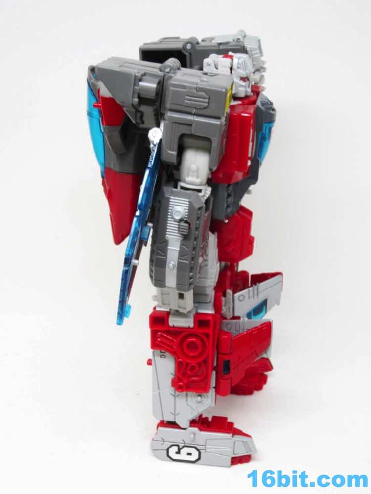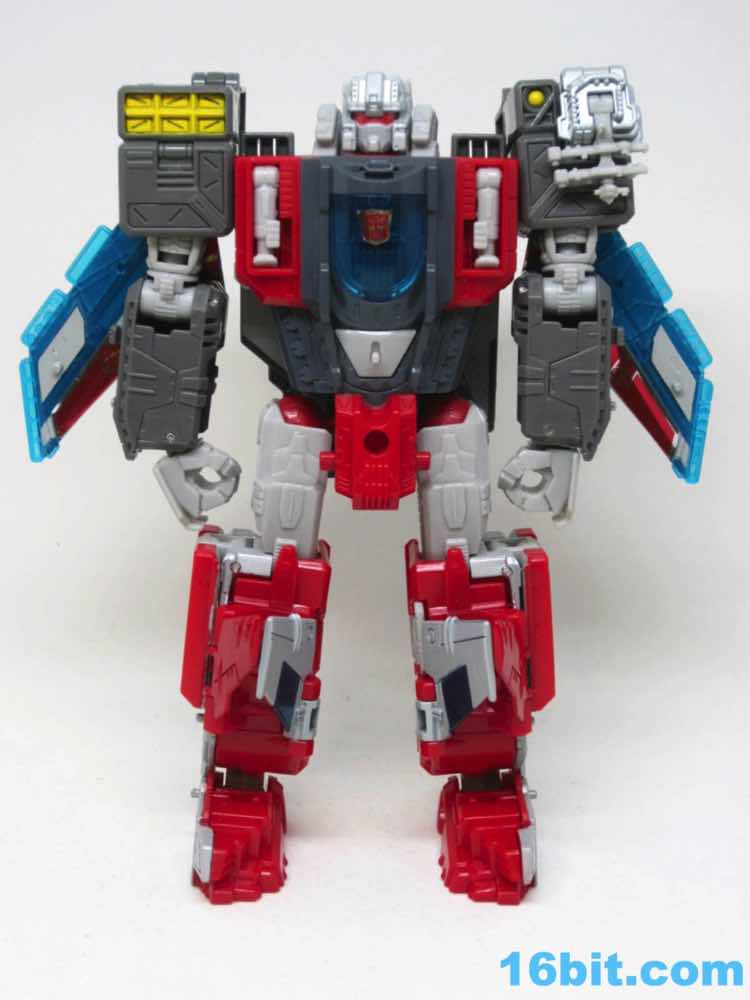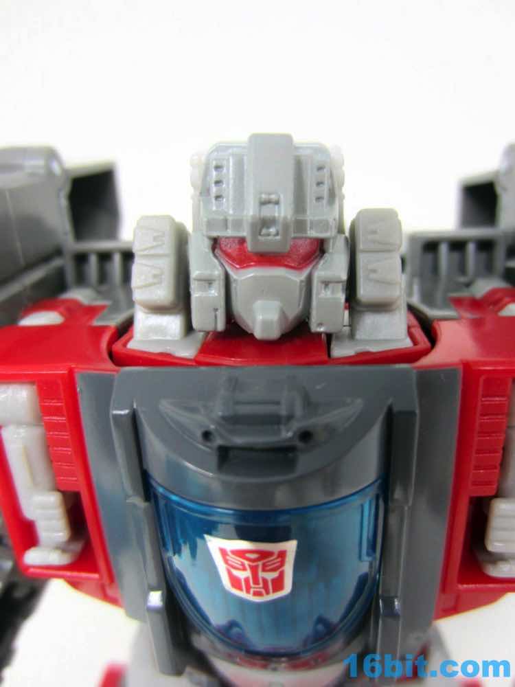 The carrier is nifty. It's mostly new parts, plus tons of pegs for Titan Masters or the jet sprue. Five tiny, tiny jets are included to represent Superion's jet modes - all of which can be affixed to the flight deck. They're cast in clear blue, painted white, and they will be the first things you lose. Mark my words. I'm storing them in the canopy right now, but I anticipate them vanishing to the land of socks and wishes shortly. There are numerous pre-applied stickers on this toy, which makes my job easier. When you see the stripes painted over ridged areas, you're going to be grateful that someone else went through the trouble so that you don't have to do this. Of the two vehicle modes, this brick is best. Sure, it looks like a carrier with jet and robot bits underneath, but at least it looks like a carrier.