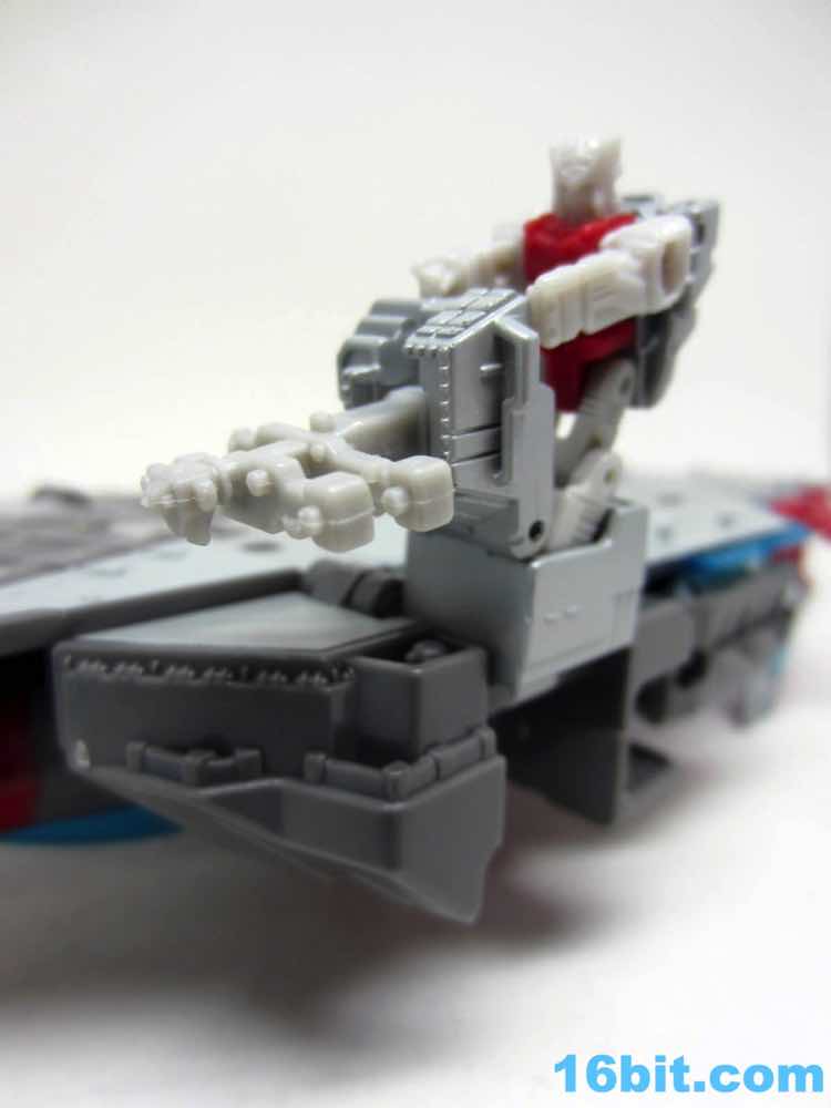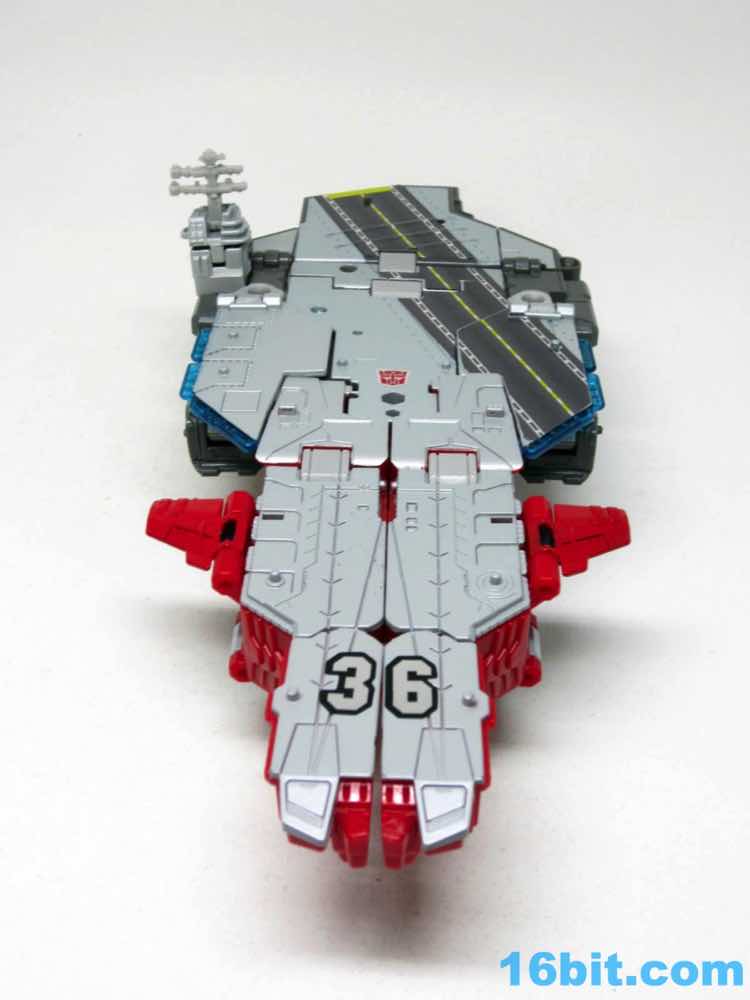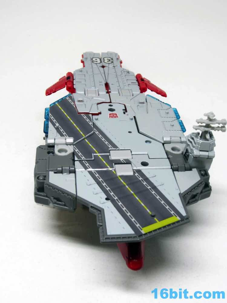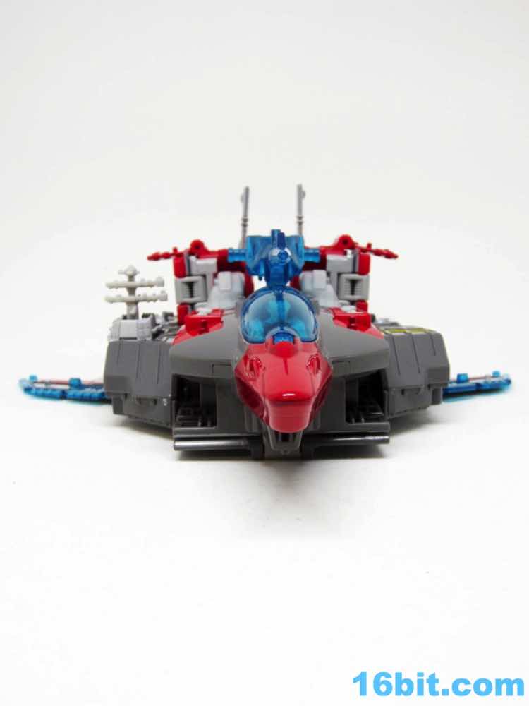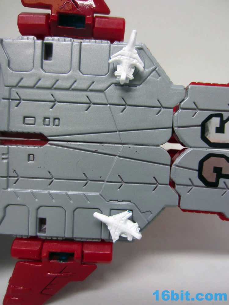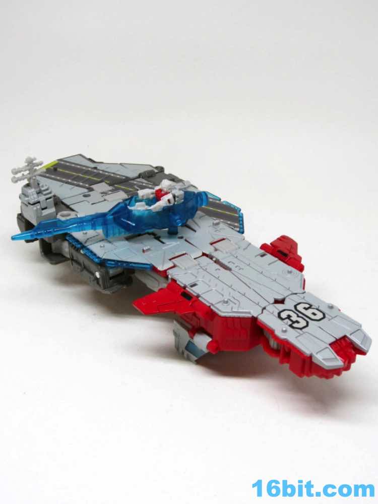 Transformation isn't as wonky as Alpha Trion, but that's because it's more intuitive - mostly. You know what an aircraft carrier looks like, and while you know what a jet looks like I don't know if the engineers really do. Everything folds away nicely, mostly, although some pegs and slots don't play as nice as one might like. With reference photos, you can probably figure it out without the manual.