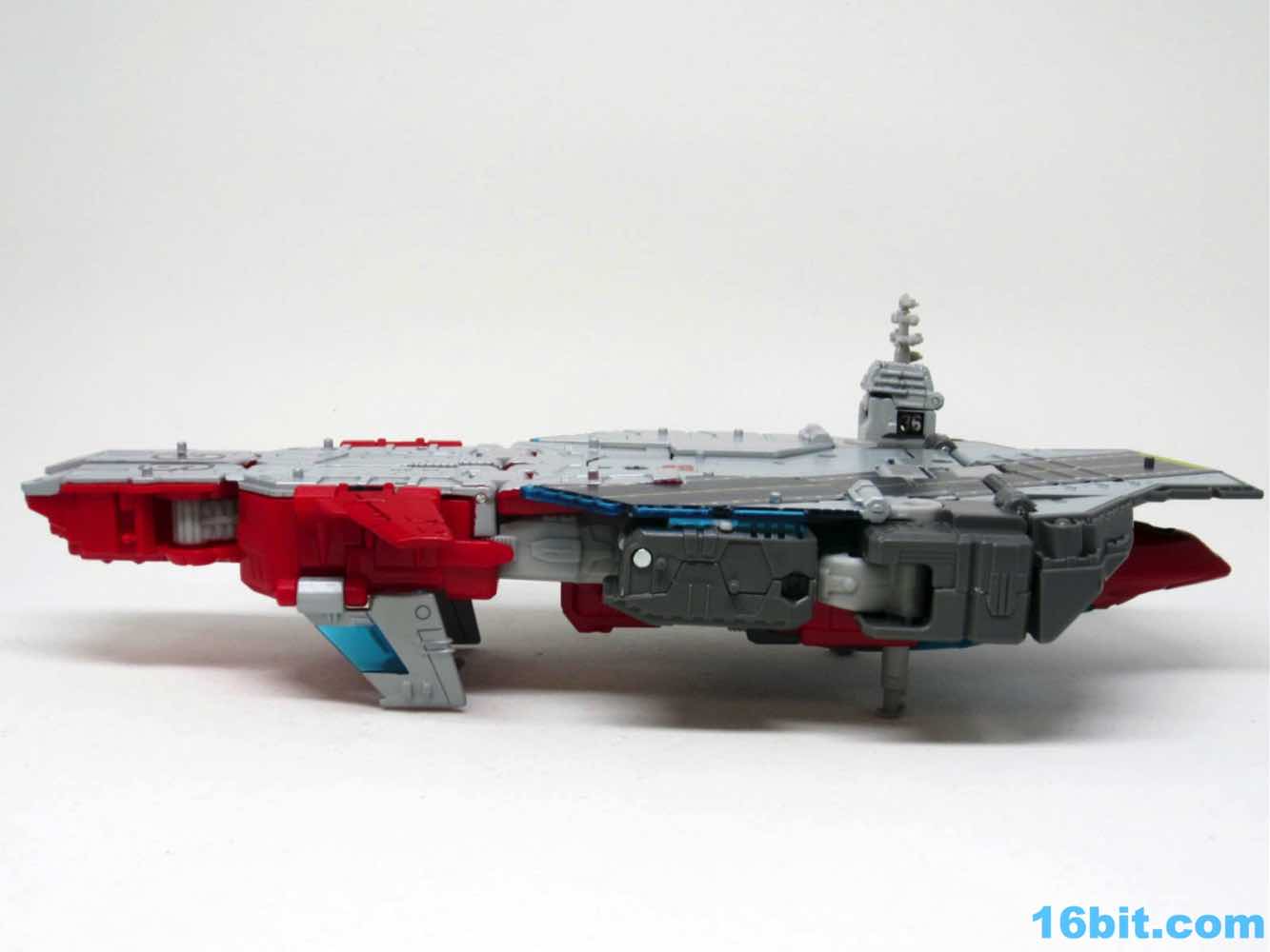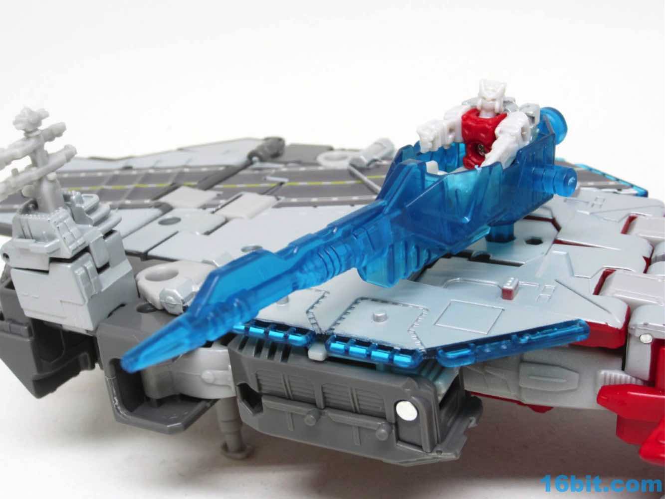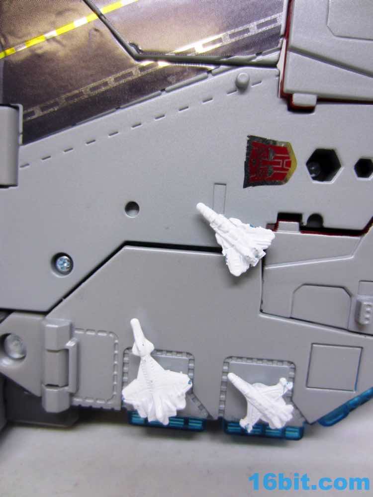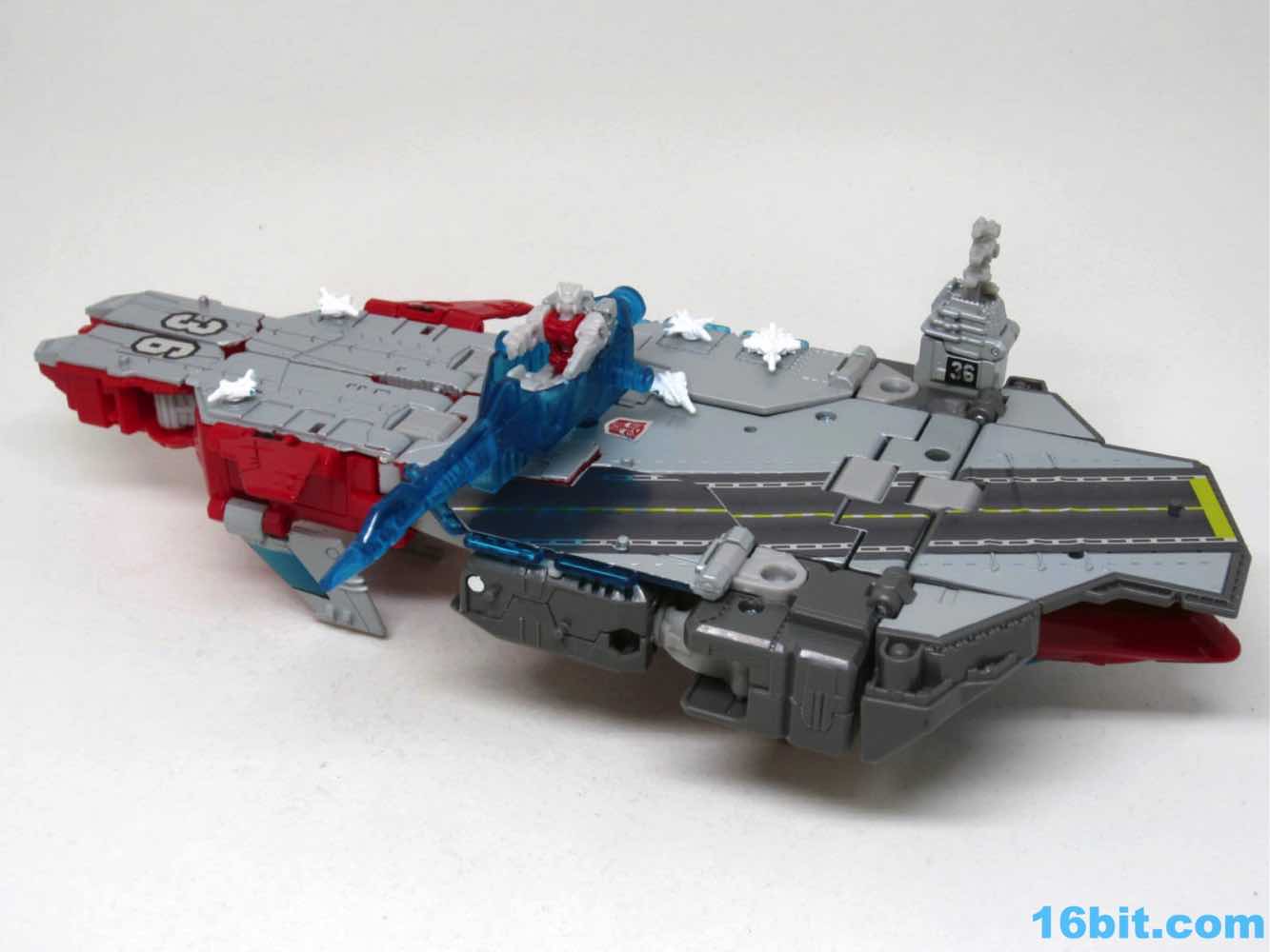 Transformation isn't as wonky as Alpha Trion, but that's because it's more intuitive - mostly. You know what an aircraft carrier looks like, and while you know what a jet looks like I don't know if the engineers really do. Everything folds away nicely, mostly, although some pegs and slots don't play as nice as one might like. With reference photos, you can probably figure it out without the manual.