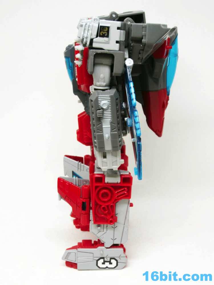 Broadside is a nice robot but it's not going to set the world ablaze - it's a huge improvement over the original, though. The original toy is something of a legend in that it's a brick in all three modes, and he isn't very pretty either. The robot mode is on the happy side of acceptable, and since nobody knows how Broadside actually looks it's a good update. You think you do, but you don't. In all seriousness, the robot does have the het bubble chest, red legs, and grey arms like the original toy. The eyes are still red, and it has a fair amount of kibble. You'll notice jet wings hanging off his back, tiny wings on his knees, and a control tower wart on his shoulder.