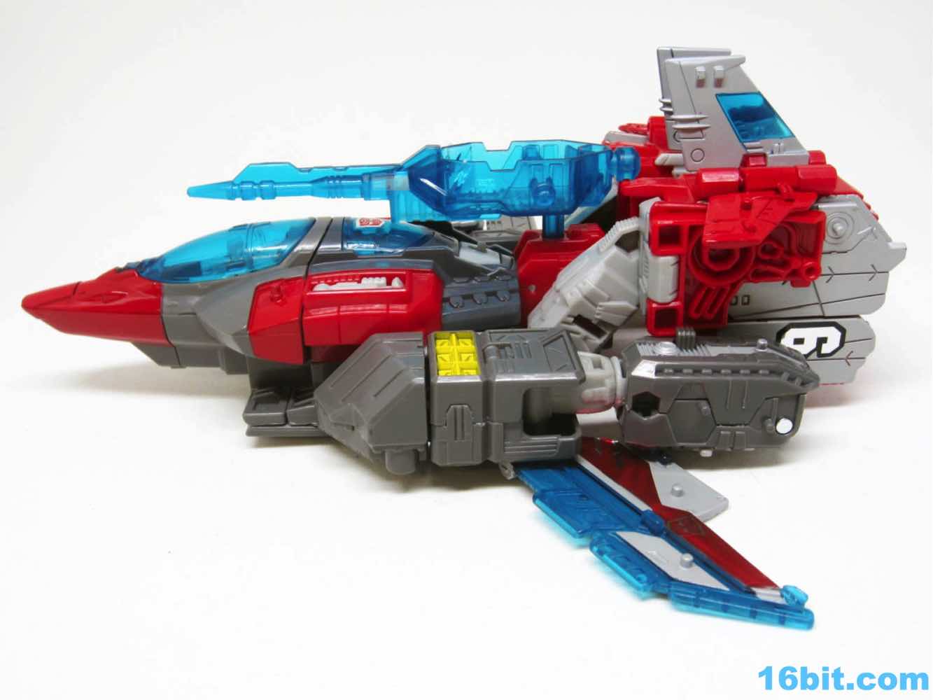 The jet is a weird mess. Robot legs become the back half, raised at a strange angle. The wings are on the ground, and cast in clear blue. Why? I like the front of the plane as it's colorful and inviting with seating for one inside. Given decades of experience designing robot to vehicle transformations, it's amazing this one came out as it did - trying to work in a triple-changing headmaster has to be an engineering challenge the likes of which I could never succeed at, but apparently neither can the designer here. It's just wonky. Some of the parts look good, but as a whole it doesn't quite fit together like some of the other, better jets in this and previous lines. I'd say that I've seen worse, but I'm at a loss to recall which toy actually had a worse plane mode than this one.