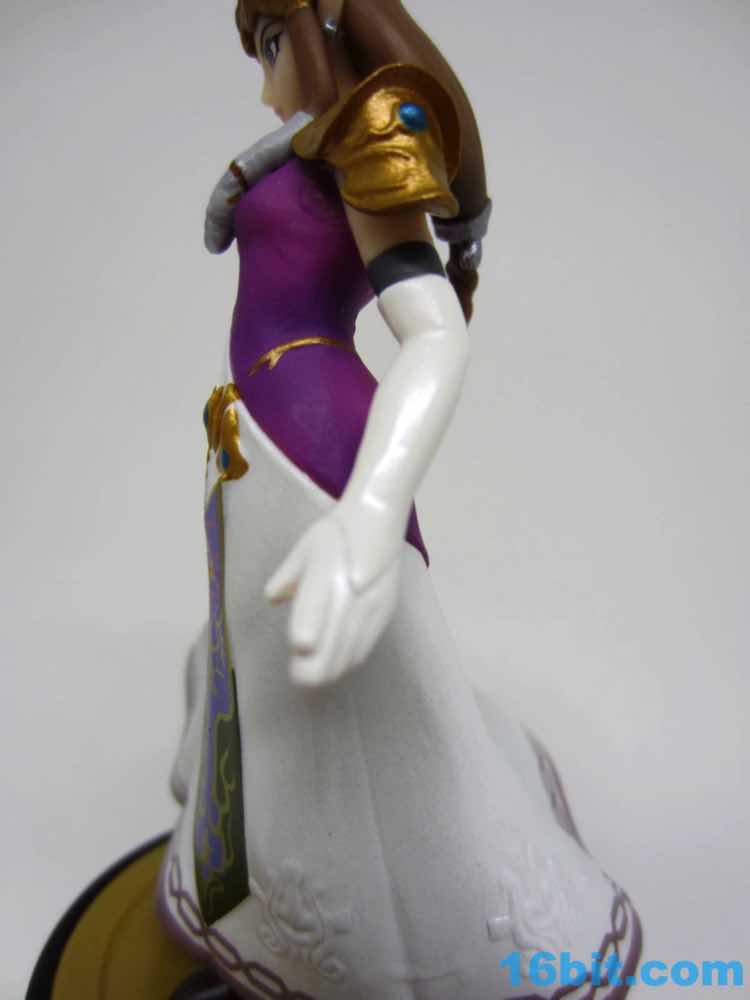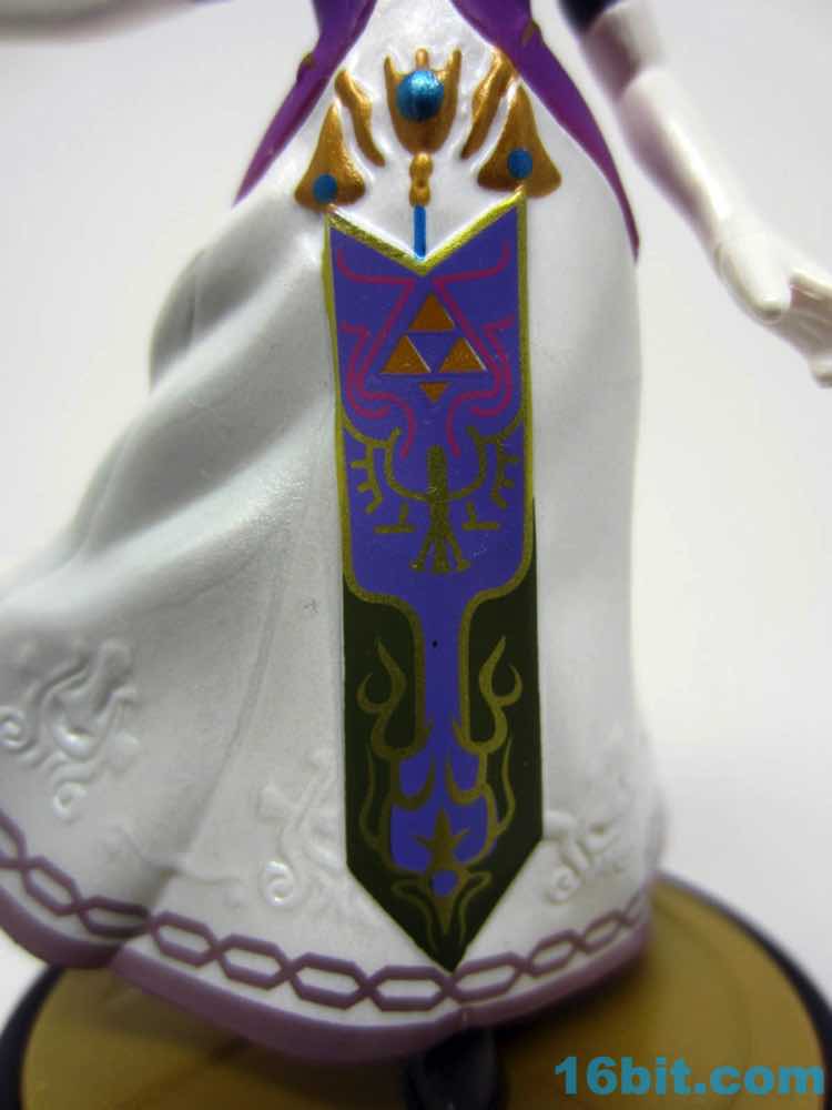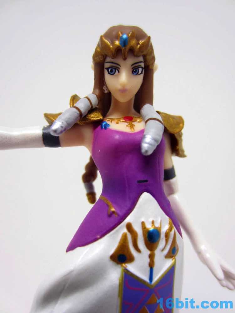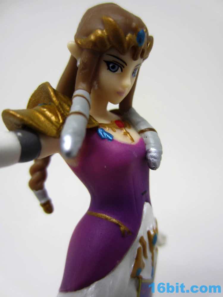 She was a bit of a slower seller for a while, so when stores had 2 for $20 sales she generally stuck around with Link, Mario, Pikachu, and a few others. One arm is outstretched so you get a look at her fingers and opera gloves, but also the surprisingly ornate dress. You can see little embroidered bits along the bottom, as well as subtle layers of fabric around her hands. She has brown boots visible under her dress which come complete with painted soles. Not only that, she has gold armor with painted blue gems and a swell tabard with a painted pattern over it too. The eyes are surprisingly expressive with black outlines and multiple colors, and if that wasn't enough you can see a gem in her gold tiara too. Nintendo put some serious bank in paint on this one.