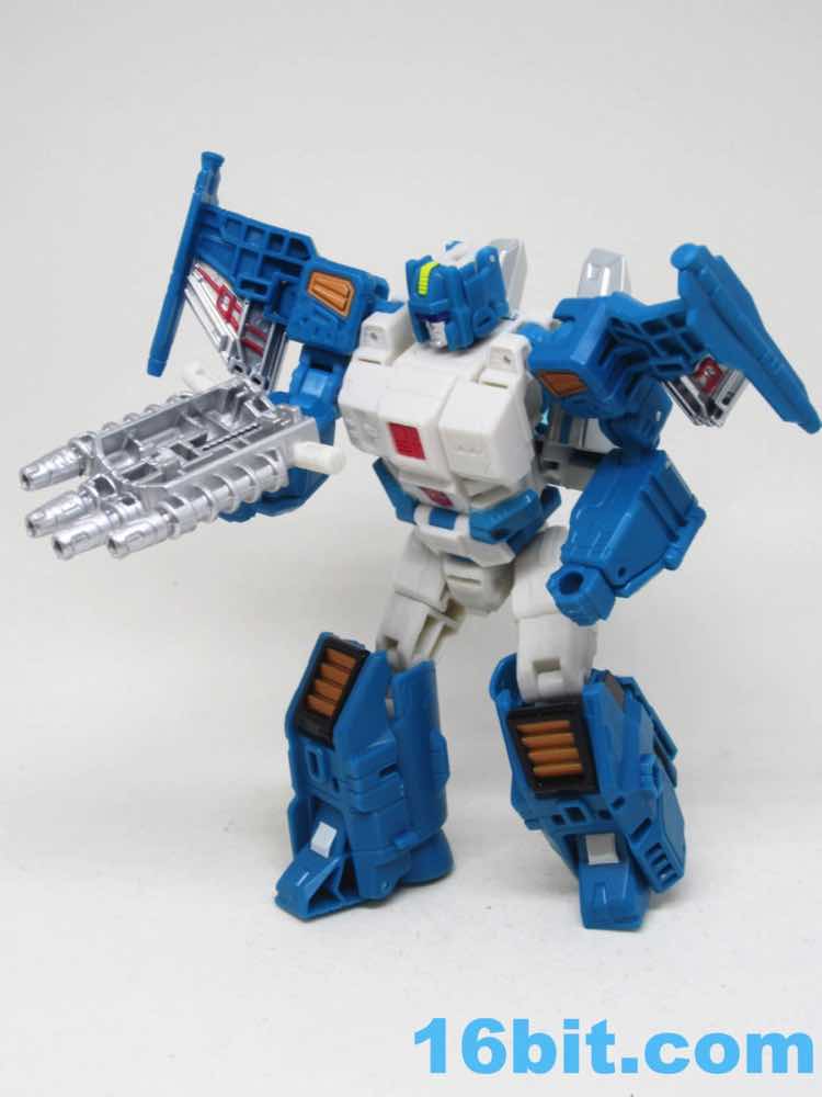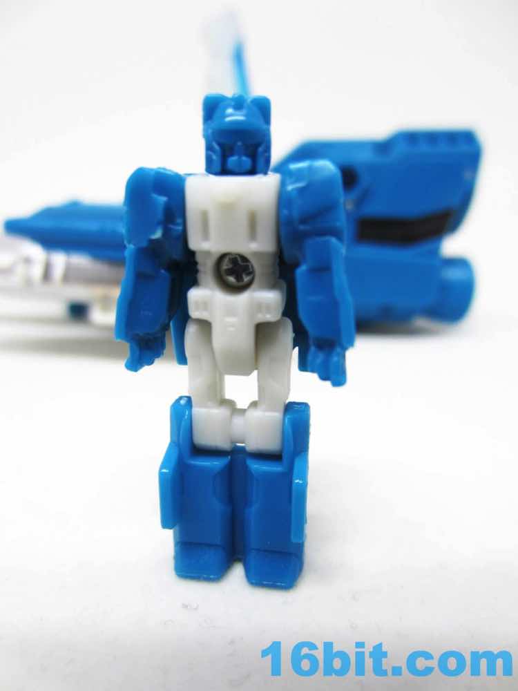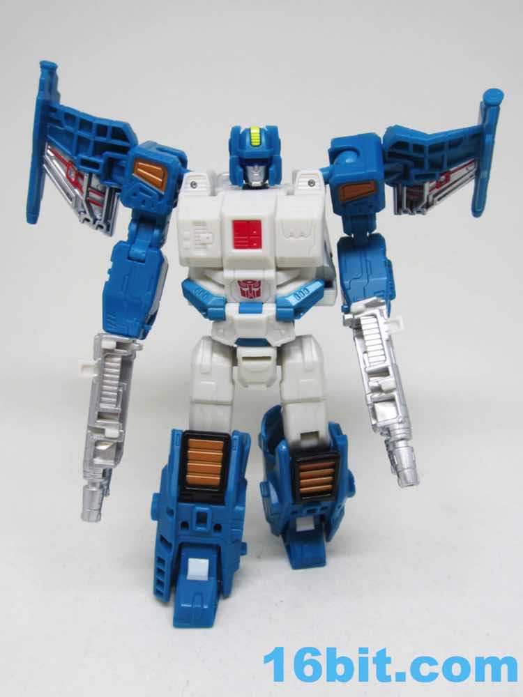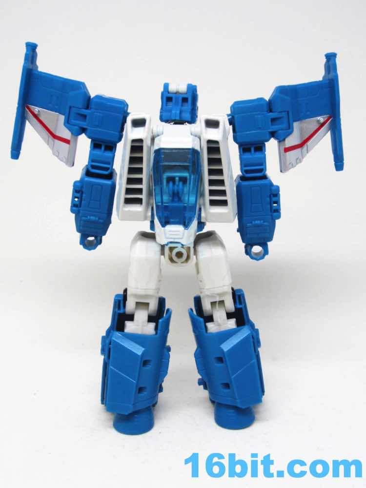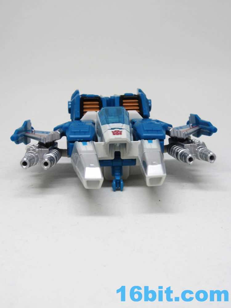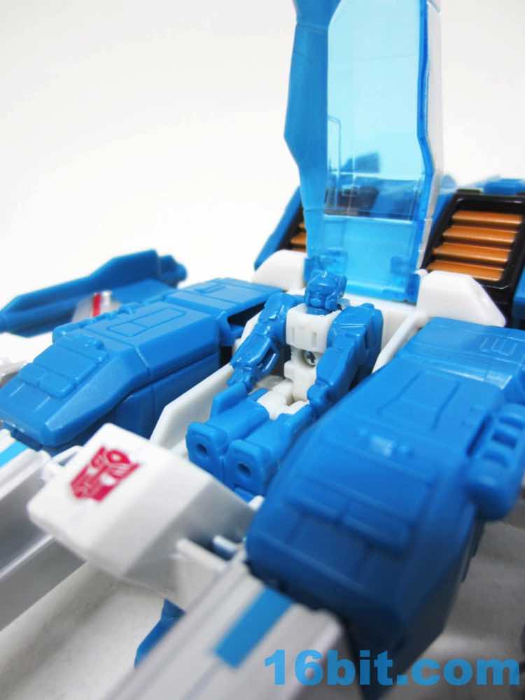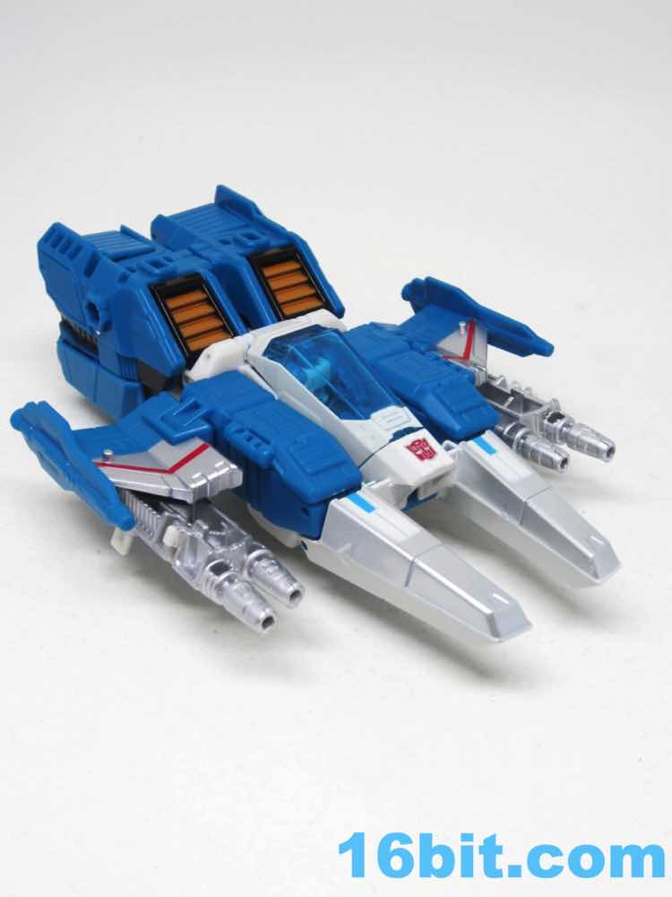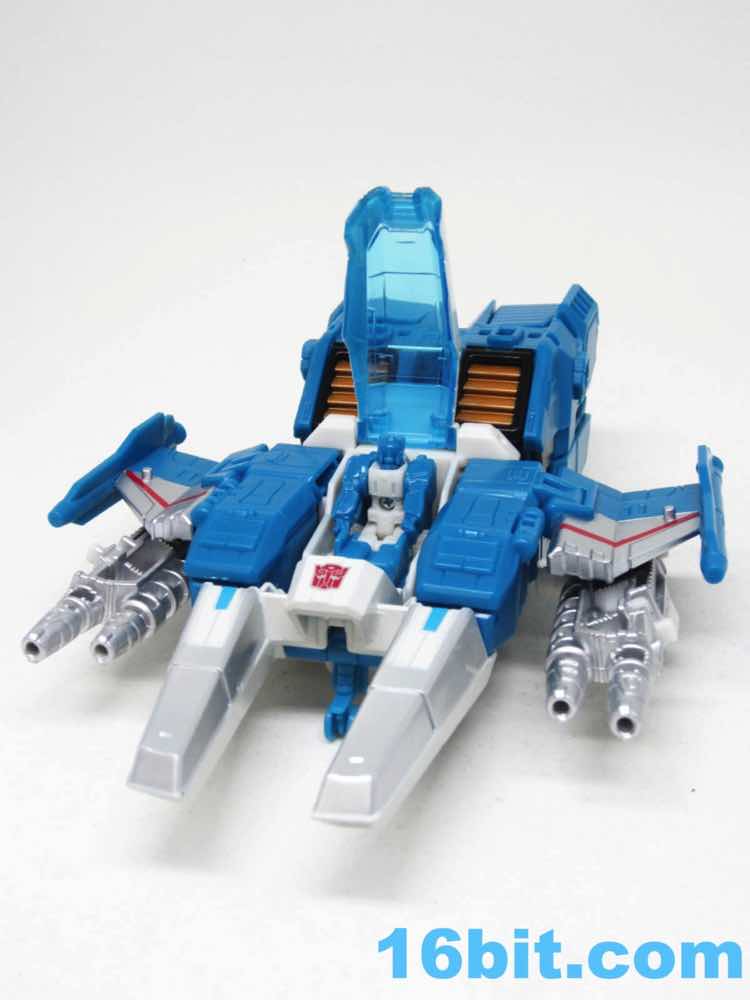 The vehicle mode looks like toys I had as a kid - the white and blue, the clear cockpit, and a place for figures to sit and pilot it. Transformers didn't enjoy this play pattern until a few years in, but many other 1980s toys had little drivers in their cosmic sci-fi vehicles. This one is a... er... jet? Plane? Starfighter? It has two metal forks and wings, so let's say it's an attack forklift. That would seem to be functional, at least - it's pretty meaty with plug-in guns under his wings and not much else. Everything massages in place nicely, and it's relatively easy to figure out without instructions. The vehicle basically only serves as a jet toy with limited interaction with his driver - he fits nicely in the driver's seat. TakaraTomyHasbro did a fantastic job here. Short of the original jump action figure or labels, there's really nothing more you could demand from an updated vehicle here. I think Hasbro nailed it on the first try.
