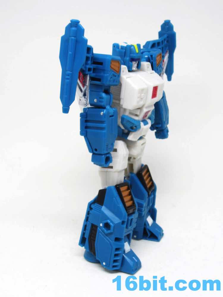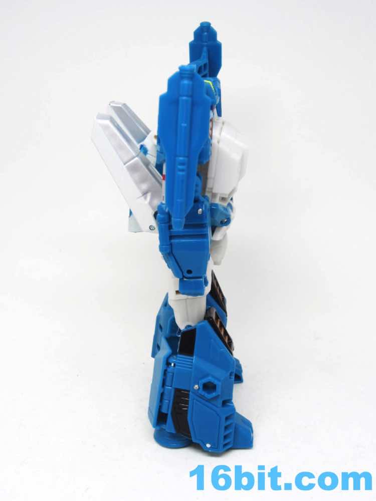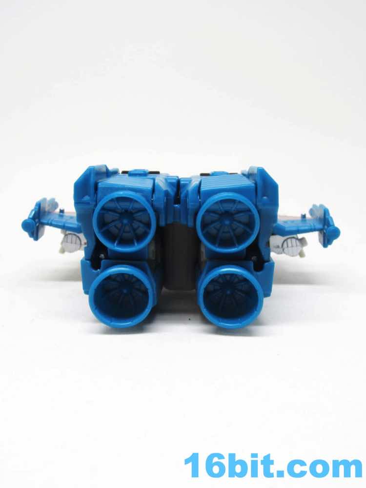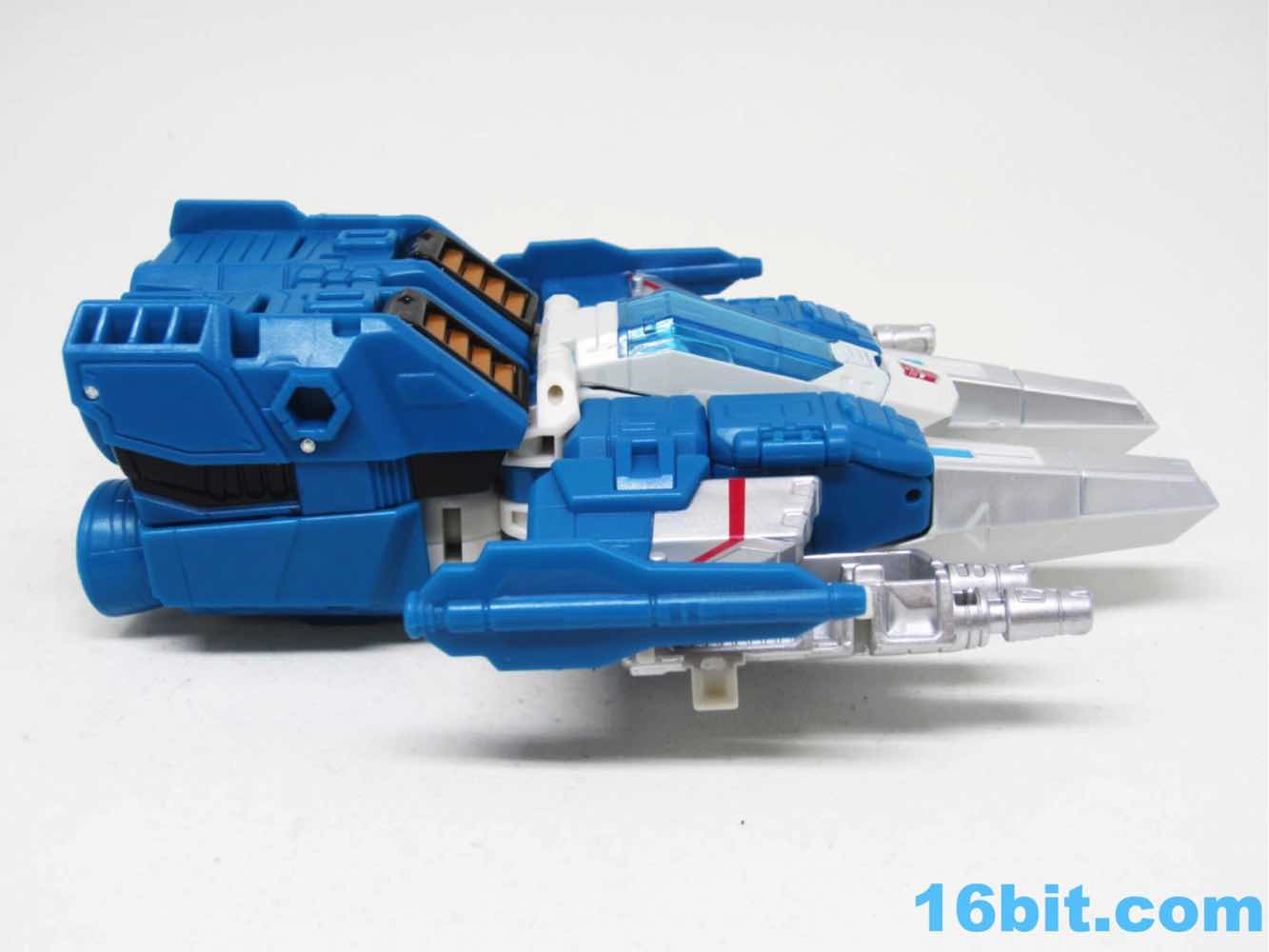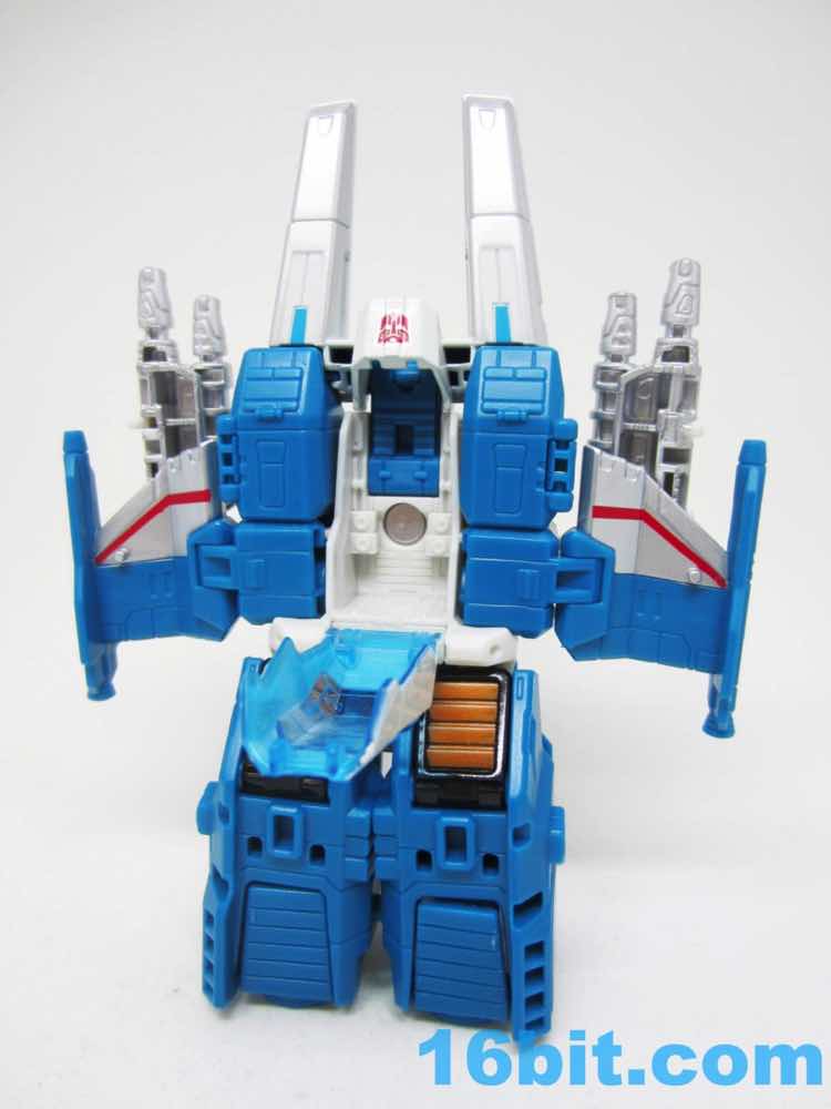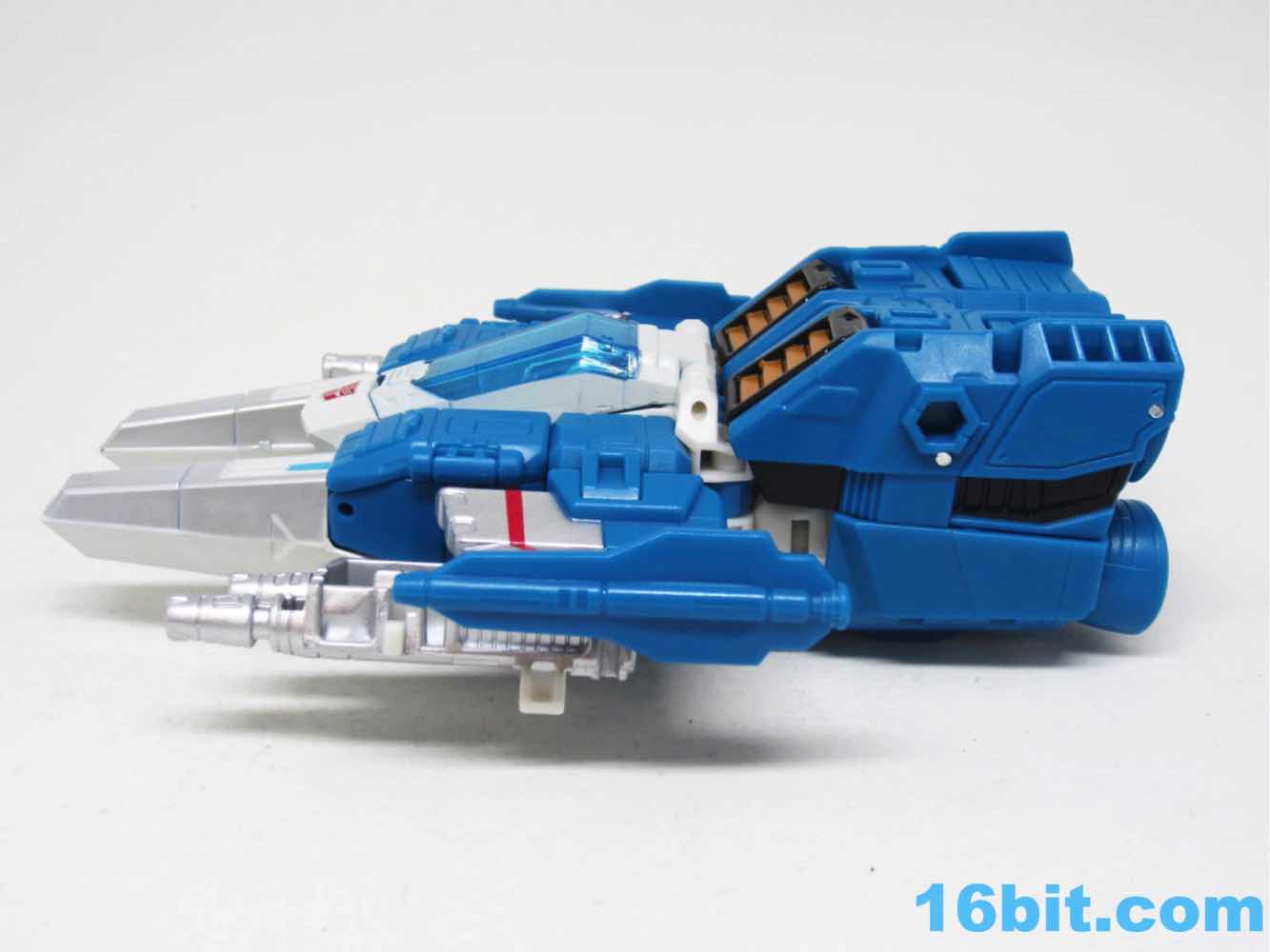 The vehicle mode looks like toys I had as a kid - the white and blue, the clear cockpit, and a place for figures to sit and pilot it. Transformers didn't enjoy this play pattern until a few years in, but many other 1980s toys had little drivers in their cosmic sci-fi vehicles. This one is a... er... jet? Plane? Starfighter? It has two metal forks and wings, so let's say it's an attack forklift. That would seem to be functional, at least - it's pretty meaty with plug-in guns under his wings and not much else. Everything massages in place nicely, and it's relatively easy to figure out without instructions. The vehicle basically only serves as a jet toy with limited interaction with his driver - he fits nicely in the driver's seat. TakaraTomyHasbro did a fantastic job here. Short of the original jump action figure or labels, there's really nothing more you could demand from an updated vehicle here. I think Hasbro nailed it on the first try.