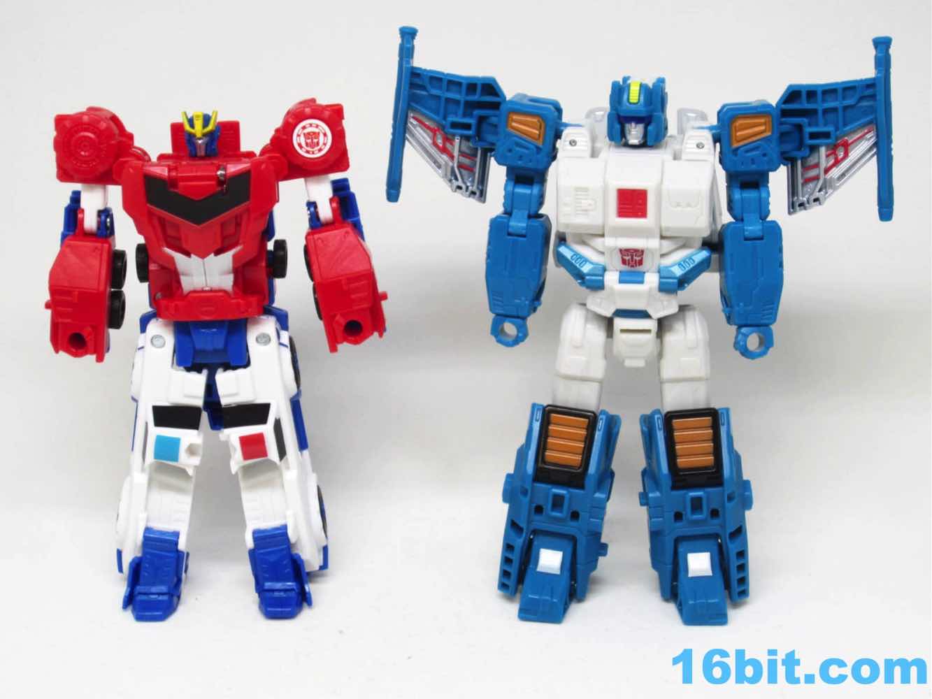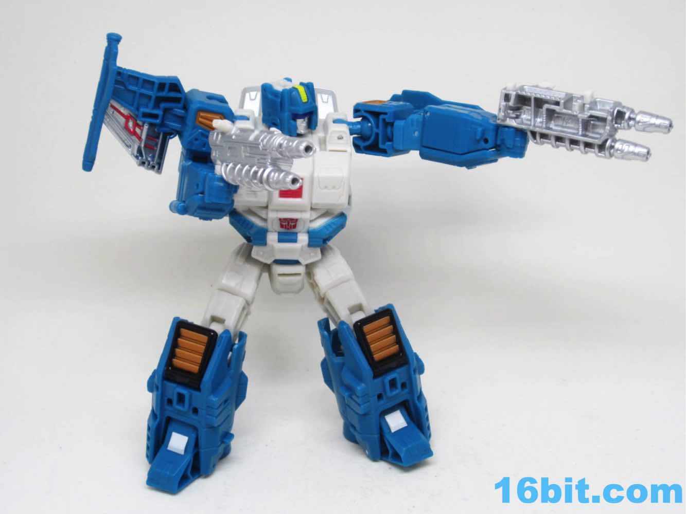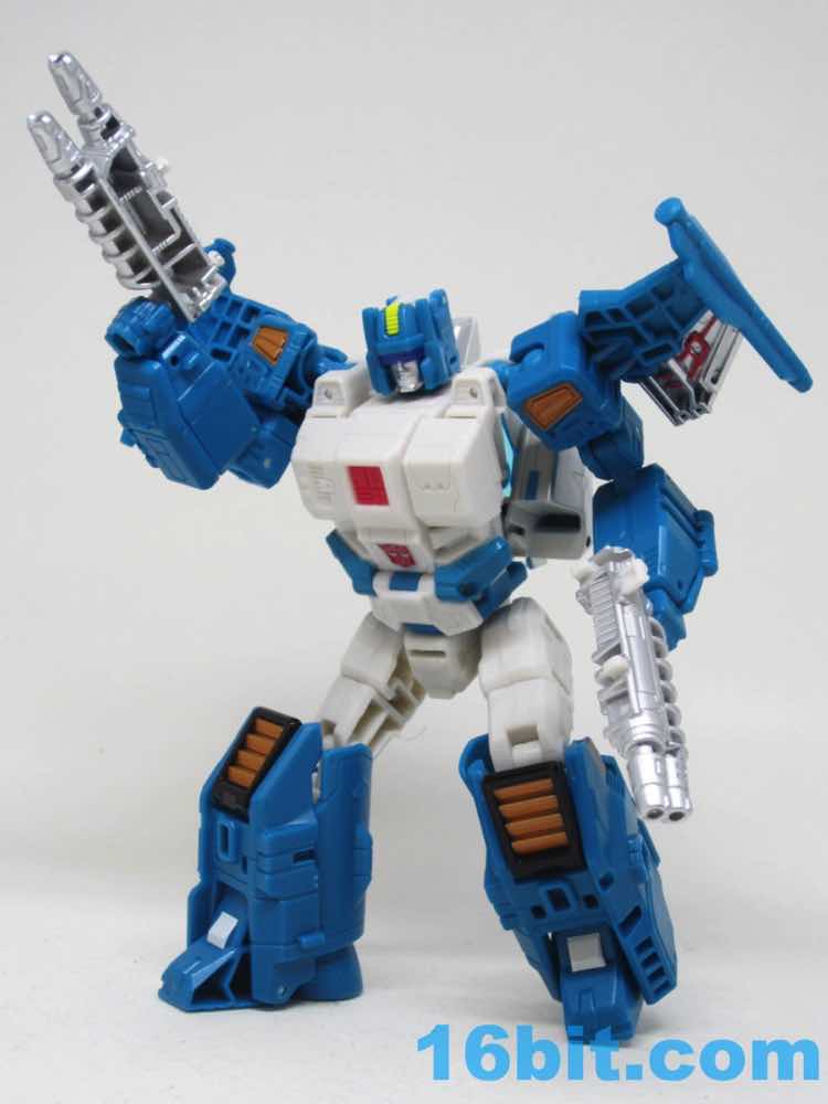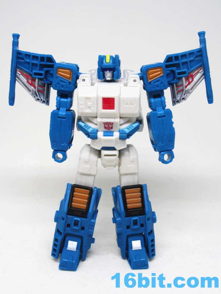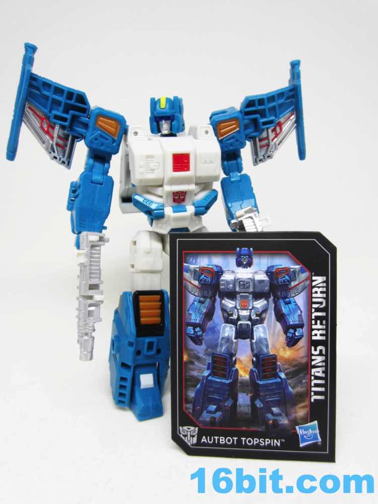 Depending on how you count, Topspin has a whopping 20 - or more - points of articulation. Double elbows aren't something you get every day, and the big, bulky chest looks like something out of the recent comics. I love the silver detailing, the various painted vents, and the wires on the wings. The colors are bright and cheery, with everything fitting together perfectly. His big feet make him incredibly stable, letting you pose him in all sorts of ways. It goes above and beyond what we normally see in this size, where I'm used to elbows that are mobile but occasionally restricted, or fists that sometimes are a smidgen too tight for the weapons. (Lookin' at you, Generations Wheeljack.) Sure, Topspin's off-white plastic is lacking in detail and comes off as plain - but it's true to the original.