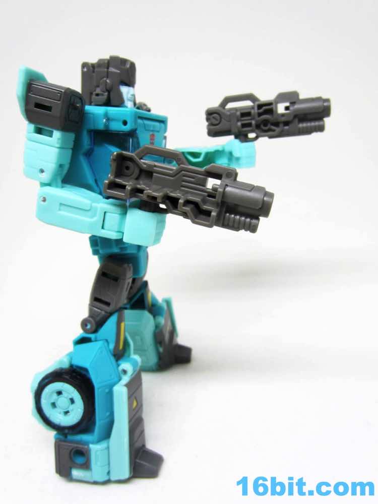 What really surprised me was how they managed to tuck away so much kibble. Sure, you can see wheels on his legs - but the front of the truck tucks into the body and the figure has no backpack. None. I'm astonished - there are two 5mm holes so you can mount his blasters on the back if you like. It almost looks like an incomplete robot just because of all the vehicle kibble you don't see. I'm always expecting an eyesore of a car hood or more wheels, but from the waist on up it's just a robot figure. I'm not thrilled about the color layout, but the articulation works nicely. 20 joints make him nicely posable, and the guns fit in the hands nicely. His body and legs are decorated with yellow and grey highlights, but oh those arms. Those boring, boring arms.