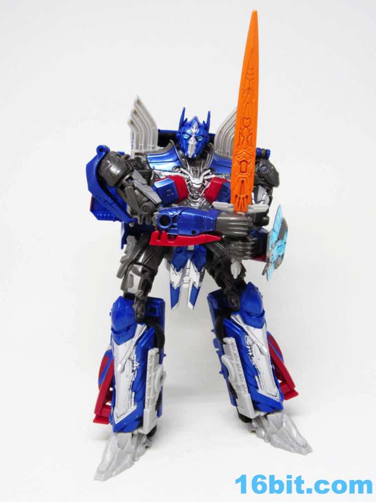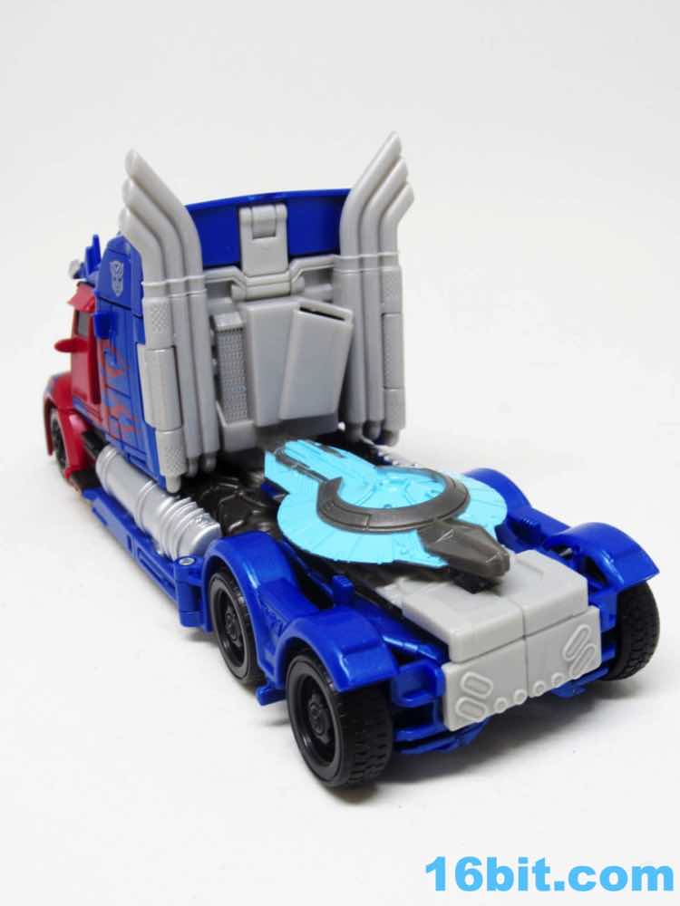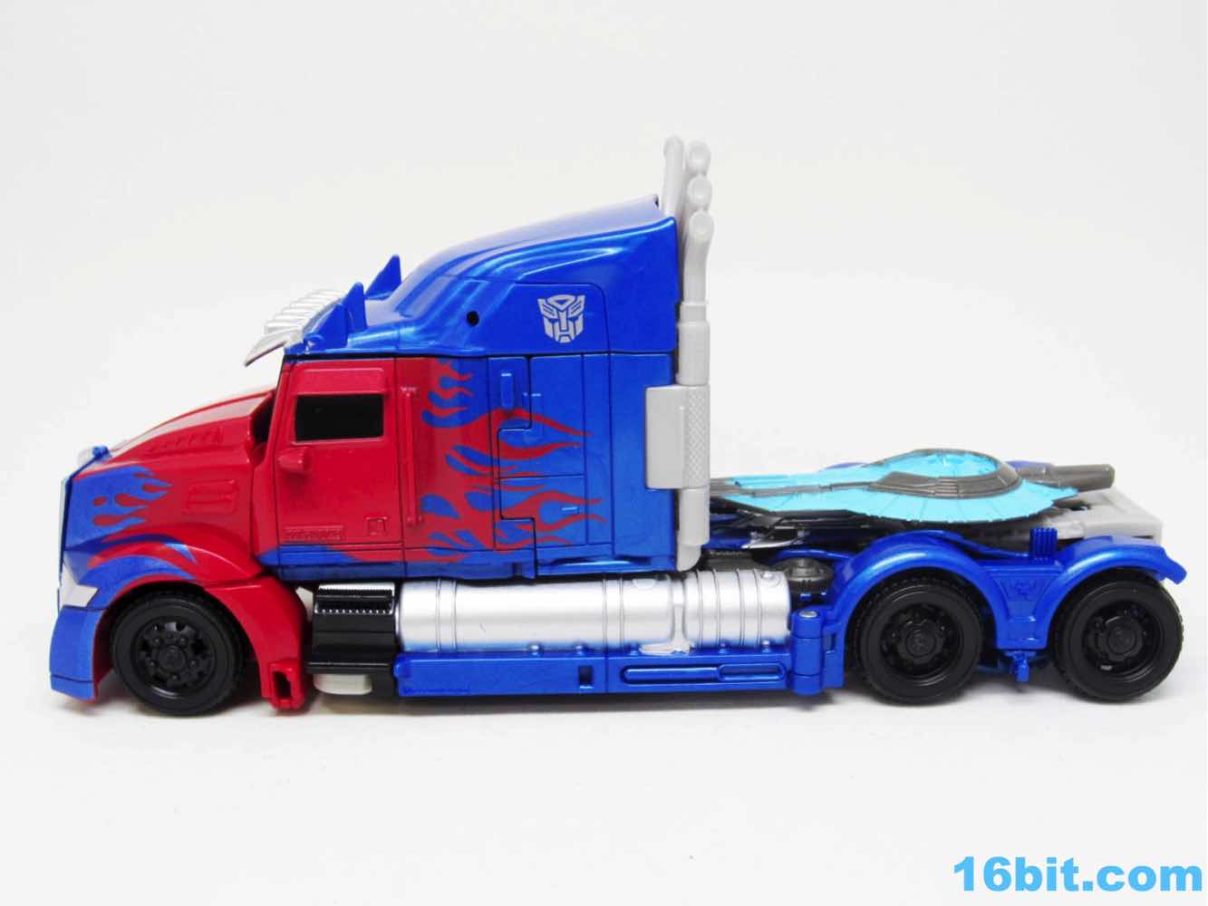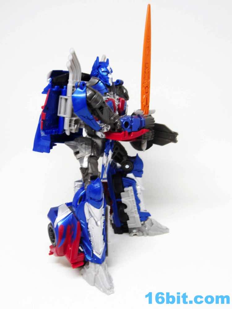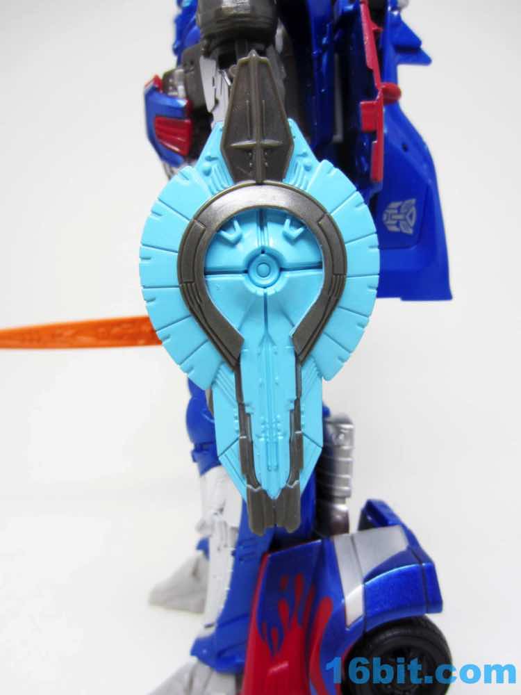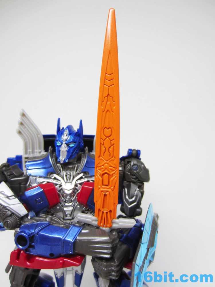 The truck mode ain't bad. It feels small, but it does a good job hiding most of the robot kibble. There's a bit of it around the trailer hitch and on the back of the cab - otherwise it does a good job looking like the Western Star truck from the films. Other die-cast metal ones may be more authentic, but they don't transform. I'd love it if the exhaust pipes were silver to match other parts of the car, but that is the price of love. Painted wheels would be nice too, but its obvious that the emphasis is on the robot mode's deco. You can plug the shield in the trailer hitch to hide some kibble, and the sword fits nicely in its undercarriage. They did a nice job here.