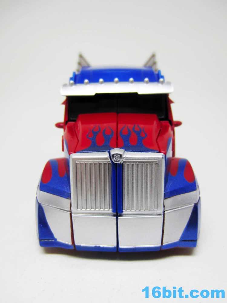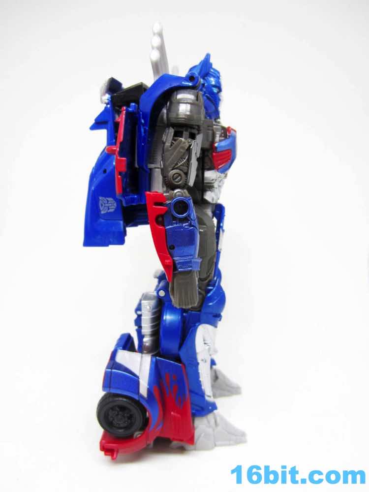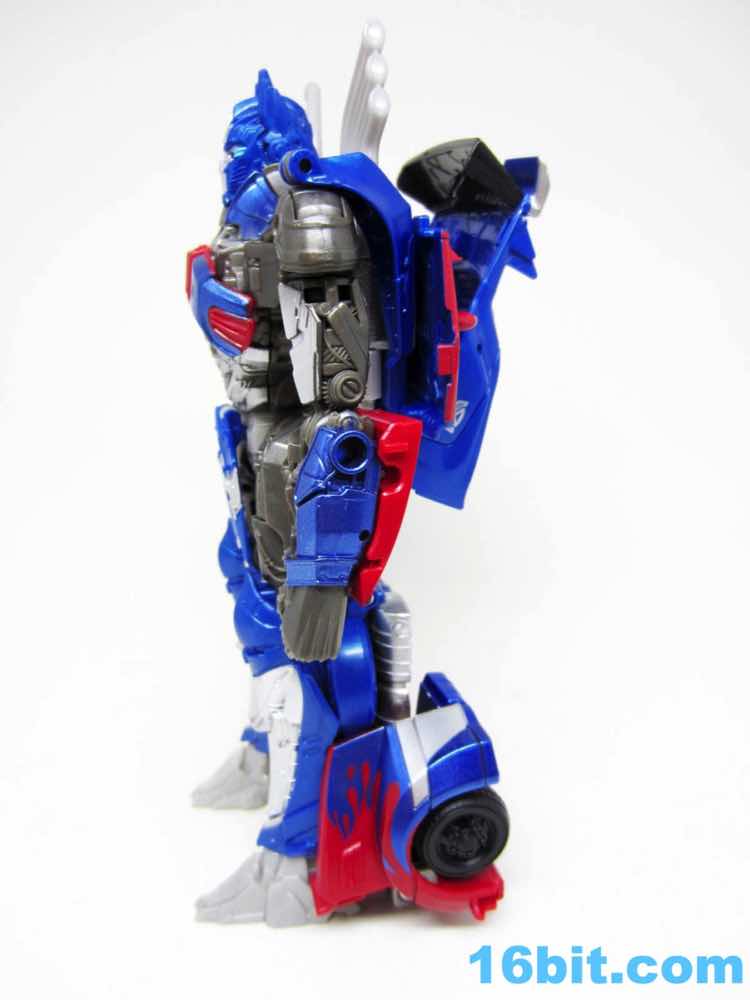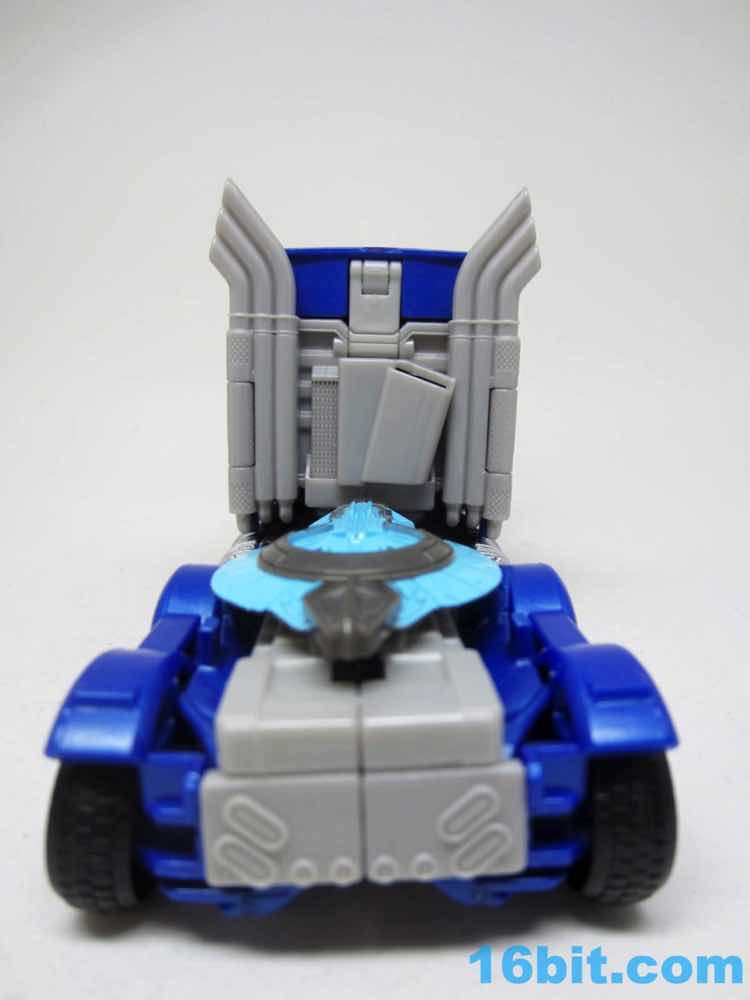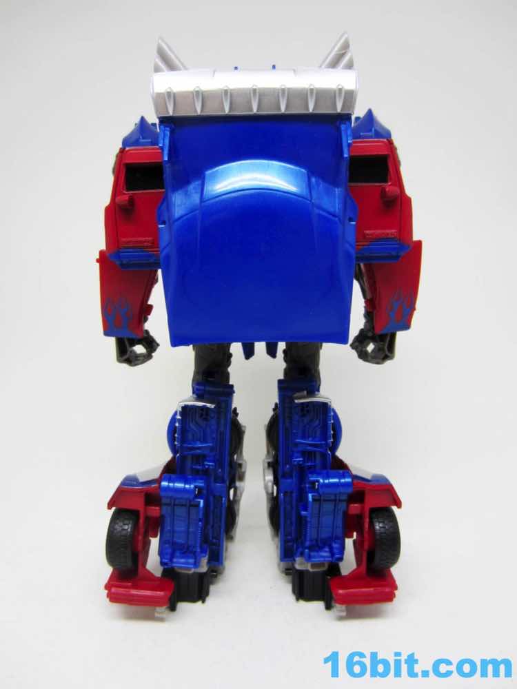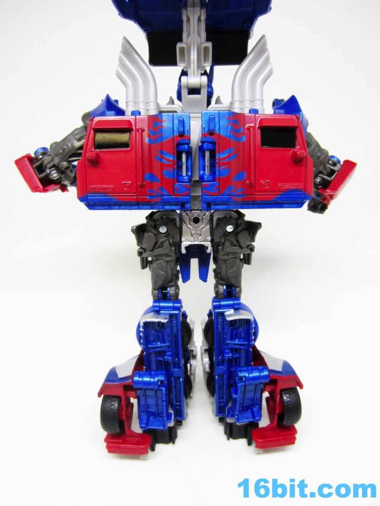 Transformation is something of a hassle - lots of bits need to be spun, rotated, and configured just-so in order to fit everything in the precise place. I got close - it seems a little off when I put it in truck mode, thanks in part to the amazing leg explosion required to make the bottom chunk of the truck. It's a real puzzle, with hard-to-read instructions that require squinting or a bright light. You'll be able to make it happen, but I strongly recommend using the instructions if you're the kind of person who says "now that can't be right" when you transform some of these toys. Optimus' blue and red chesticles are jointed - you have to move them to transform the toy. Who would have ever expected?