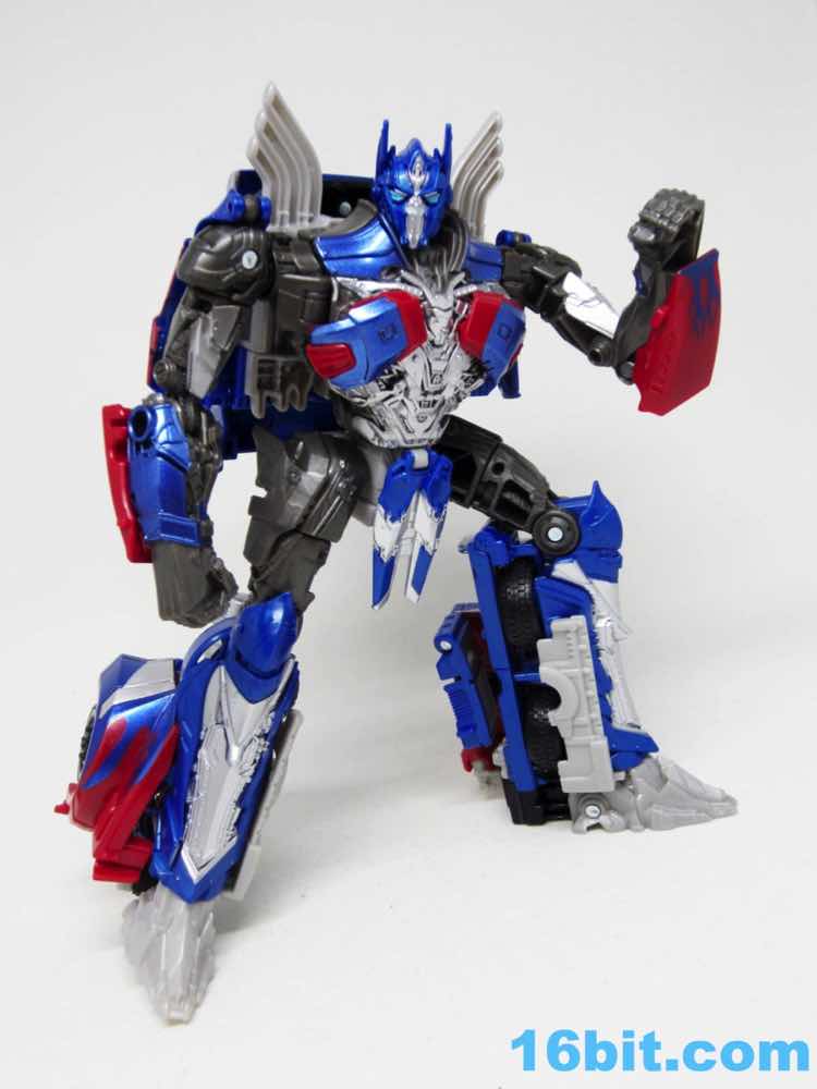 At 7 1/4-inches tall, this take on Optimus is bigger than the various other Voyager-class toys on my desk. With 18 joints he won't necessarily outclass them in terms of number of joints, but I got this one to double-grip a sword without a fight. Most normal action figures can't even do that, let alone Transformers toys. With the metallic paint in most of the places you'd want to see it, the toy has turned out largely quite nicely. The kibble comes loaded with pegs and tabs and slots to hold everything in place, so you're unlikely to see any flapping hoods or roofs on this guy. It's pretty sturdy and while not a perfect match for the on-screen model, it's a pretty great toy unto itself.