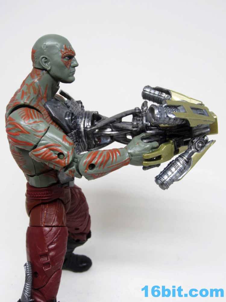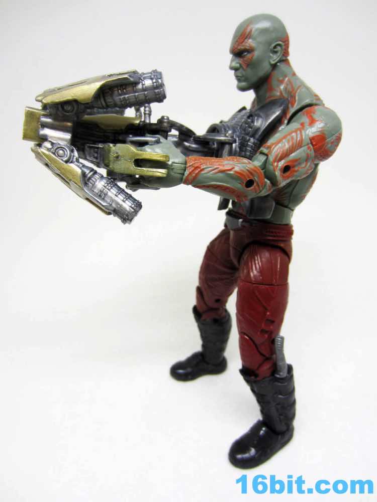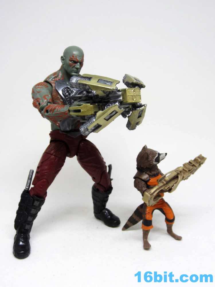 Rocket's rifle is pretty big and not exactly brimming in color - you can see some nice sculpted detail in a generally excessive weapon for such a small figure. Careful posing is necessary to avoid the perils of gravity. The giant belly blaster for Drax has a bit more detail going for it, and Drax' abundance of articulation makes it easier to keep standing. The bigger blaster has more paint and generally looks even more awesome - it's a pity Rocket can't use it, but I have to appreciate Hasbro tossing in an extra, large accessory that collectors of the line will enjoy. I'd actually love to see Hasbro do more of this - giving fans a reason to collect a whole line with bonus gear and special extras is a rewarding way to discourage cherry-picking.