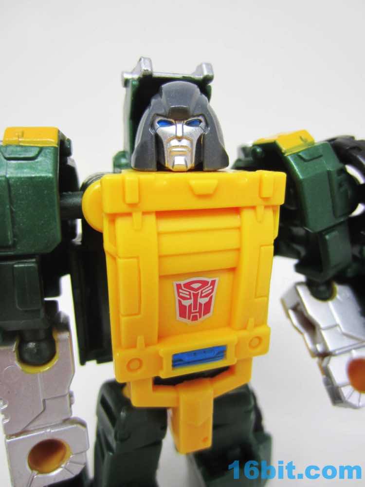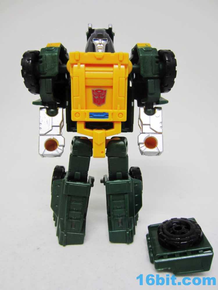 As always, the Legends-class Brawn clocks in at about 4-inches tall - but the head sculpt and deco are inspired by the cartoon. Hasbro generally teeters between the toy and the TV show for inspiration, but sometimes we see comic art or other inspirations creep in along the edges. With a dark grey helmet and silver face, it's a picture right out of 1984. The robot deco is closer in line to the original toy with a yellow chest and dark green vehicle shell. The original G1 toy had these weird bent spindly claw chrome arms, and while distinctive I never really cared for them. The new toy has big silver fists and forearms, just like on the TV show. A bright Autobot symbol in the middle of his body almost looks like a sticker, and the legs are basically just green plastic. It's good. It's not going to "wow" you, but there's nothing to disappoint a long-time fan with its 13 points of articulation. The one thing I don't like about it is that there's a panel with a spare tire that has to go somewhere. By default, it's pegged to the forearm. You can also mount it on the robot back. You can't pretend it's a weapon, and it'd be easy to lose. It's more of a liability here, I wish they could have made a panel that flipped out of the leg instead.