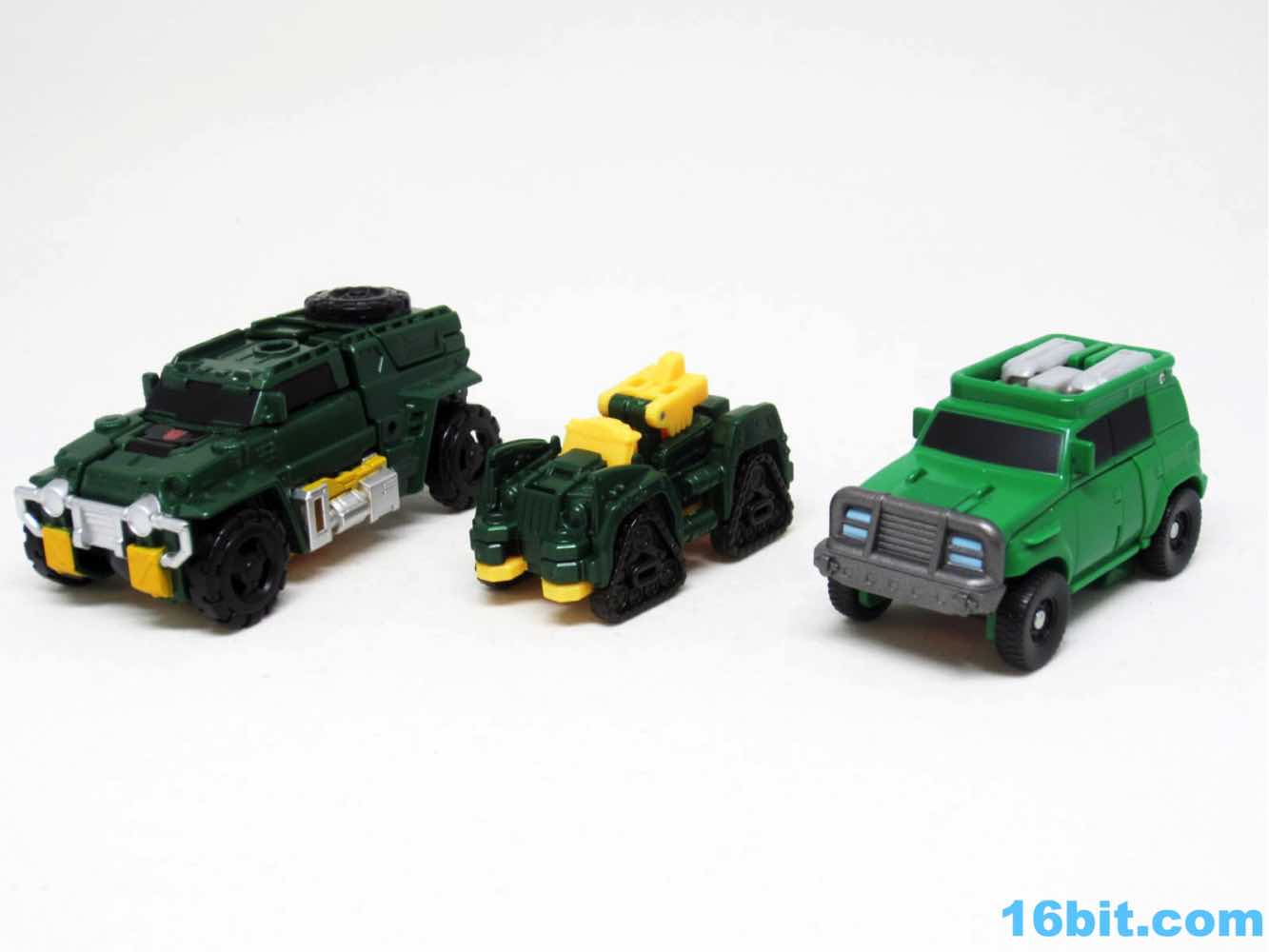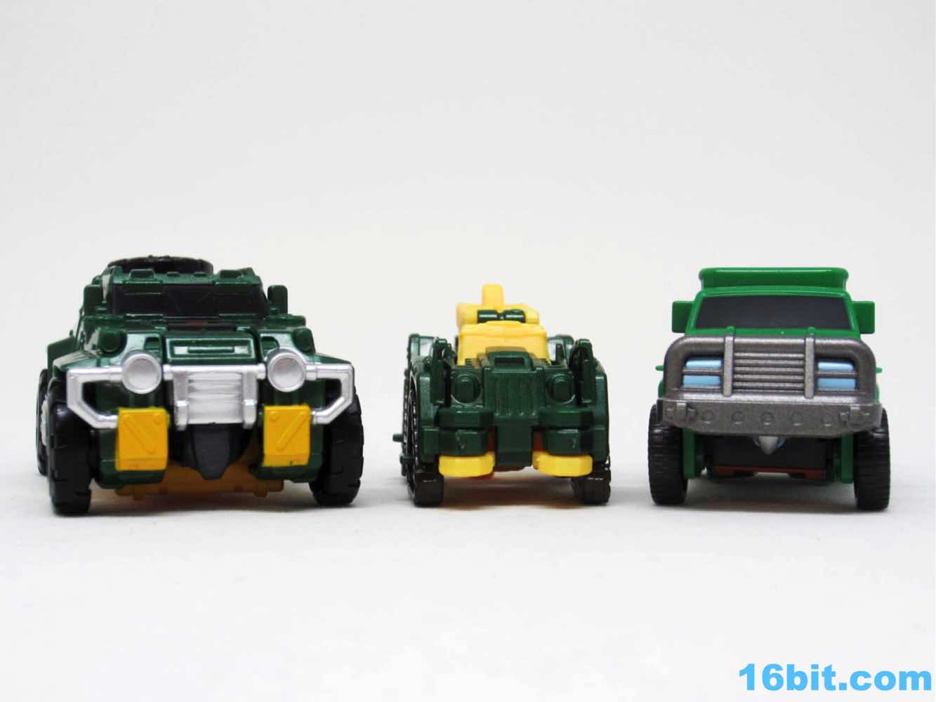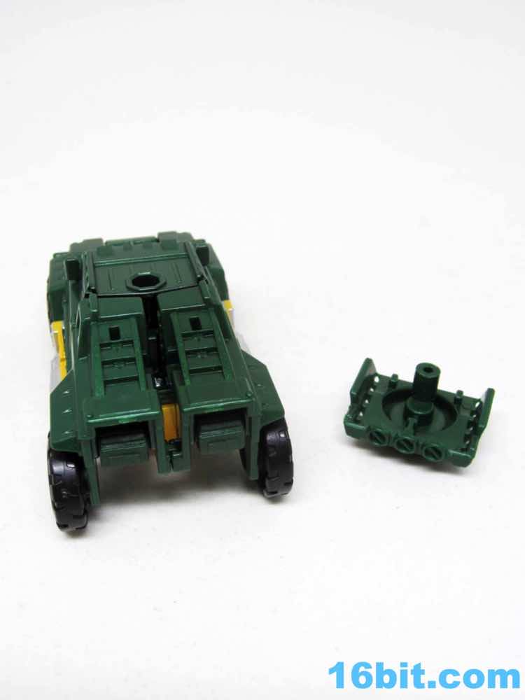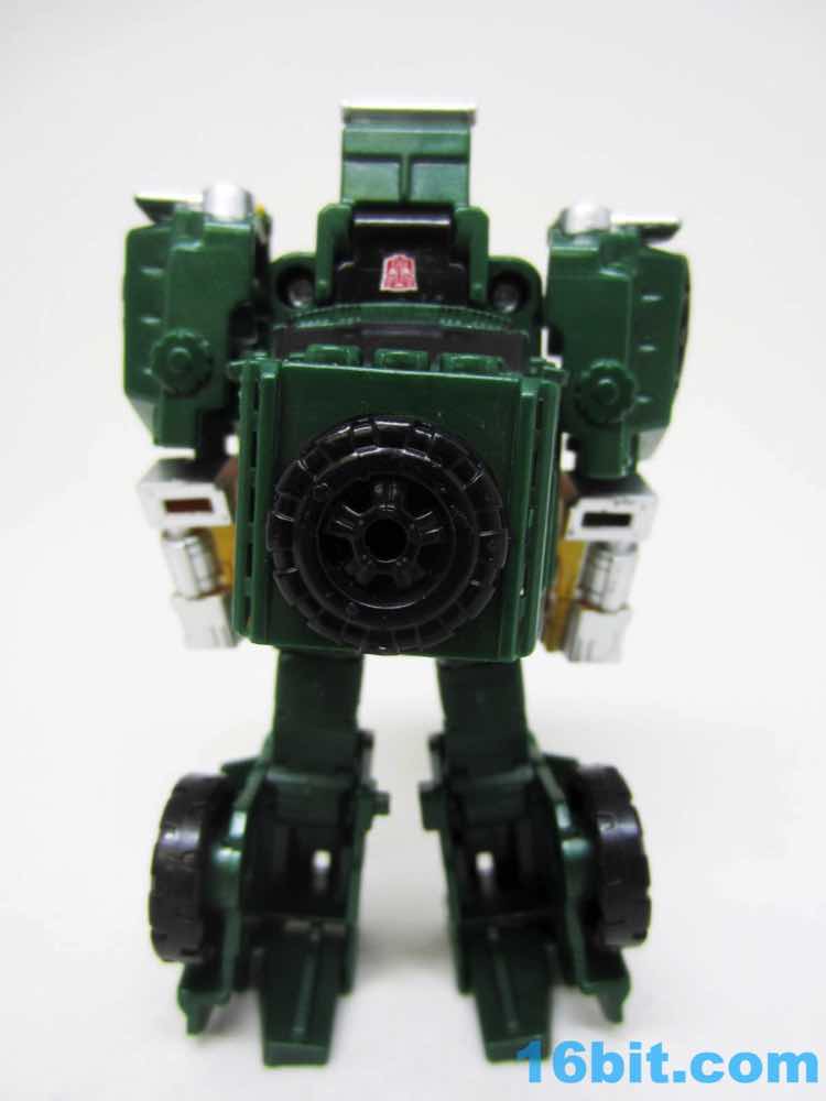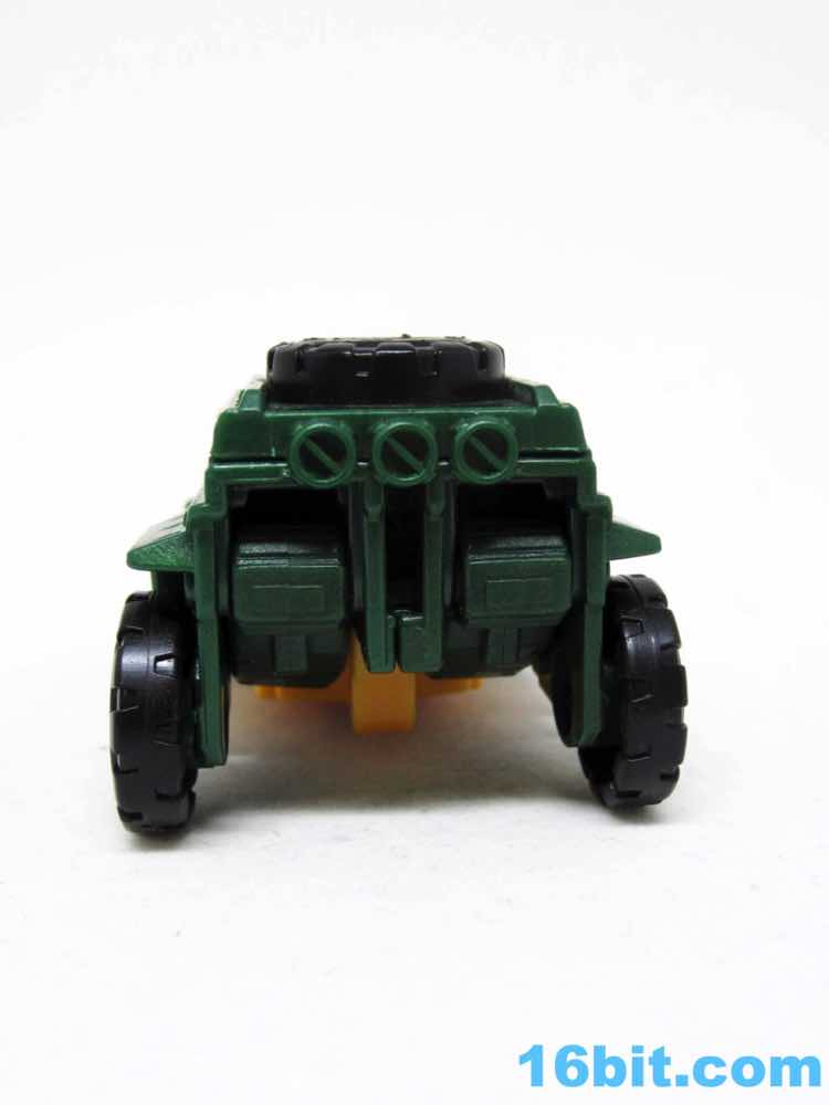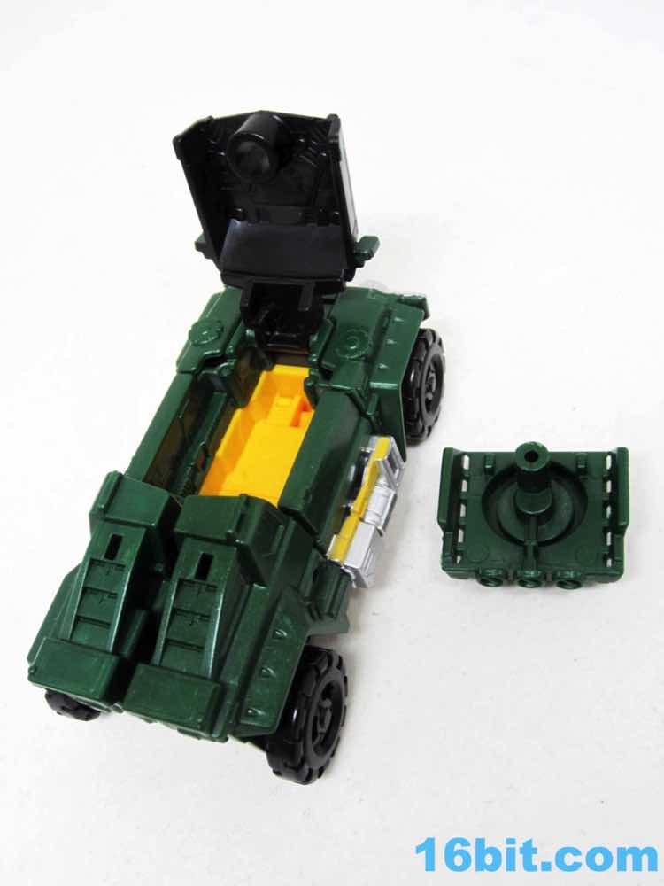 The vehicle mode is very good, but it's a departure from previous takes. The colors are right and the basic elements are all there, but it's not quite as boxy or tall as the original toy. The weird spare tire panel fits snuggly over the back of the off-road vehicle, and if I didn't know better I'd say this toy could potentially be a stealth pre-sculpt for a new Swerve, Outback, or someone else - there's enough of a formed, different vehicle under the panel. The wheels spin adequately, unpainted and as good as wheels can get on a toy of this size these days. A couple of boxes are painted, as are some silver bits and most of the windows. I'm willing to bet someone ran the abacus and decided against painting the window parts that wound up on the feet.