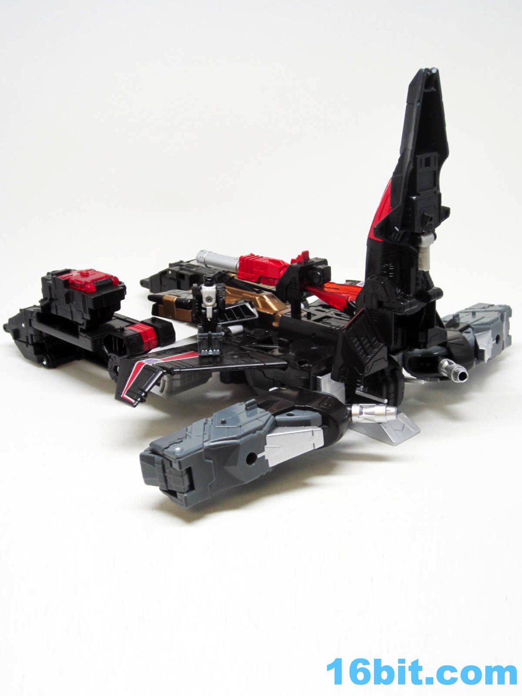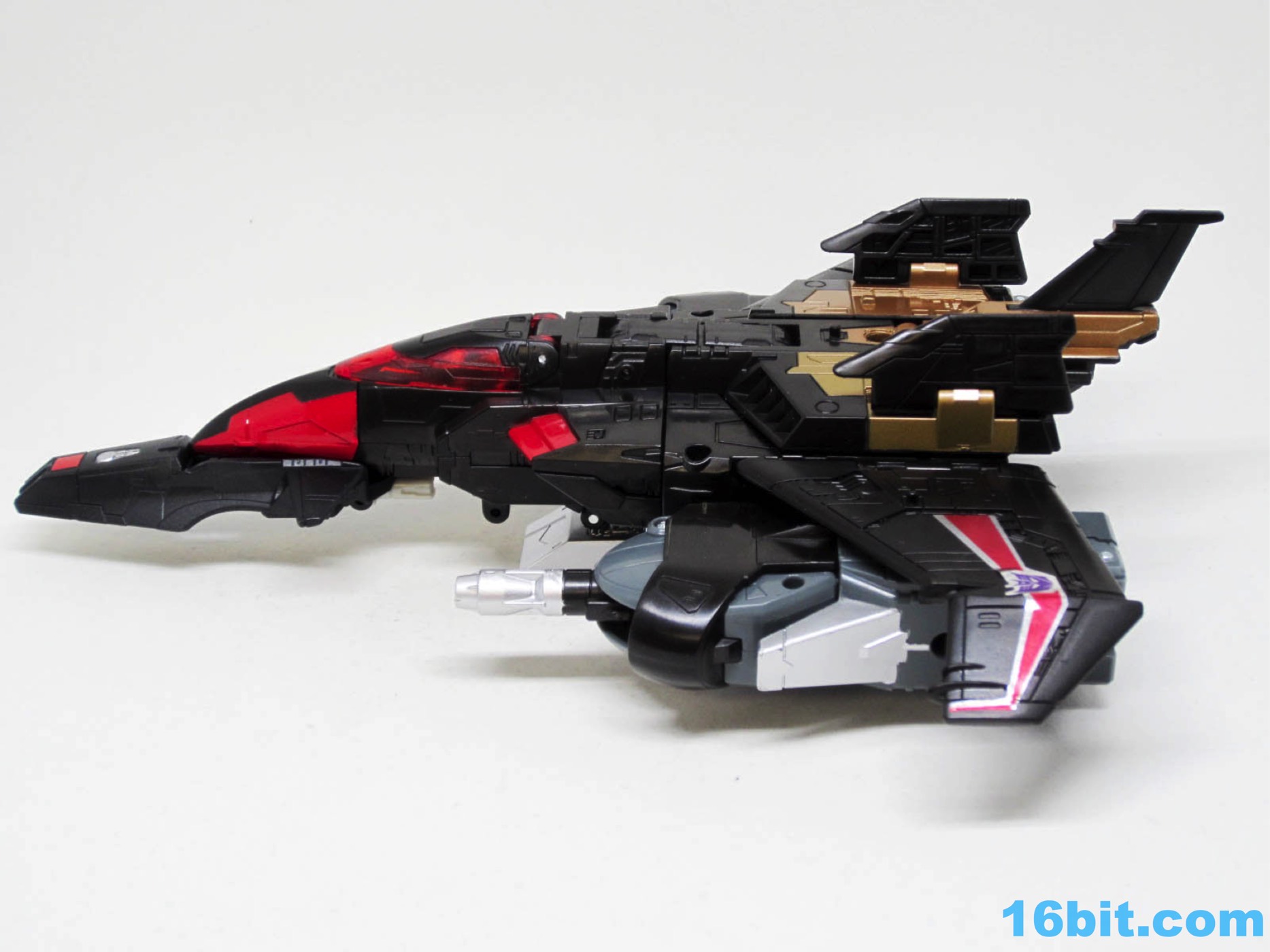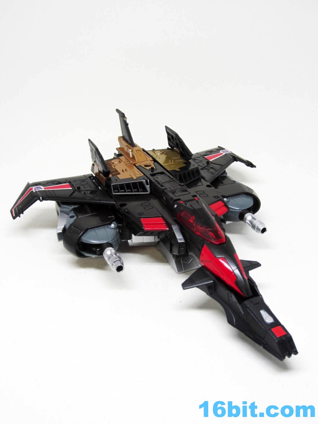 Not content to have one vehicle mode mode, Sky Shadow has two. One is clearly the tank needed to make up Overlord in a few months. The other is a good recreation of the jet mode of the original Black Shadow toy, and surprisingly the two can merge via a small clip. Why would you want to do this? I have no idea, but you can, and I'll never turn down my nose at any new functionality in my toys. I collect Star Wars, so I know all about toys that don't actually do anything but look cool. Having a jet that can pick up a tank and fly around with it is the kind of creative kick a toy like this needs. With Blaster or Soundwave, I have non-functional stereo equipment. Powermaster Optimus Prime's truck mode can store smaller cars inside, and that's nice. Six Show has five alt modes - many of which are good - so seeing Sky Shadow be able to be more than just a robot that turns into something was a lot of fun.