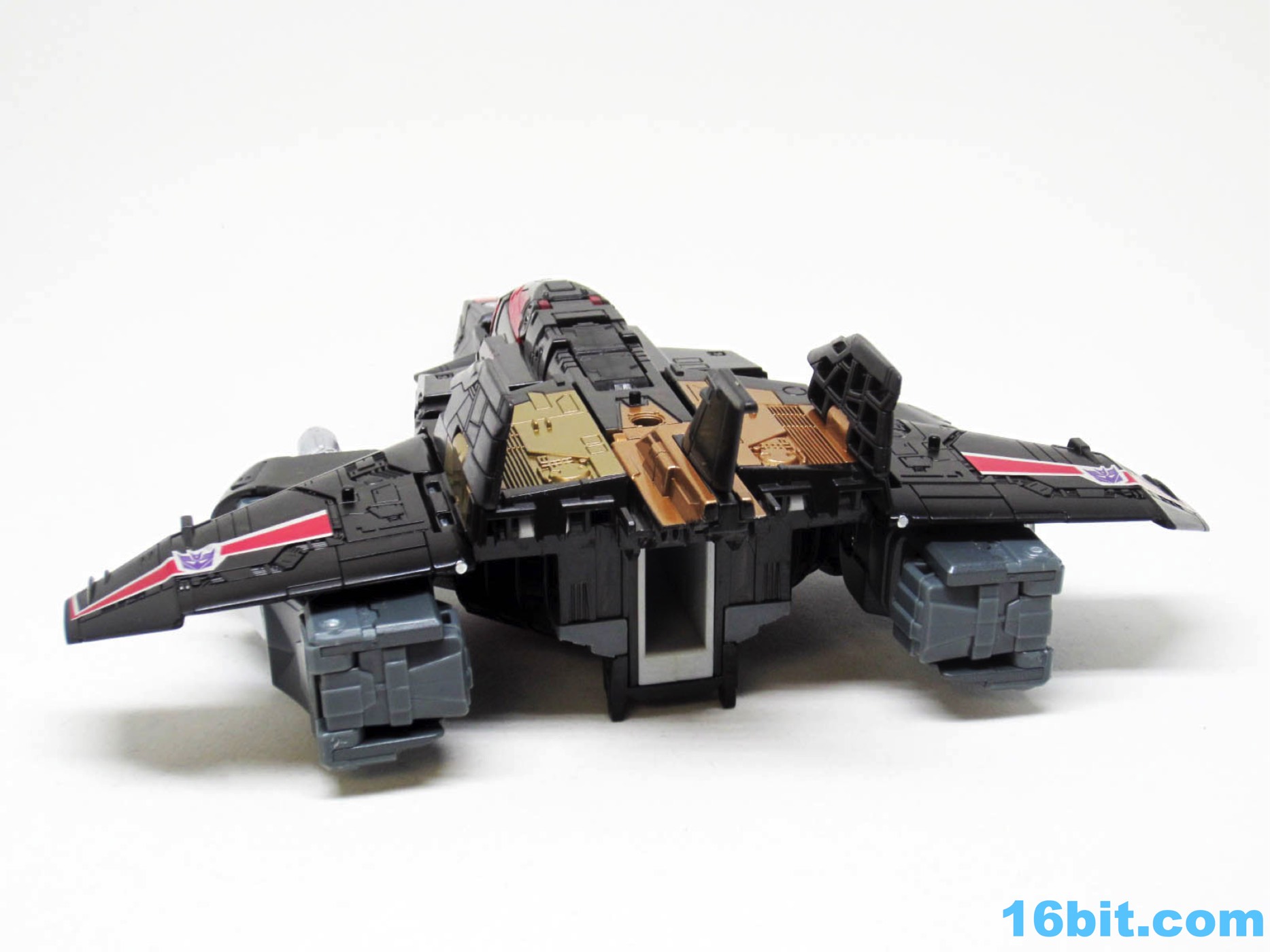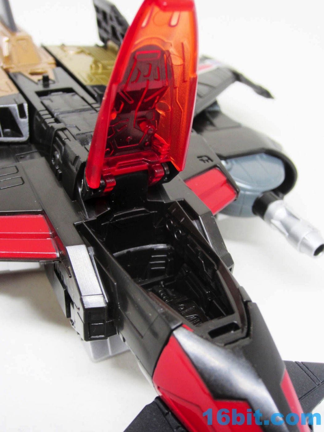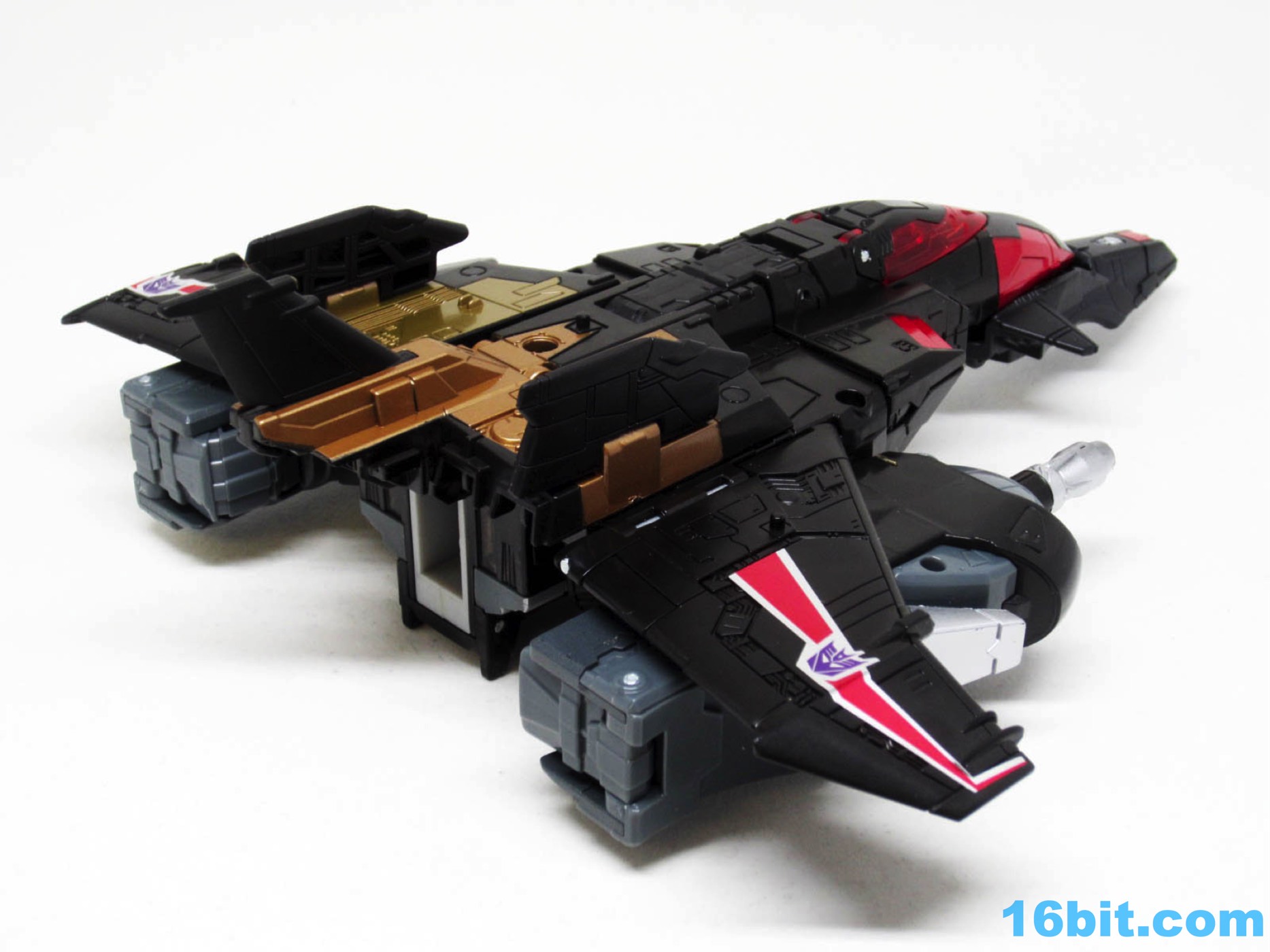 Not content to have one vehicle mode mode, Sky Shadow has two. One is clearly the tank needed to make up Overlord in a few months. The other is a good recreation of the jet mode of the original Black Shadow toy, and surprisingly the two can merge via a small clip. Why would you want to do this? I have no idea, but you can, and I'll never turn down my nose at any new functionality in my toys. I collect Star Wars, so I know all about toys that don't actually do anything but look cool. Having a jet that can pick up a tank and fly around with it is the kind of creative kick a toy like this needs. With Blaster or Soundwave, I have non-functional stereo equipment. Powermaster Optimus Prime's truck mode can store smaller cars inside, and that's nice. Six Show has five alt modes - many of which are good - so seeing Sky Shadow be able to be more than just a robot that turns into something was a lot of fun.