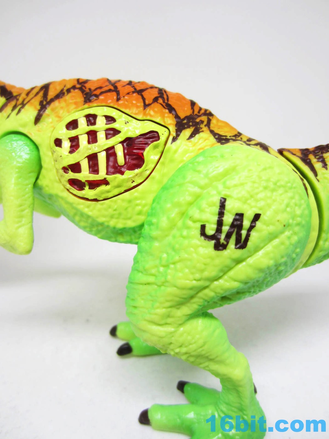The main gimmick on the toy is poison toxic yellow phlegm in rocket form. It fits in his open mouth and shoots a short distance when you move his tail. It works. It looks goofy. Your kids, they're going to love it. If that weren't enough there's a light-up open wound where if you push on his meat and bones, it screams. I have the same functionality.