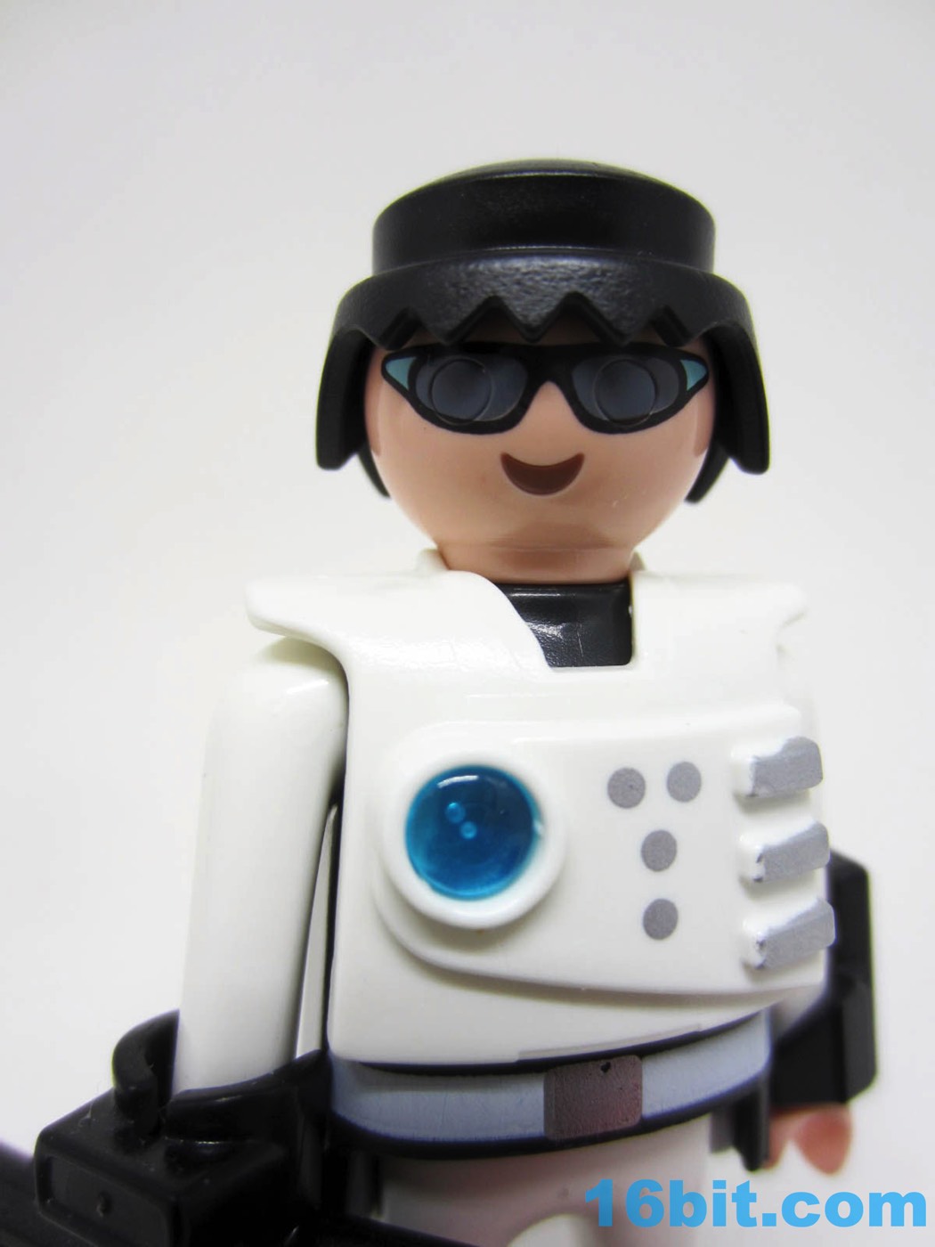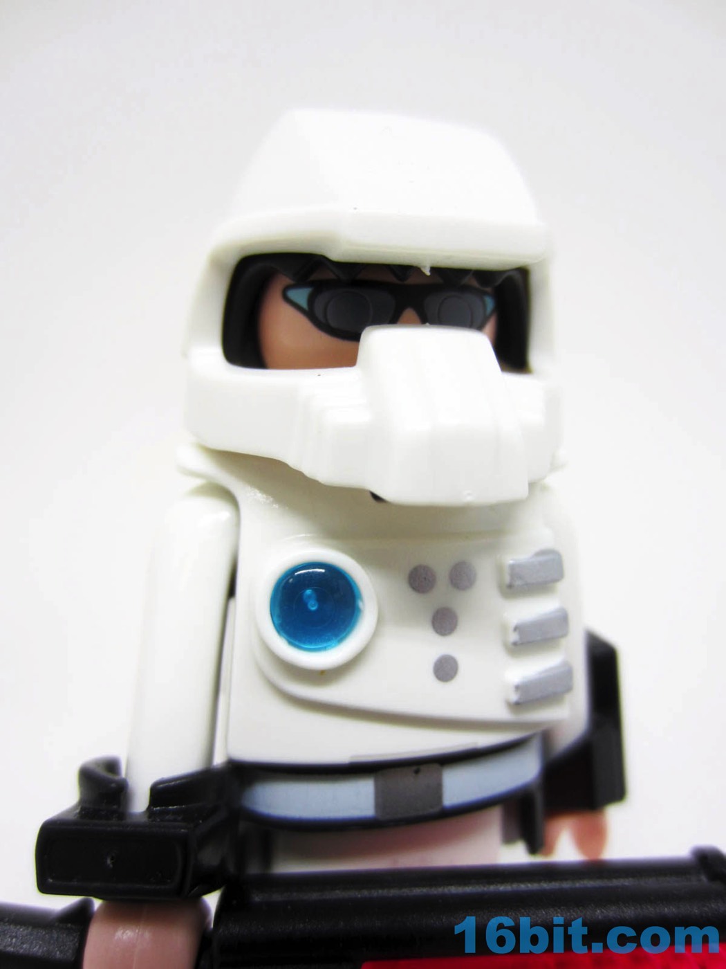 The figure requires assembly, and it's a gem. Also, it has a gem on the chest armor - the clear blue dot looks cool. Each wrist has a communications unit, and a sticker sheet helps add to them with some fake buttons, while actual buttons are painted on the chest. A belt was also included in his paint apps, but what I dug the most were the glasses printed directly on the figure's face and over his eyeballs. This could make the figure useful for spare parts, particularly quasi-future people and skiiers.
