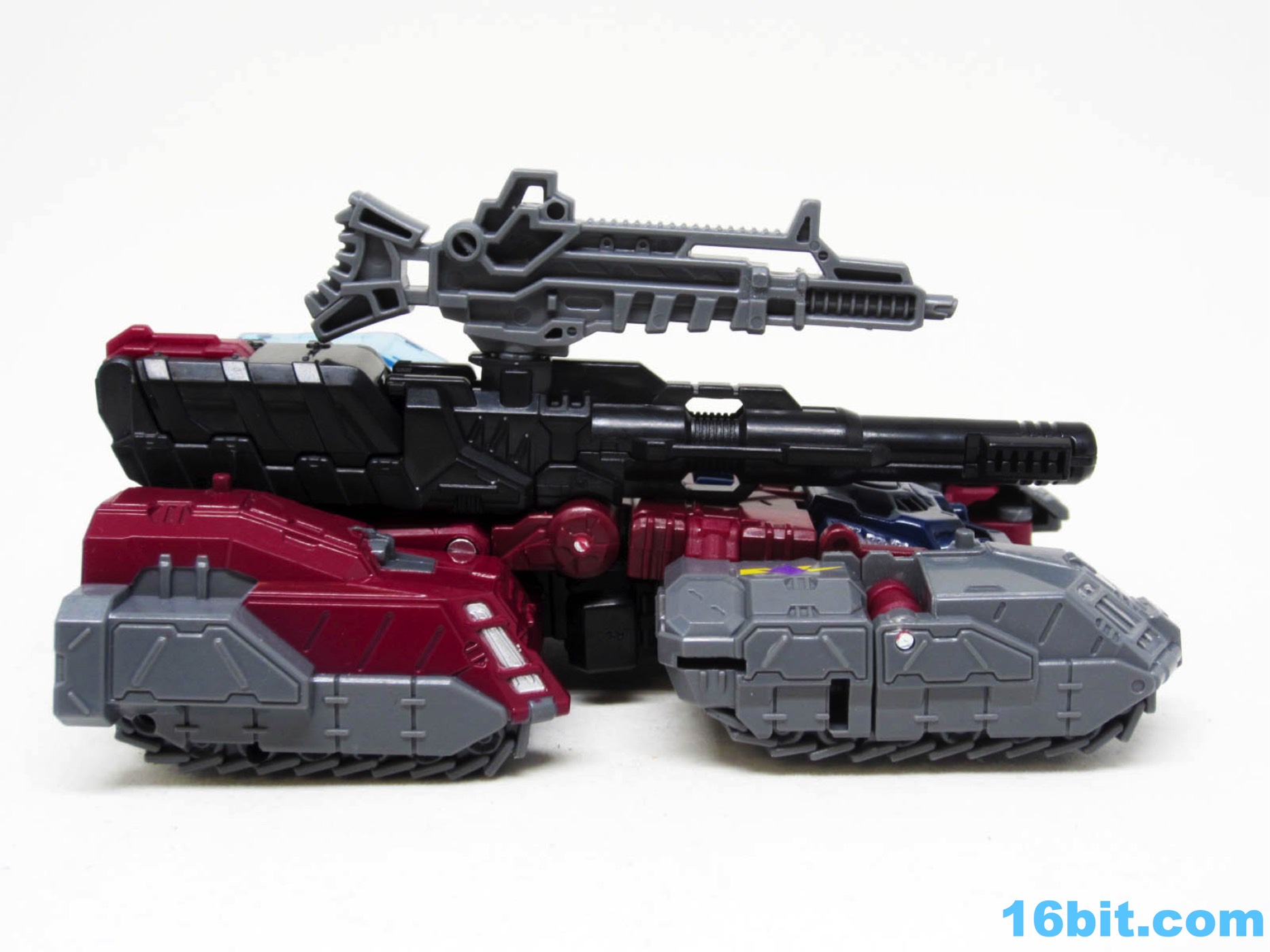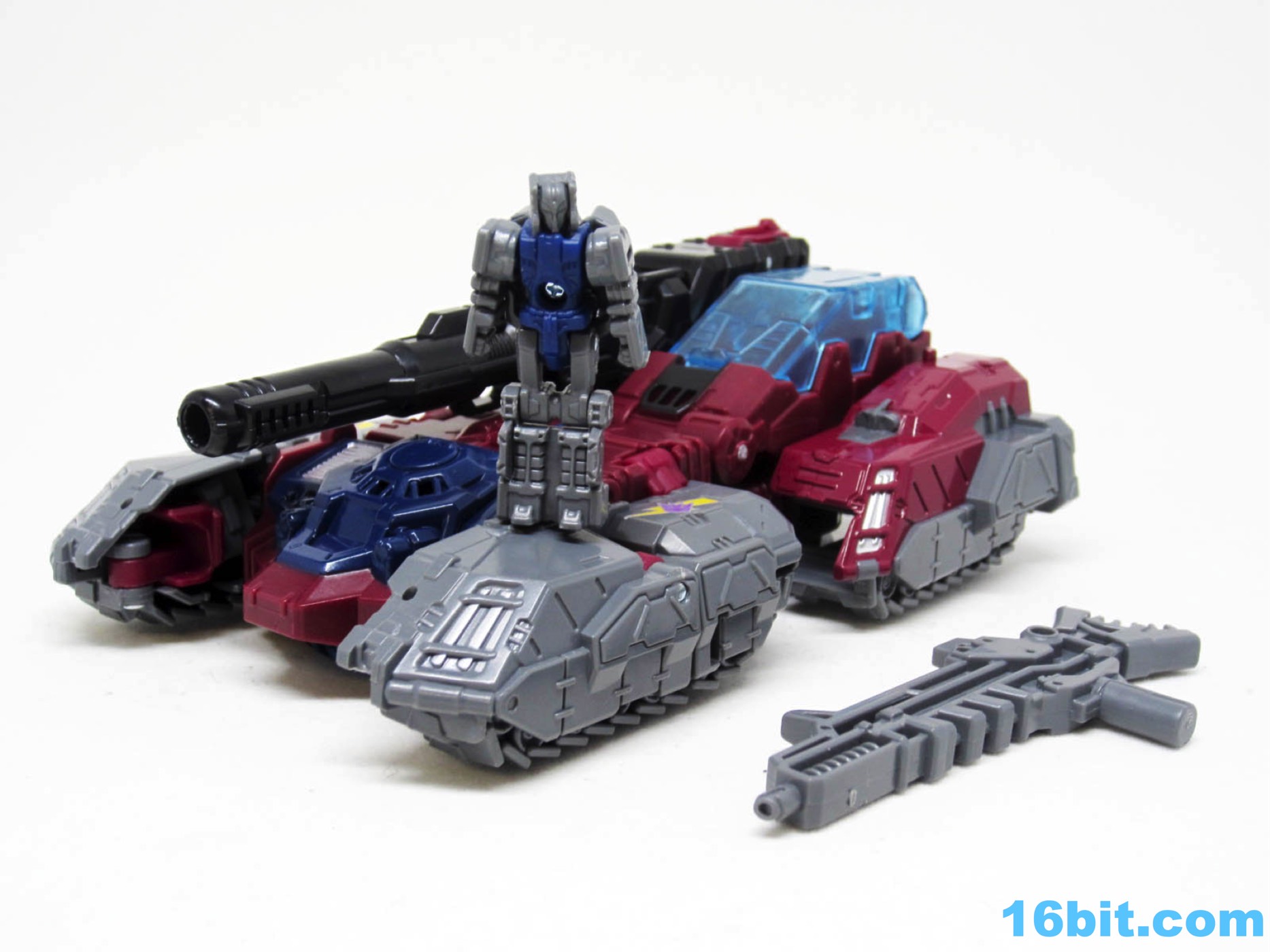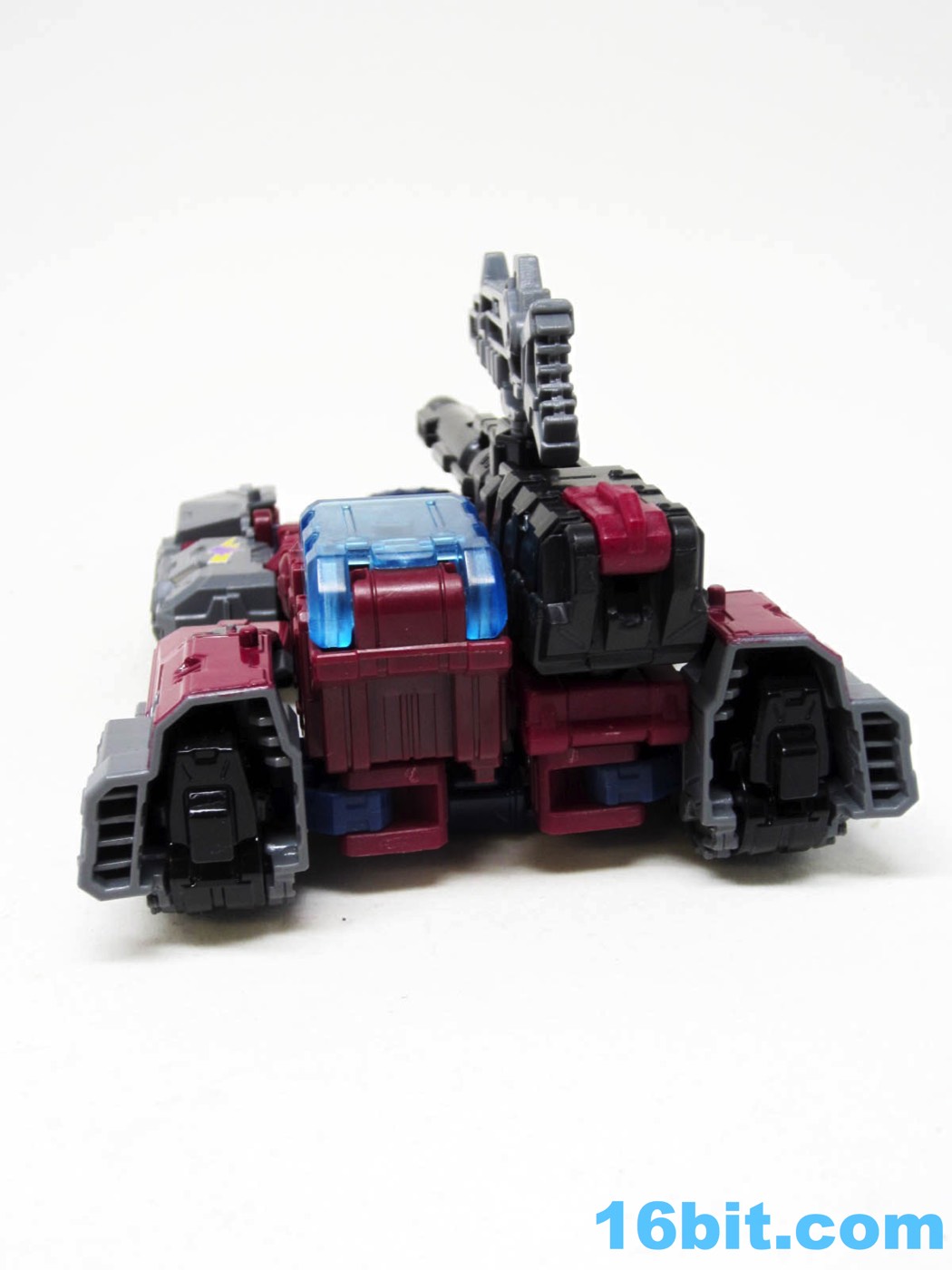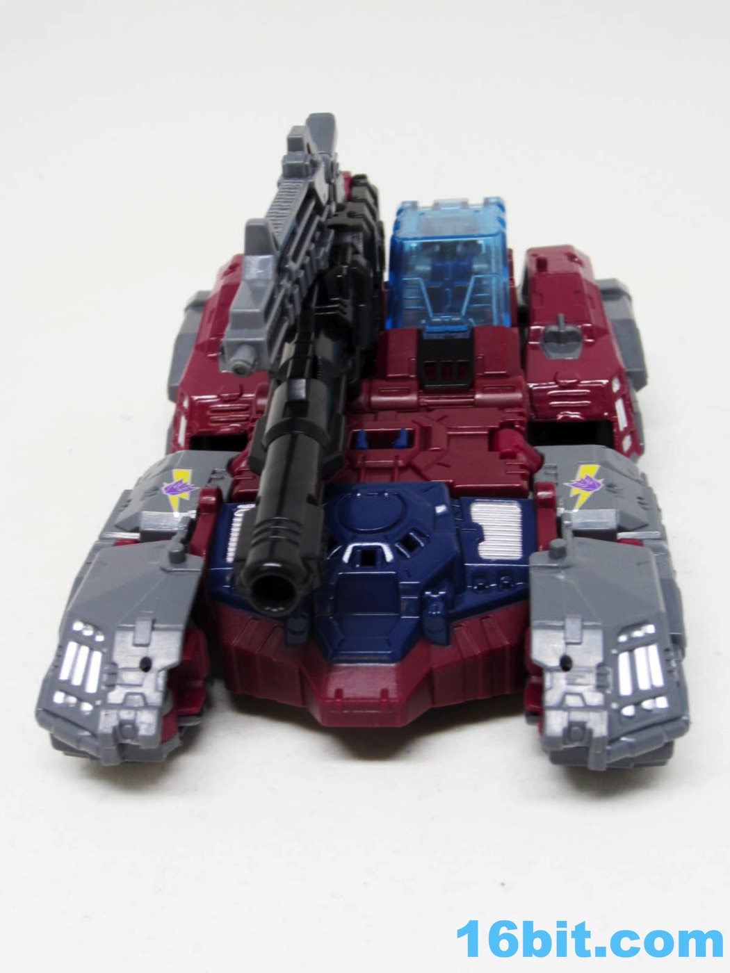 The tank mode is Hardhead but better - at least, I like it better. There are Decepticon symbols in lightning bolts, plus lots of maroon paint to really bring out some life in the already lively tank moe. Silver panels were also added, making this one significantly sharper than what we got with Hardhead. The blue on the hood of the tank is also quite nice. The rolling wheels on the bottom were cast in clear blue, and the large roller on my sample was partially knocked out when I opened it - so be careful, you don't want to lose it especially before you transform it for the first time.