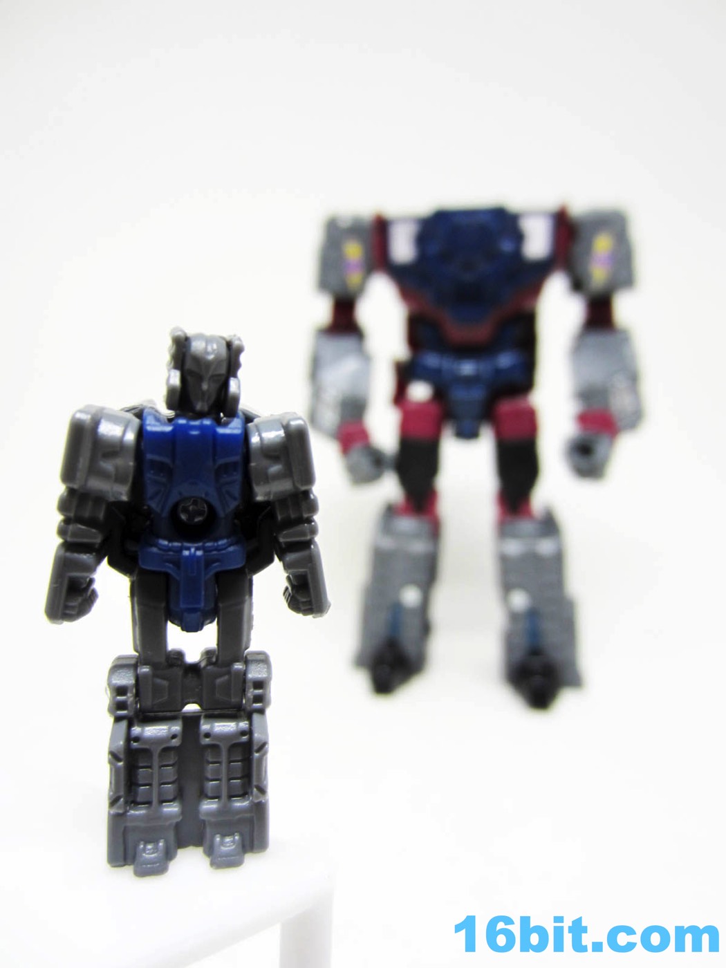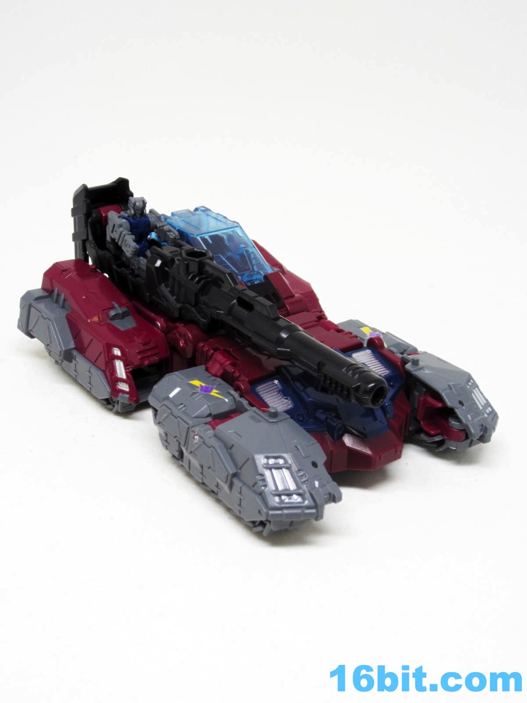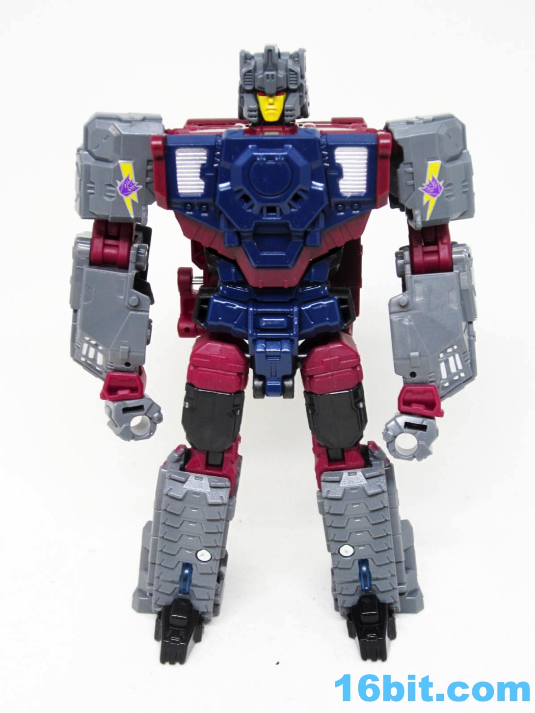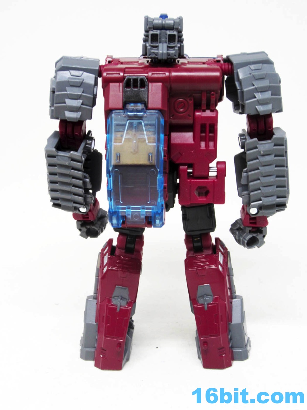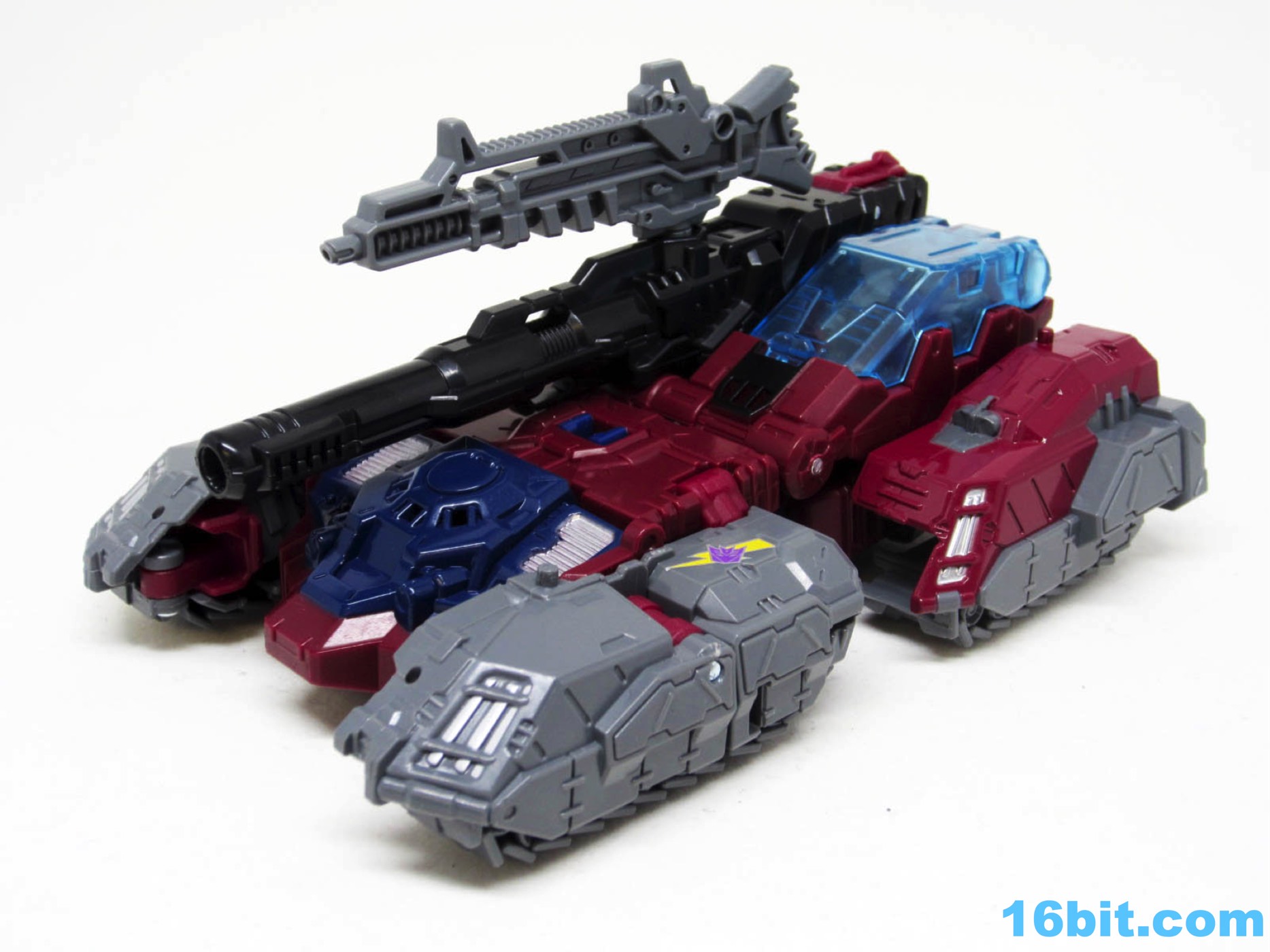 The tank mode is Hardhead but better - at least, I like it better. There are Decepticon symbols in lightning bolts, plus lots of maroon paint to really bring out some life in the already lively tank moe. Silver panels were also added, making this one significantly sharper than what we got with Hardhead. The blue on the hood of the tank is also quite nice. The rolling wheels on the bottom were cast in clear blue, and the large roller on my sample was partially knocked out when I opened it - so be careful, you don't want to lose it especially before you transform it for the first time.