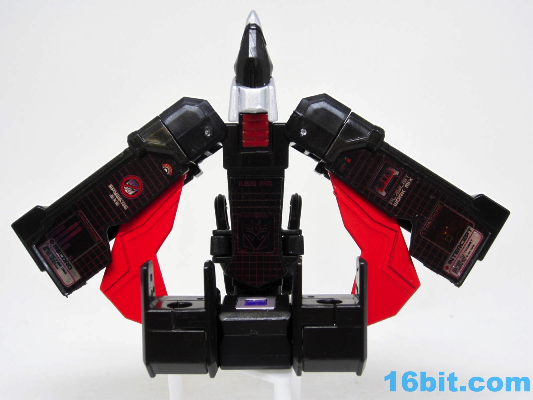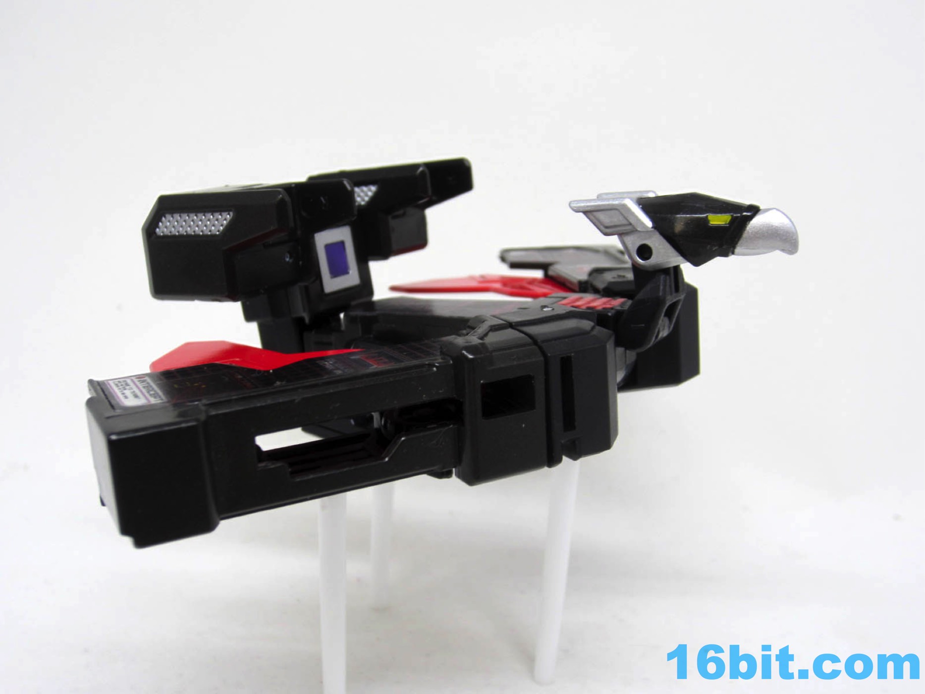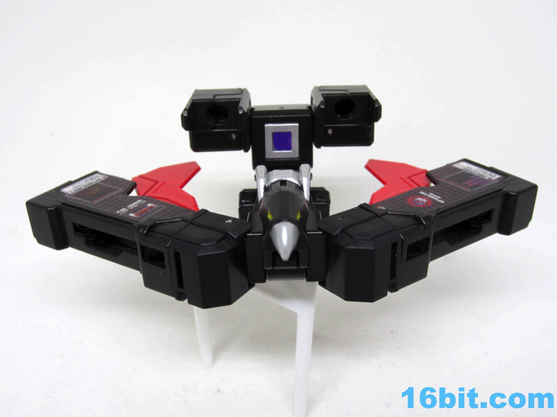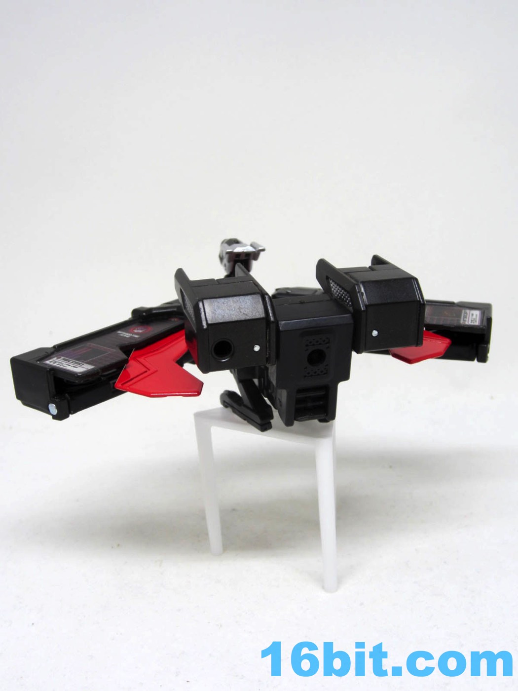The toy is packaged as a robot bird - and a pretty decent one. The beak is now silver, rather than black like the original or orange like Buzzsaw in 2015. The almost entirely black figure has some red highlights which recall the original, which in and of itself wasn't a terribly distinctive toy. If you had Soundwave you definitely had (and/or lost) Buzzsaw. Maybe you had Laserbeak - he was sold with Frenzy separately. Frenzy hasn't made it out yet, but I digress - the bird has a fold-out metal feather thing on his wings, and the head and neck are nicely jointed. He has tiny and stable feet which work well, and he can perch on Soundwave's arm thanks to the sturdy ratcheting joints.
