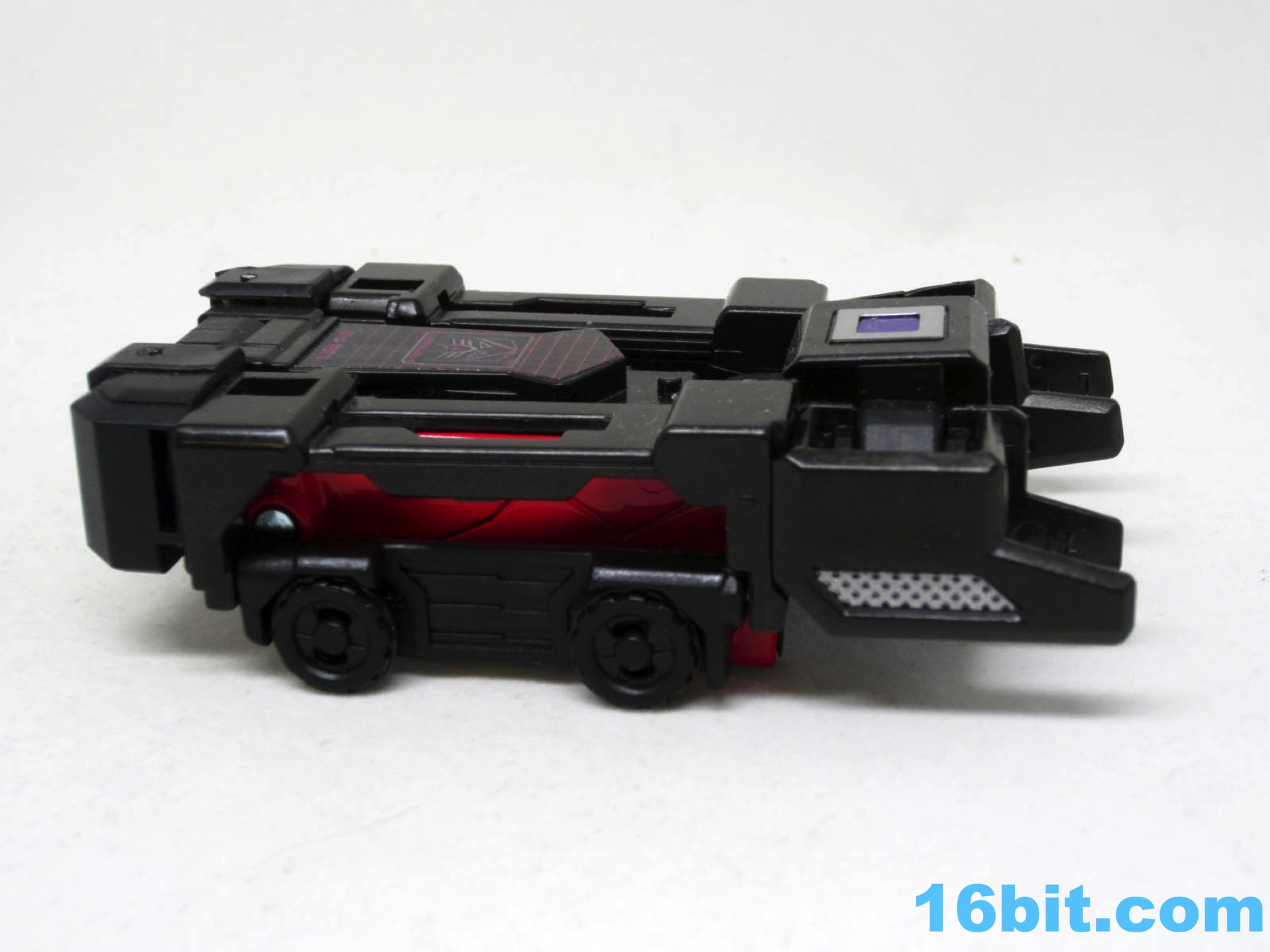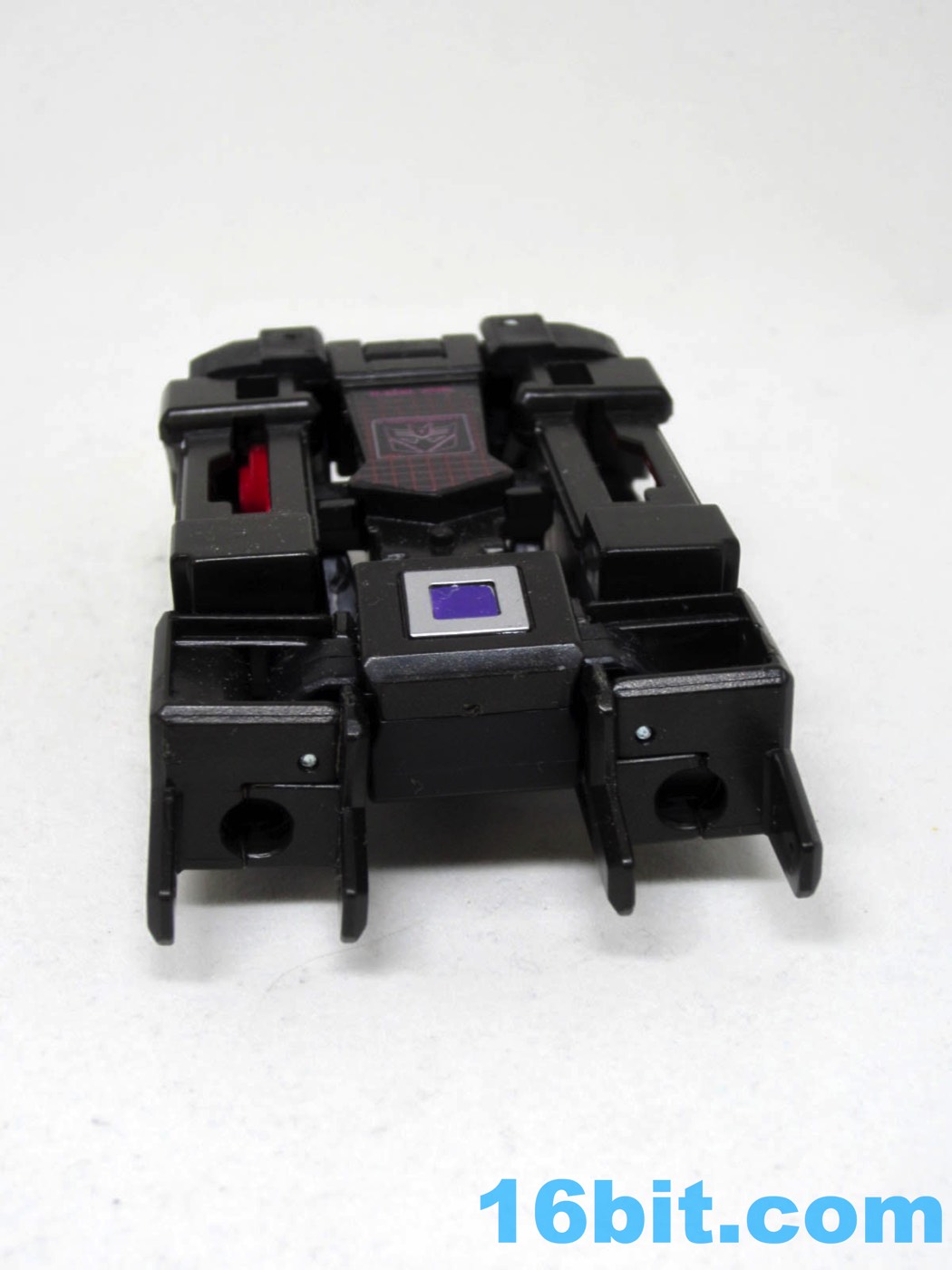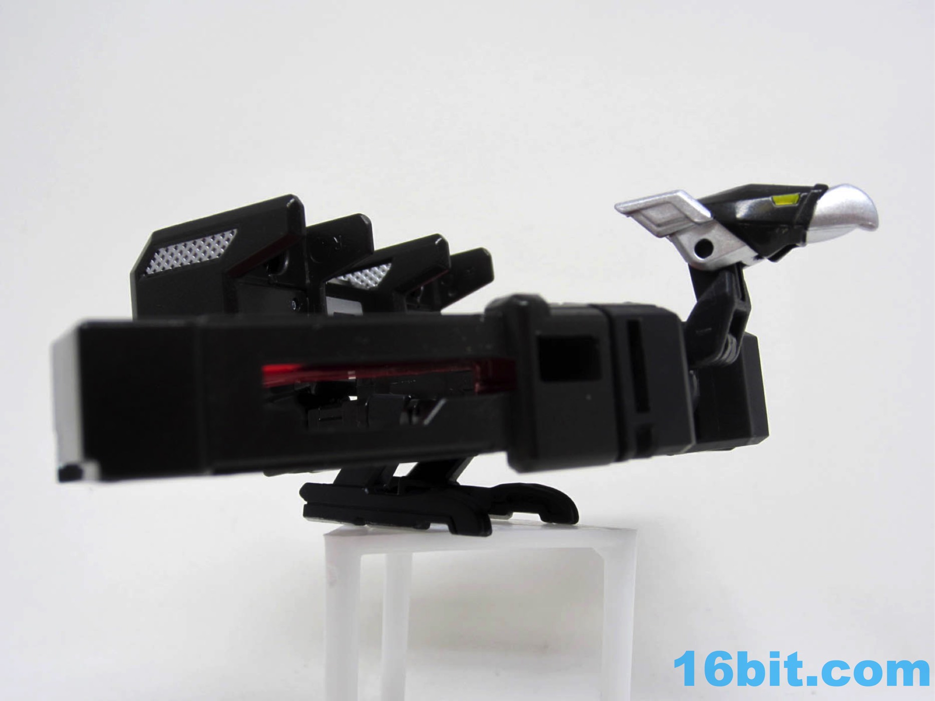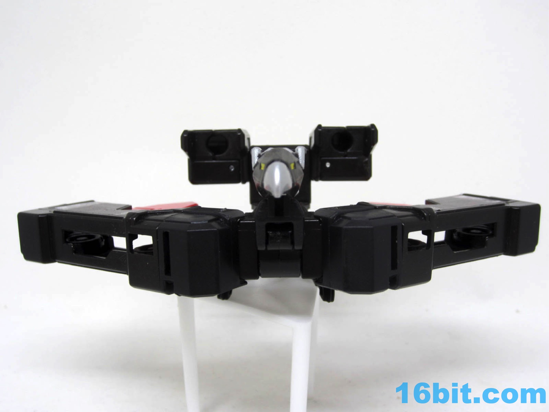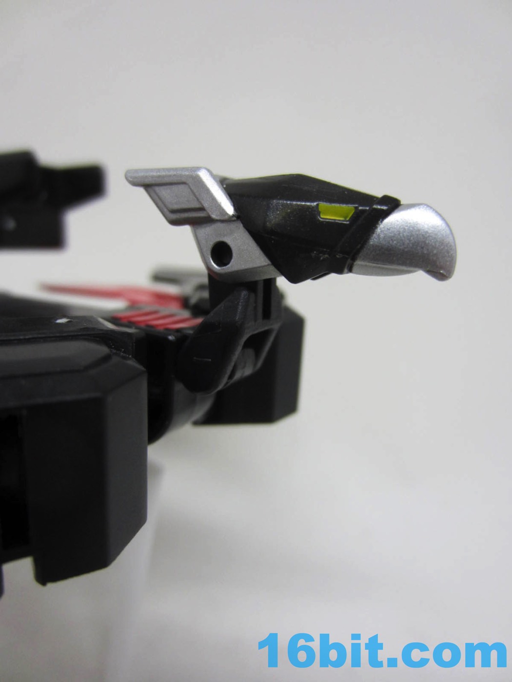 The toy is packaged as a robot bird - and a pretty decent one. The beak is now silver, rather than black like the original or orange like Buzzsaw in 2015. The almost entirely black figure has some red highlights which recall the original, which in and of itself wasn't a terribly distinctive toy. If you had Soundwave you definitely had (and/or lost) Buzzsaw. Maybe you had Laserbeak - he was sold with Frenzy separately. Frenzy hasn't made it out yet, but I digress - the bird has a fold-out metal feather thing on his wings, and the head and neck are nicely jointed. He has tiny and stable feet which work well, and he can perch on Soundwave's arm thanks to the sturdy ratcheting joints.