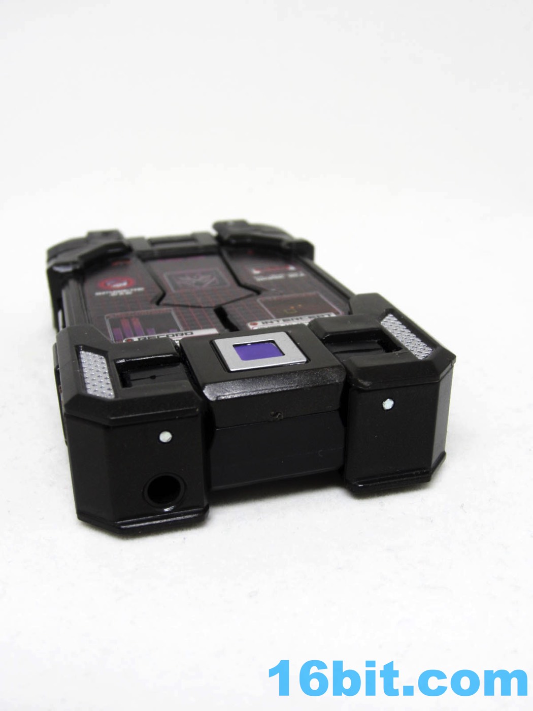 Next up, the smart phone. I love the stickers - it reminds me of the original packaging with the purple grids and whatnot. The smart device is about scaled to Fortress Maximus and Metroplex, functionally a brick that does nothing but look like a phone. It's really clever - but not as clever as the goofiest and most fun extra, a 3.5mm headphone jack. You can really plug in earbuds if you want to pretend this is a working device - it's a tight fit, but it fits! The device also fits in the chests of Soundwave or Blaster, and can be held easily in the hands of the large Titan-class Autobots.