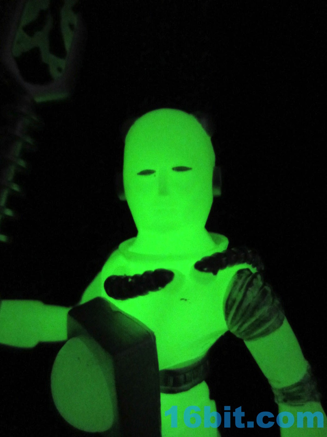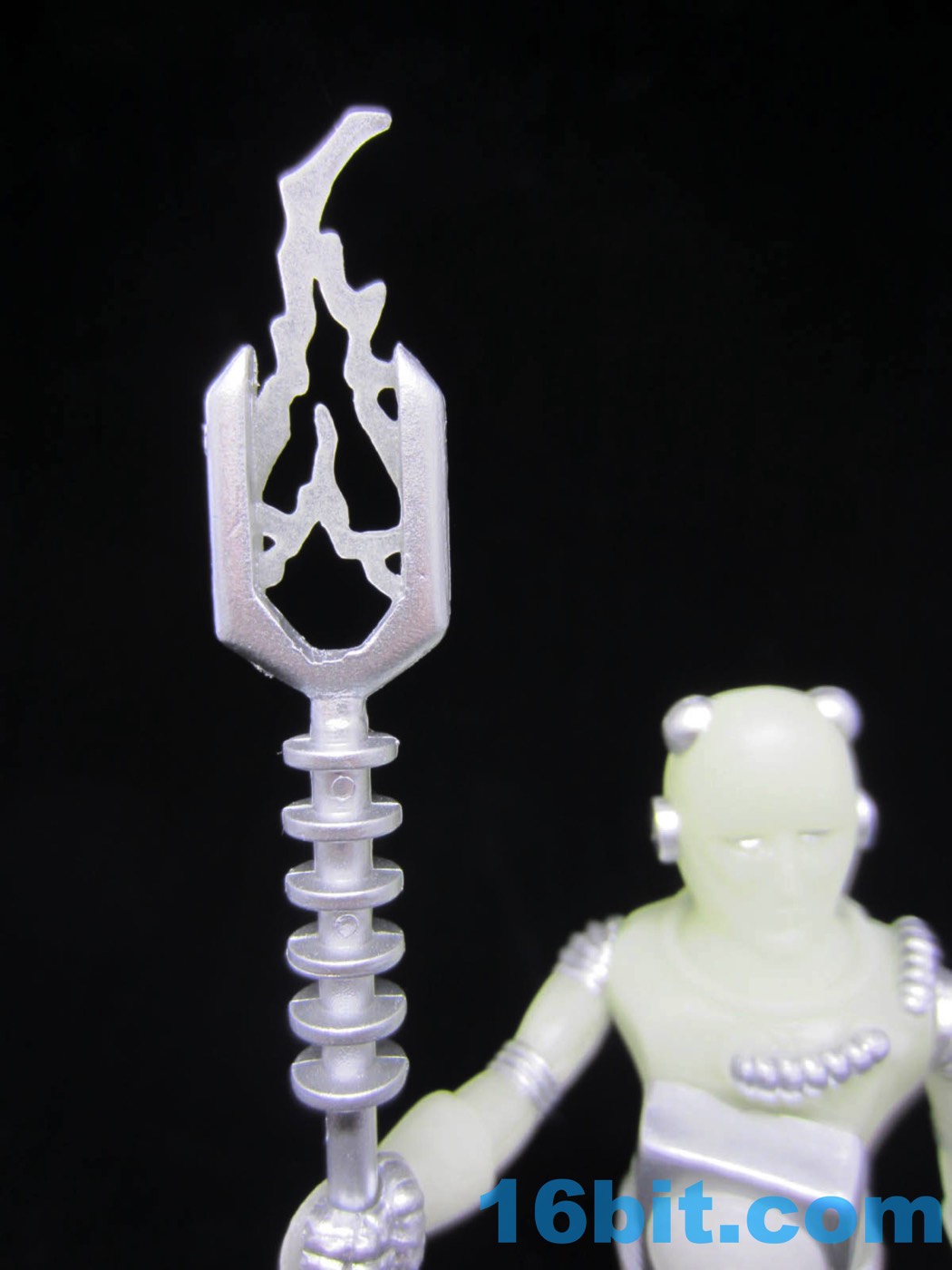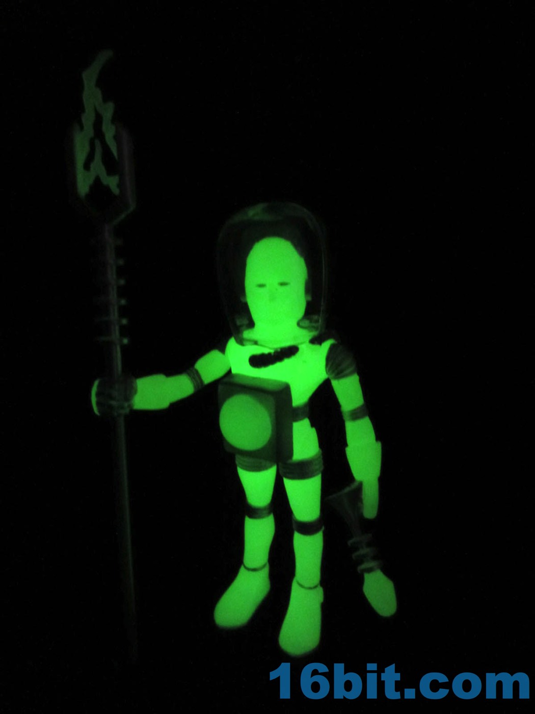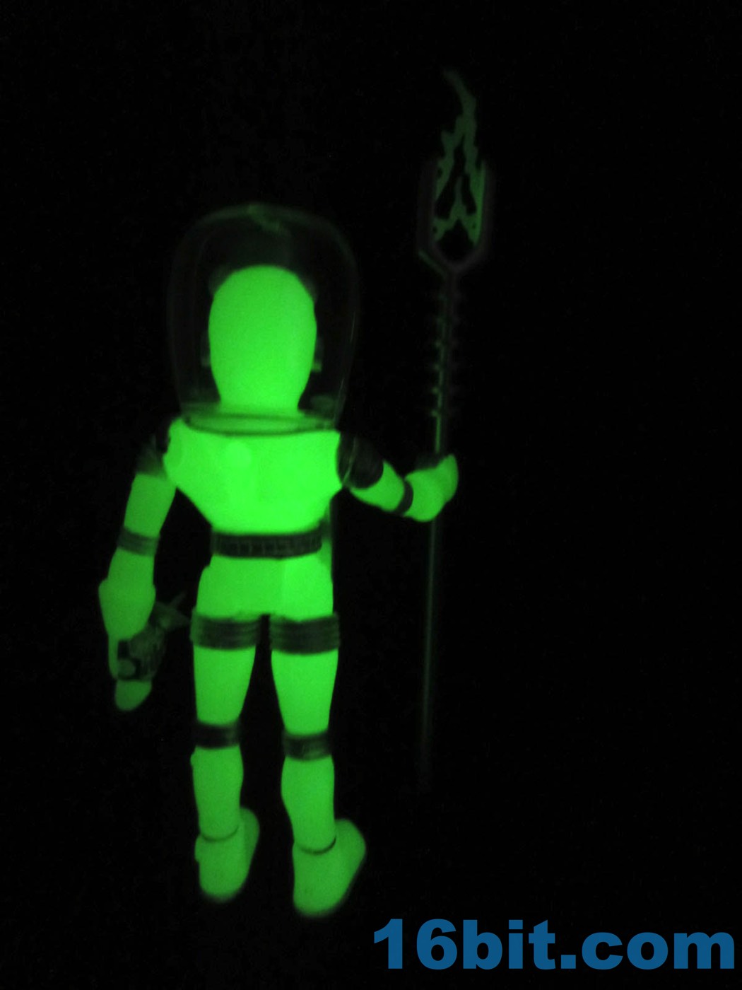 It's worth noting that the original Alpha Phase Electron+ [FOTD #258] had painted silver eyes just like this new one. That was also the only paint it had - the 2017 version has painted silver rings, hoses, and the most surprising addition to me was the painted fingers. It adds a bit to the figure's look, giving it a slightly more grounded look than the ghostly original. The accessories are painted silver, but cast in glow plastic - note the "electricity" on the staff, the tip of the blaster, and the central disc on the chest. These are all glow-in-the-dark ABS plastic, while the helmet was cast in clear colorless plastic. Clear colorless accessories (and glow helmets) were also produced, but it isn't 100% clear how they will be distributed. I can tell you I've got samples of them, though, and they're cool.