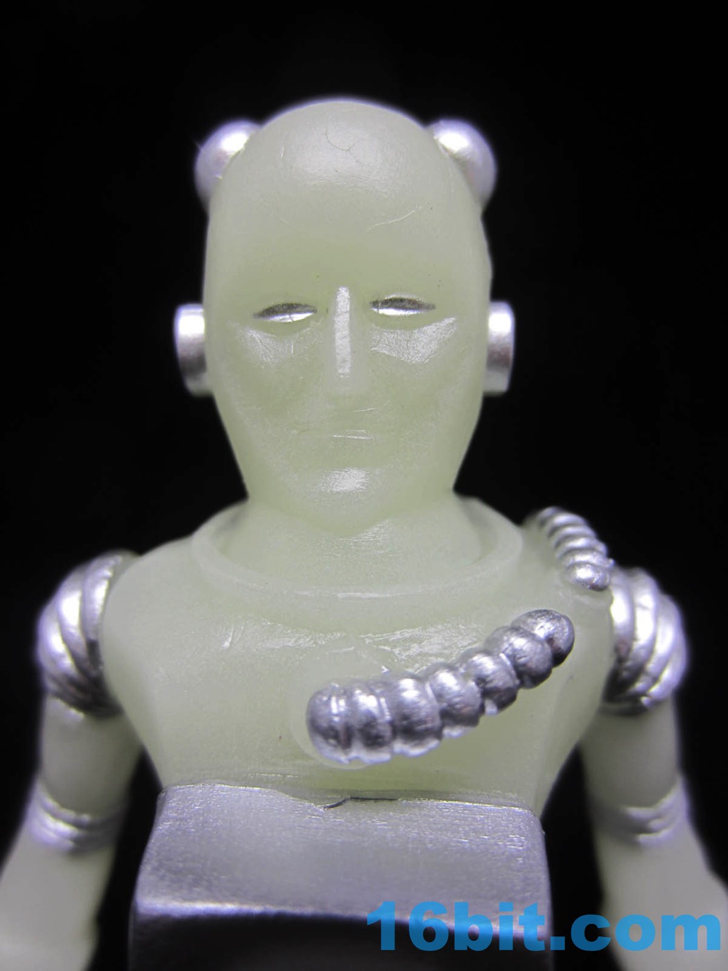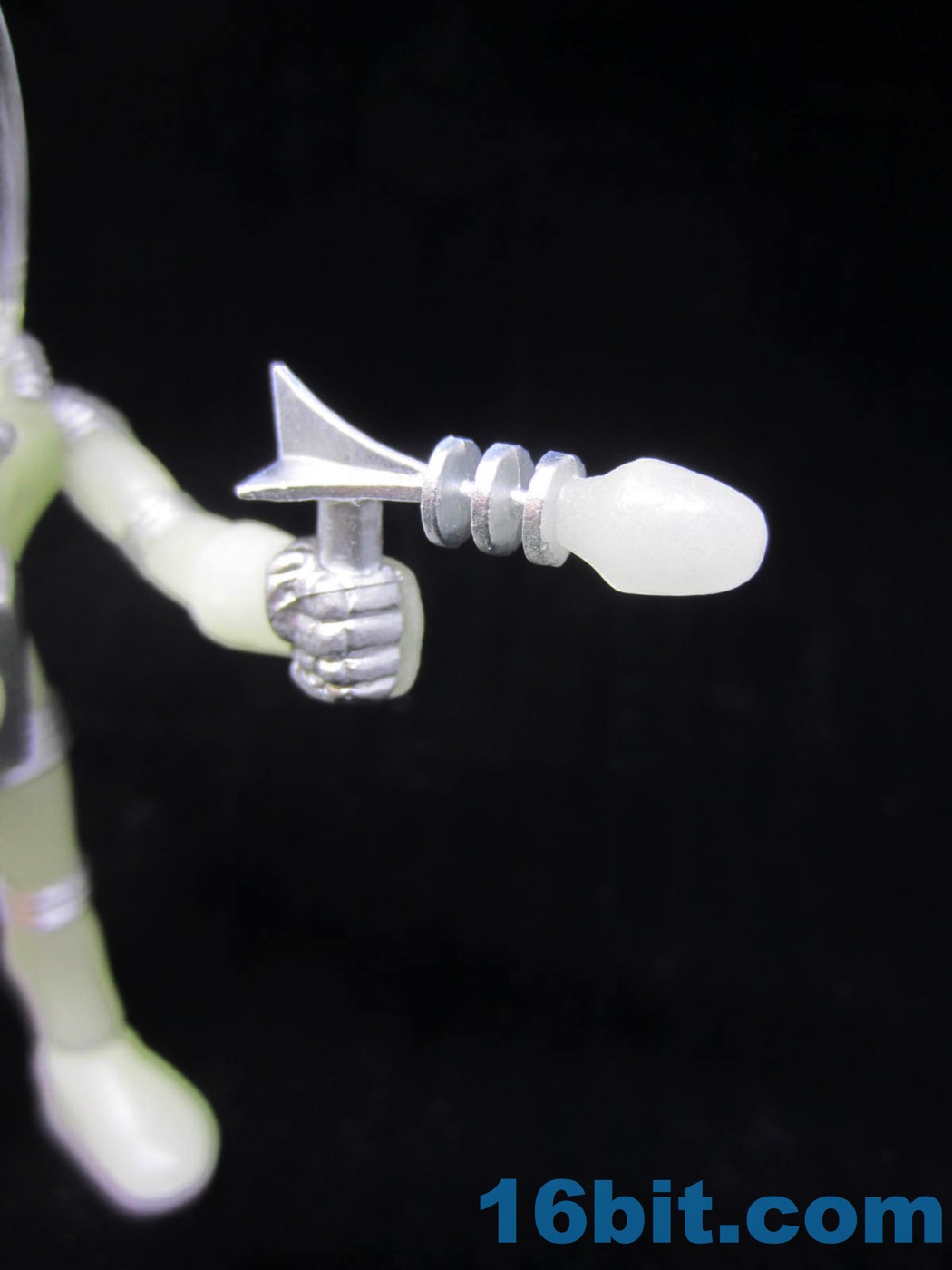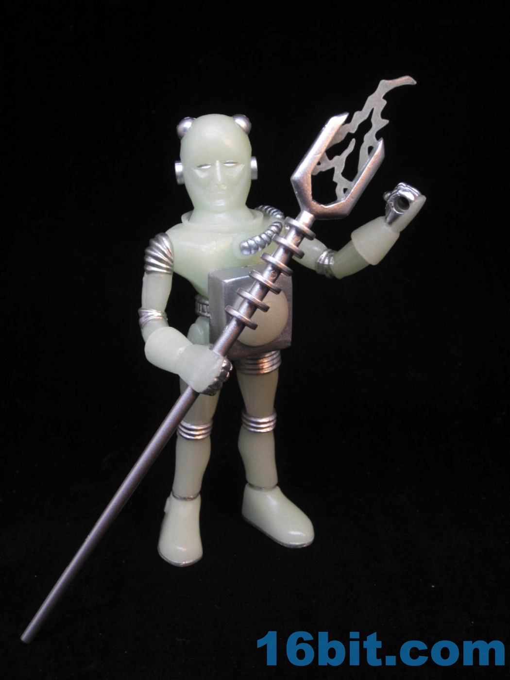 It's worth noting that the original Alpha Phase Electron+ [FOTD #258] had painted silver eyes just like this new one. That was also the only paint it had - the 2017 version has painted silver rings, hoses, and the most surprising addition to me was the painted fingers. It adds a bit to the figure's look, giving it a slightly more grounded look than the ghostly original. The accessories are painted silver, but cast in glow plastic - note the "electricity" on the staff, the tip of the blaster, and the central disc on the chest. These are all glow-in-the-dark ABS plastic, while the helmet was cast in clear colorless plastic. Clear colorless accessories (and glow helmets) were also produced, but it isn't 100% clear how they will be distributed. I can tell you I've got samples of them, though, and they're cool.