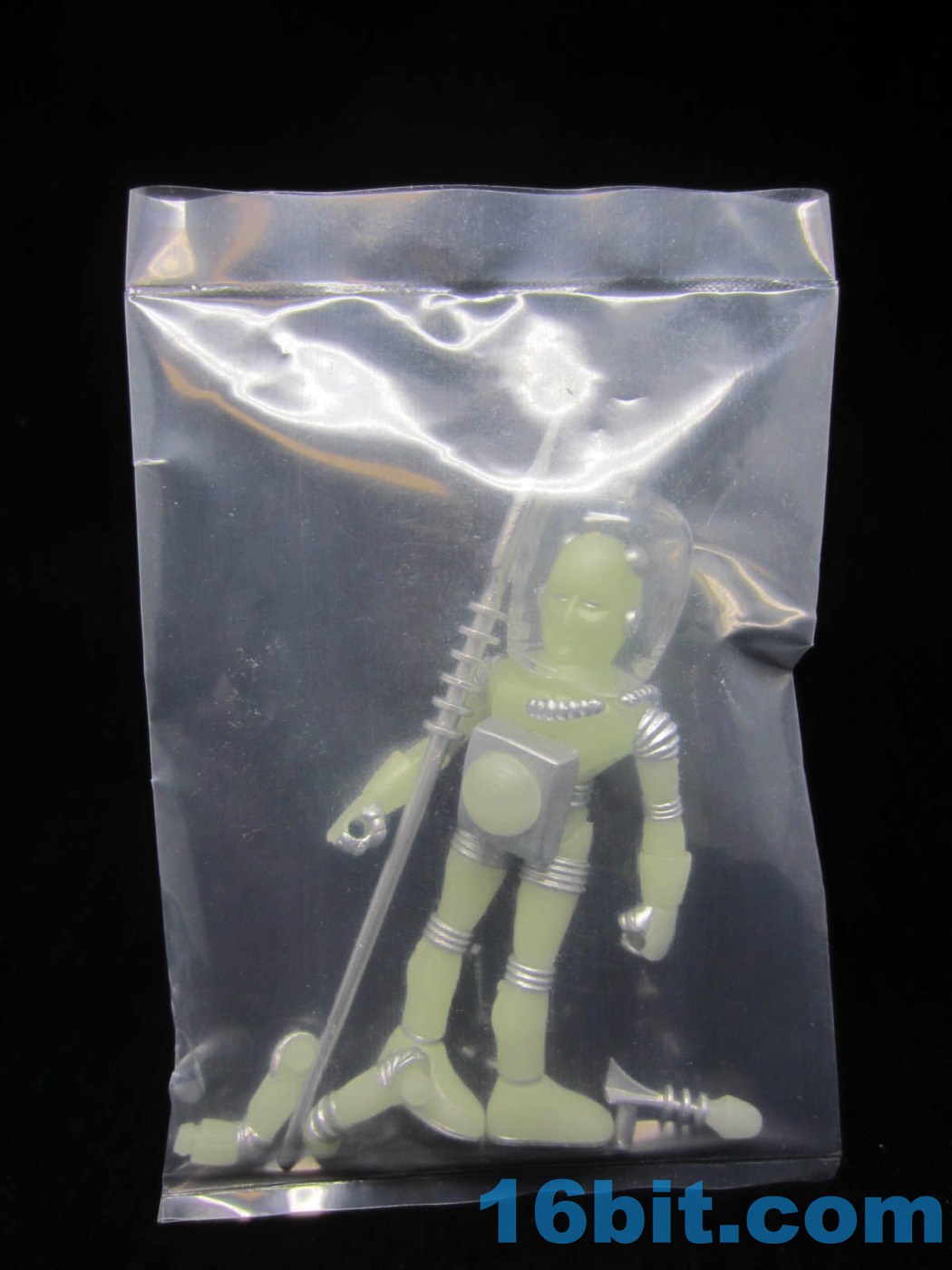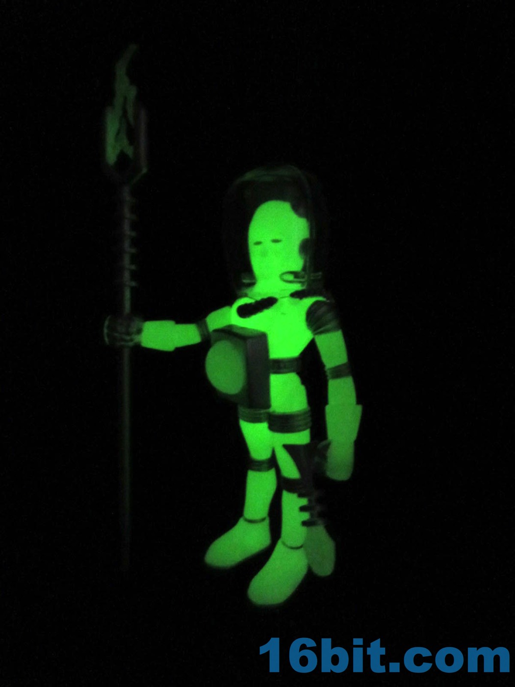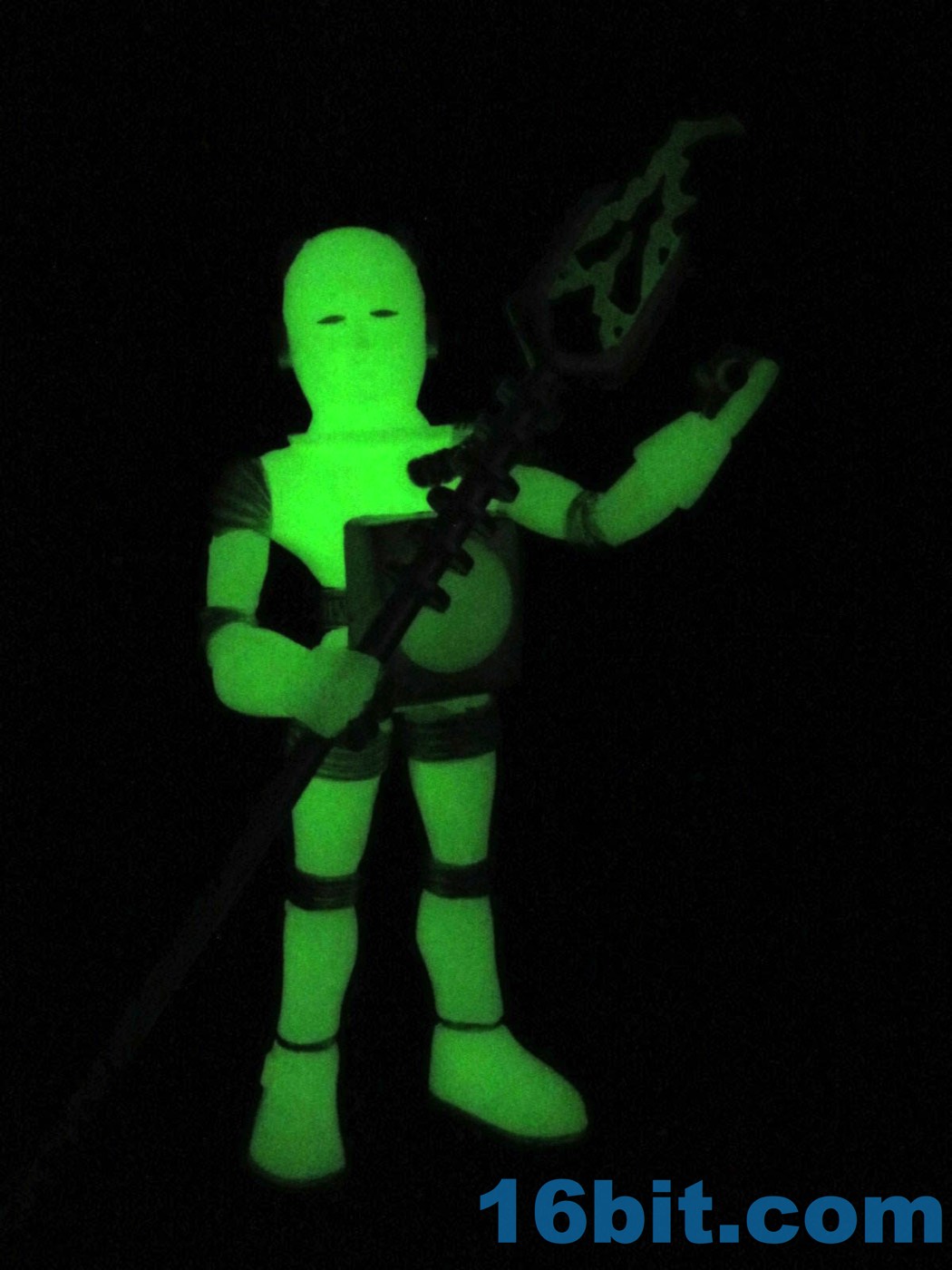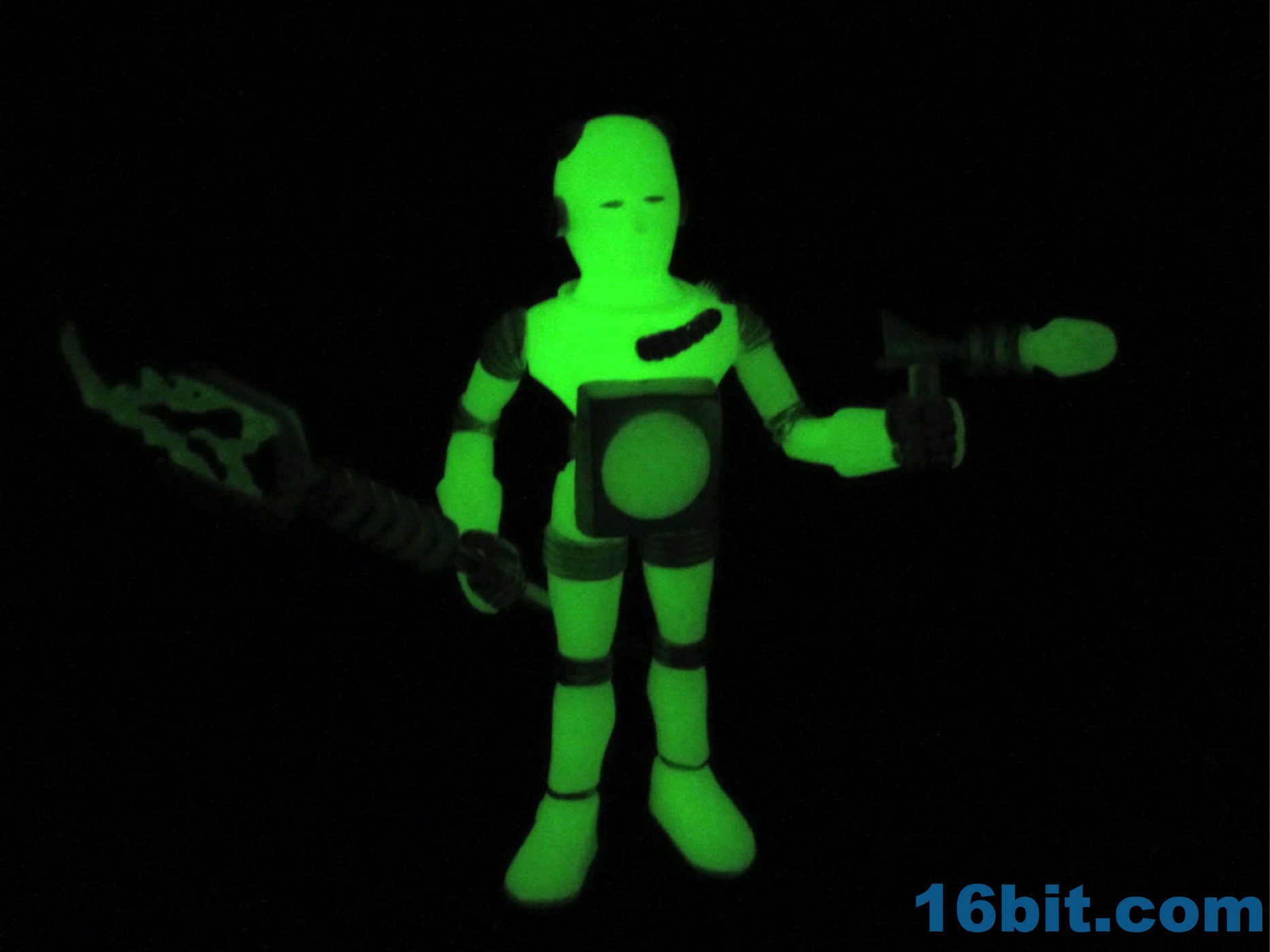 It's worth noting that the original Alpha Phase Electron+ [FOTD #258] had painted silver eyes just like this new one. That was also the only paint it had - the 2017 version has painted silver rings, hoses, and the most surprising addition to me was the painted fingers. It adds a bit to the figure's look, giving it a slightly more grounded look than the ghostly original. The accessories are painted silver, but cast in glow plastic - note the "electricity" on the staff, the tip of the blaster, and the central disc on the chest. These are all glow-in-the-dark ABS plastic, while the helmet was cast in clear colorless plastic. Clear colorless accessories (and glow helmets) were also produced, but it isn't 100% clear how they will be distributed. I can tell you I've got samples of them, though, and they're cool.