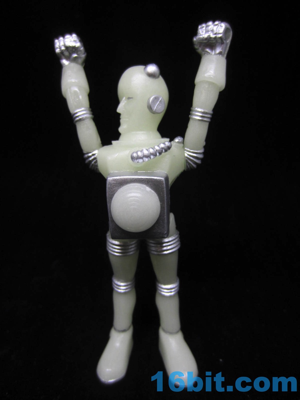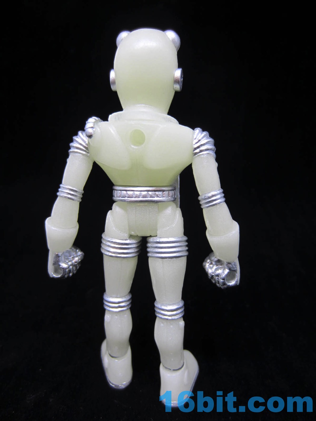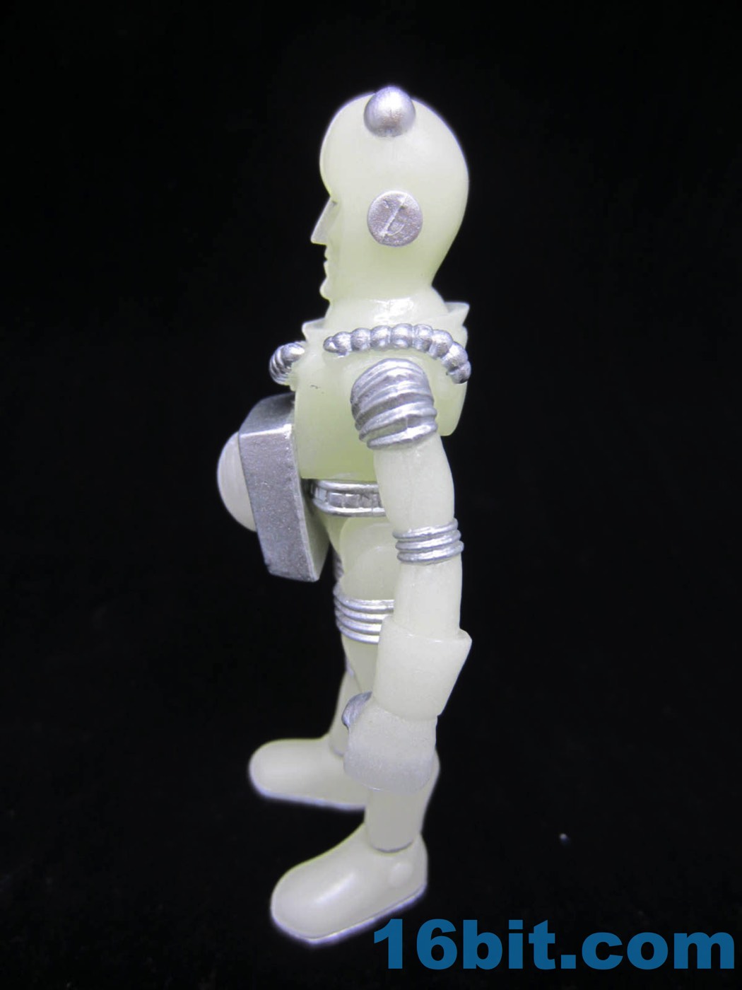 The figure design is a great update of the original concept, but it's worth noting that this Glyos-compatible action figure can't sit. The design has a chest plate hanging in front of the lower waist piece, restricting leg movement. They can't really swing forward at all, but everything else can move fairly freely. The core figure is made of about 13 pieces, sporting about 12 points of articulation. It stands well - it even has painted silver soles - plus silver rings around the ankles. And painted knobs on the head. They didn't skimp.