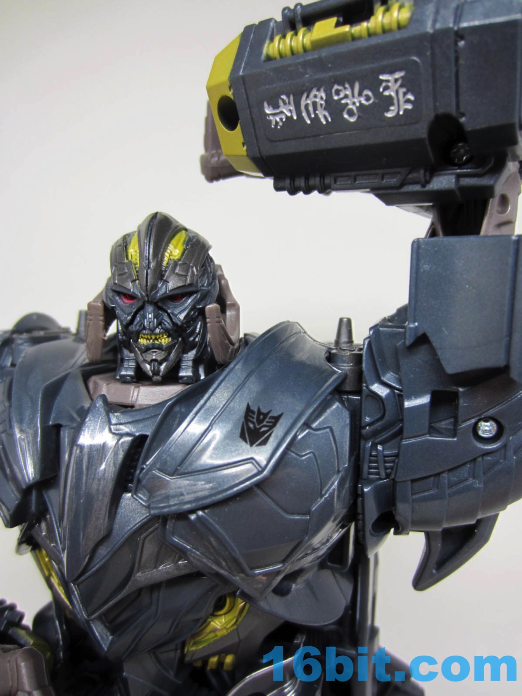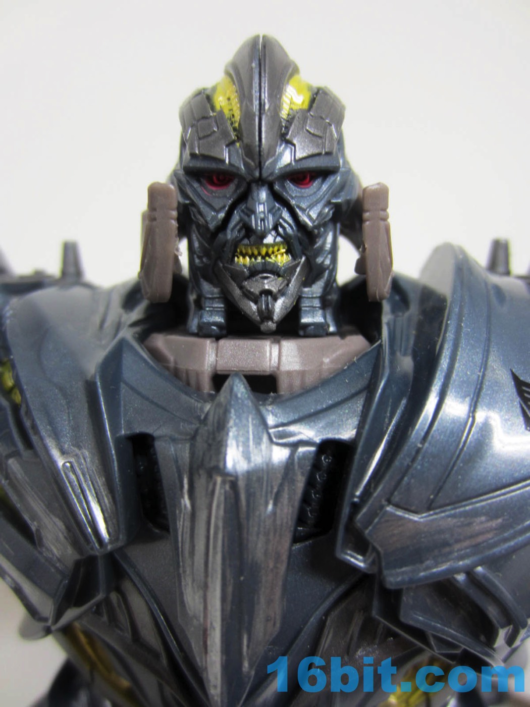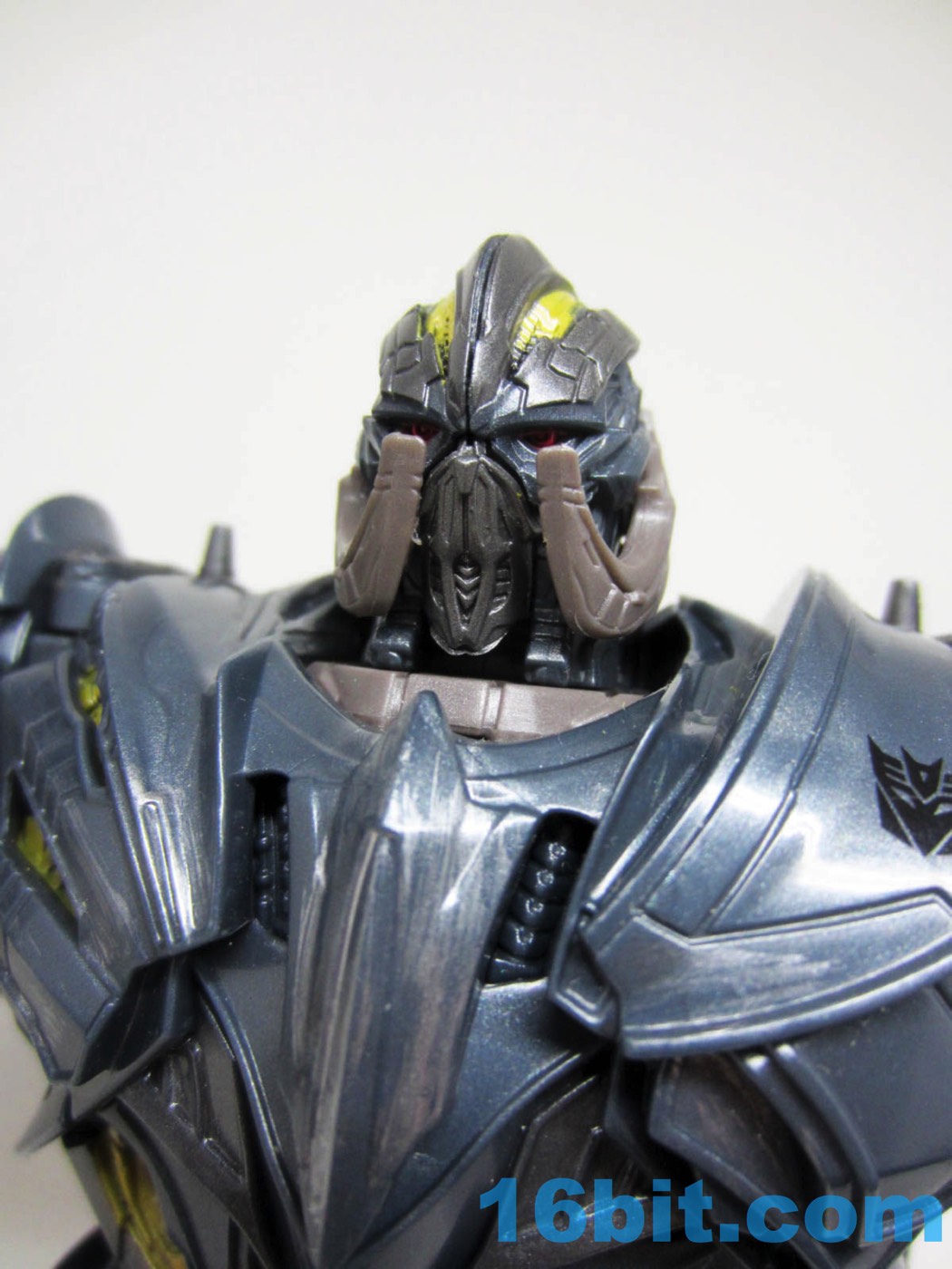 At 8 1/2-inches tall, the redesign of Megatron is really something. There are springy ram horns on his head. There's a lever on the back of the head that can rotate in a faceplate or his pointy-nosed, sharp-toothed malicious frown. His red eyes look vicious - there's so much personality in this robot head that I can't help but completely love it. The extra-pointy nose reminds me a lot of some of the comics, and it's such a radical departure from most Movieverse items - the first movie had heads that were a lot more abstract, with lots of roboty bits like visors and speakers but Megatron now seems to be a much more recognizably human look. Which, I admit, sounds like a load of garbage because it's a giant robot knight.