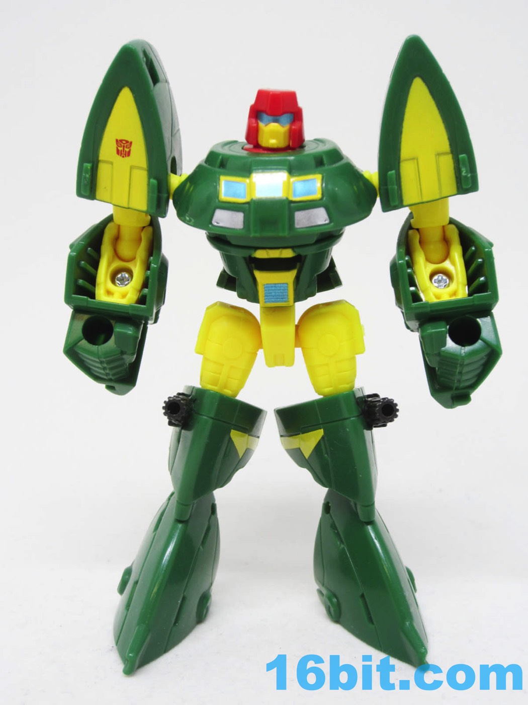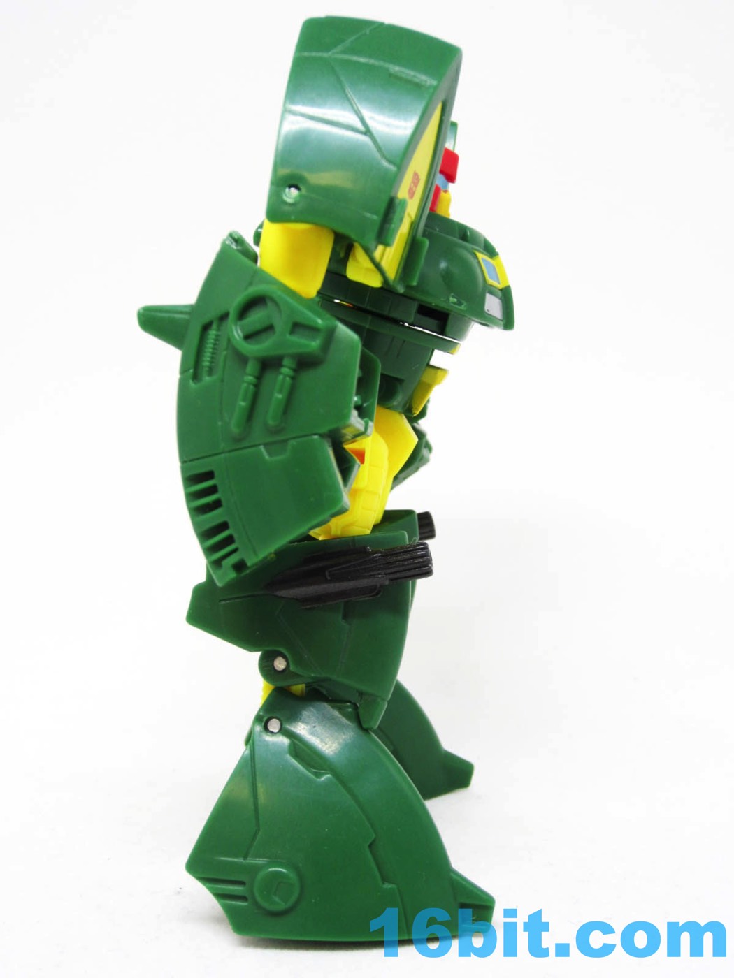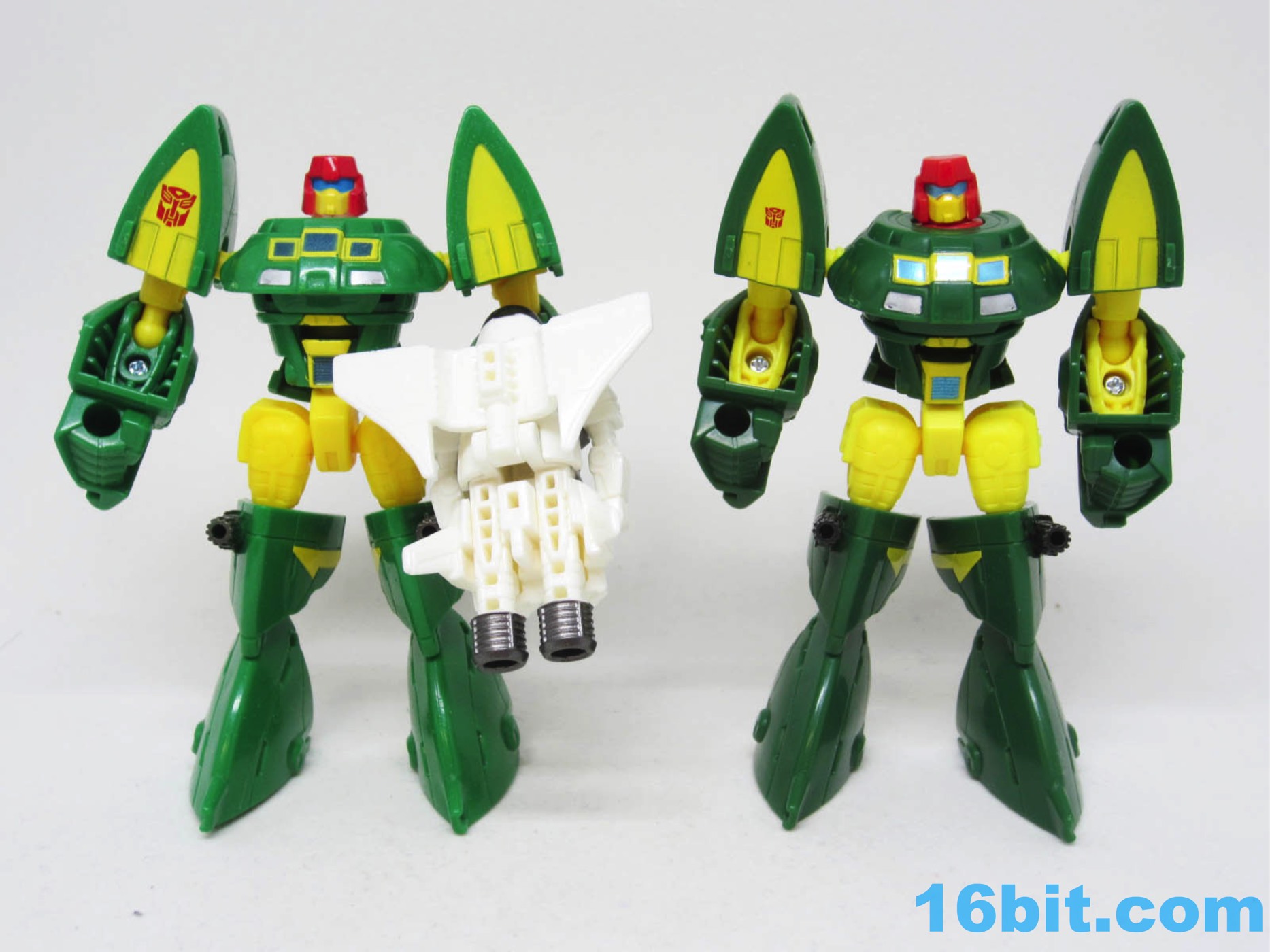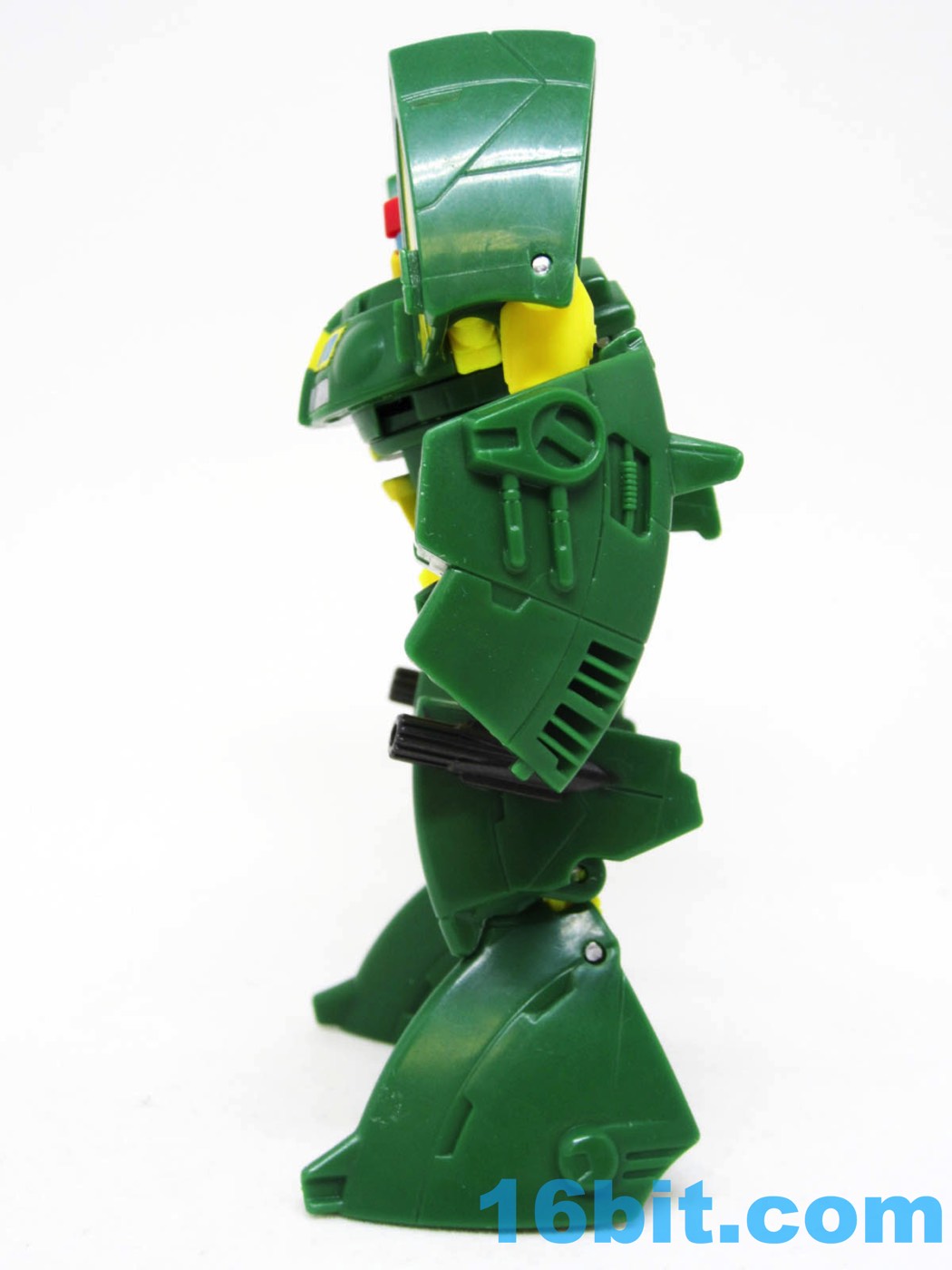 The robot mode looks identical at first glance, but a side-by-side comparison reveals a bunch of changes. First: the green plastic is much darker, the original one was a light green. Second: the forearms are now yellow, the previous version was green. Third: the head and neck assembly were white (due to being molded with Payload), and are now molded in red plastic. Fourth: the eye visor is metallic blue, as opposed to flat light blue. The windows also now match the eyes. Fifth: The Autobot symbol is much, much smaller on his shoulder. I would say that the reduced symbol is really the only step down of the new release.