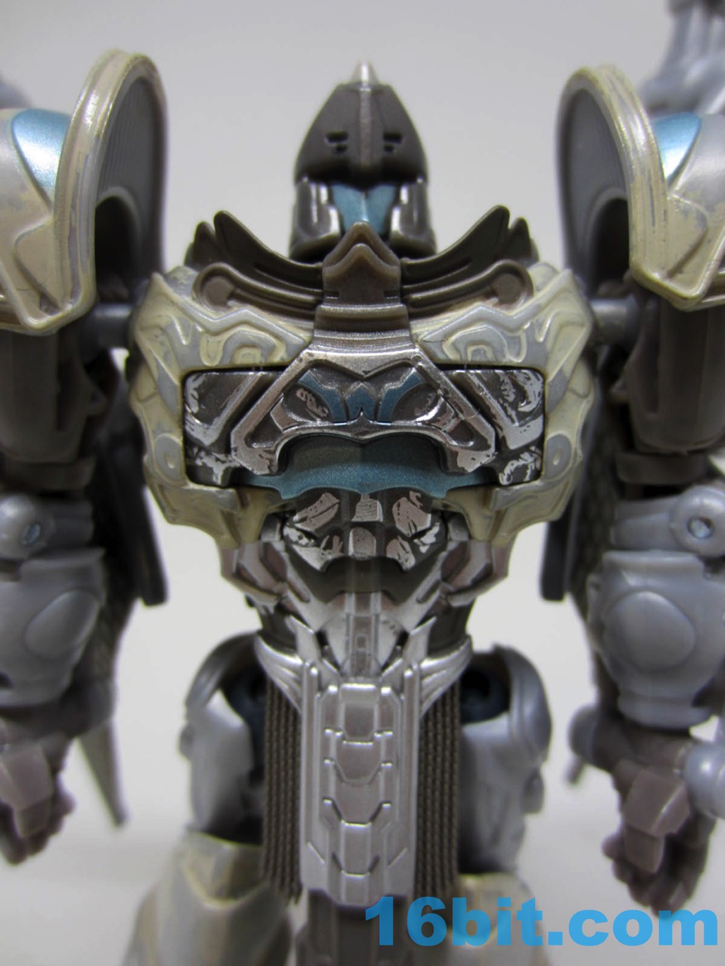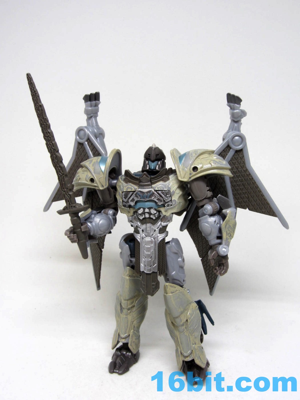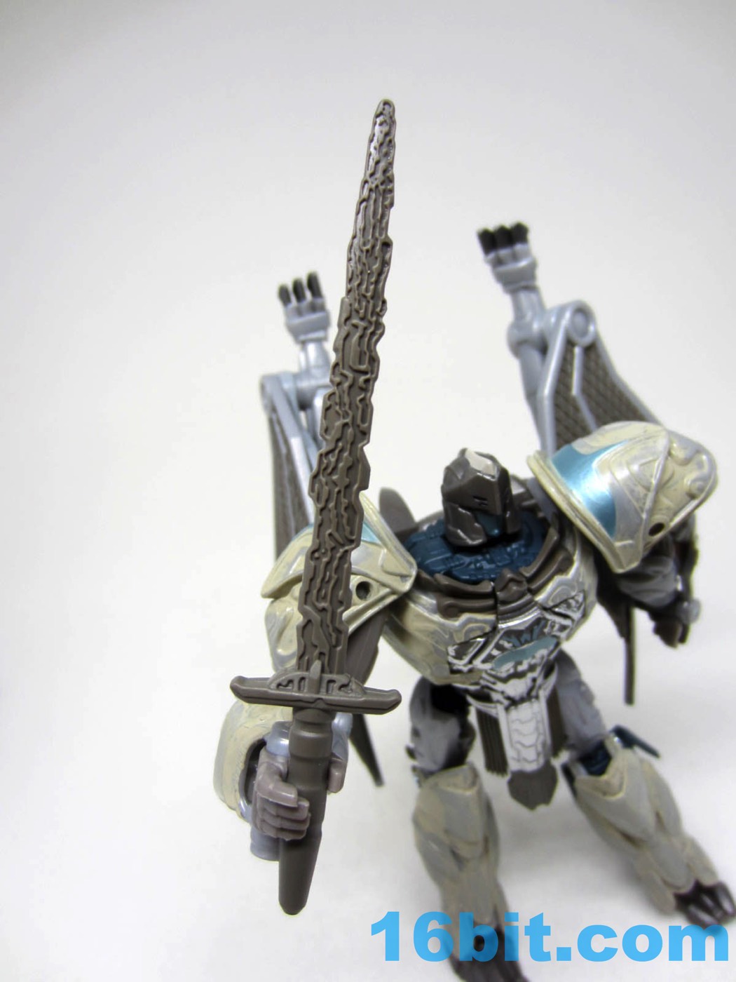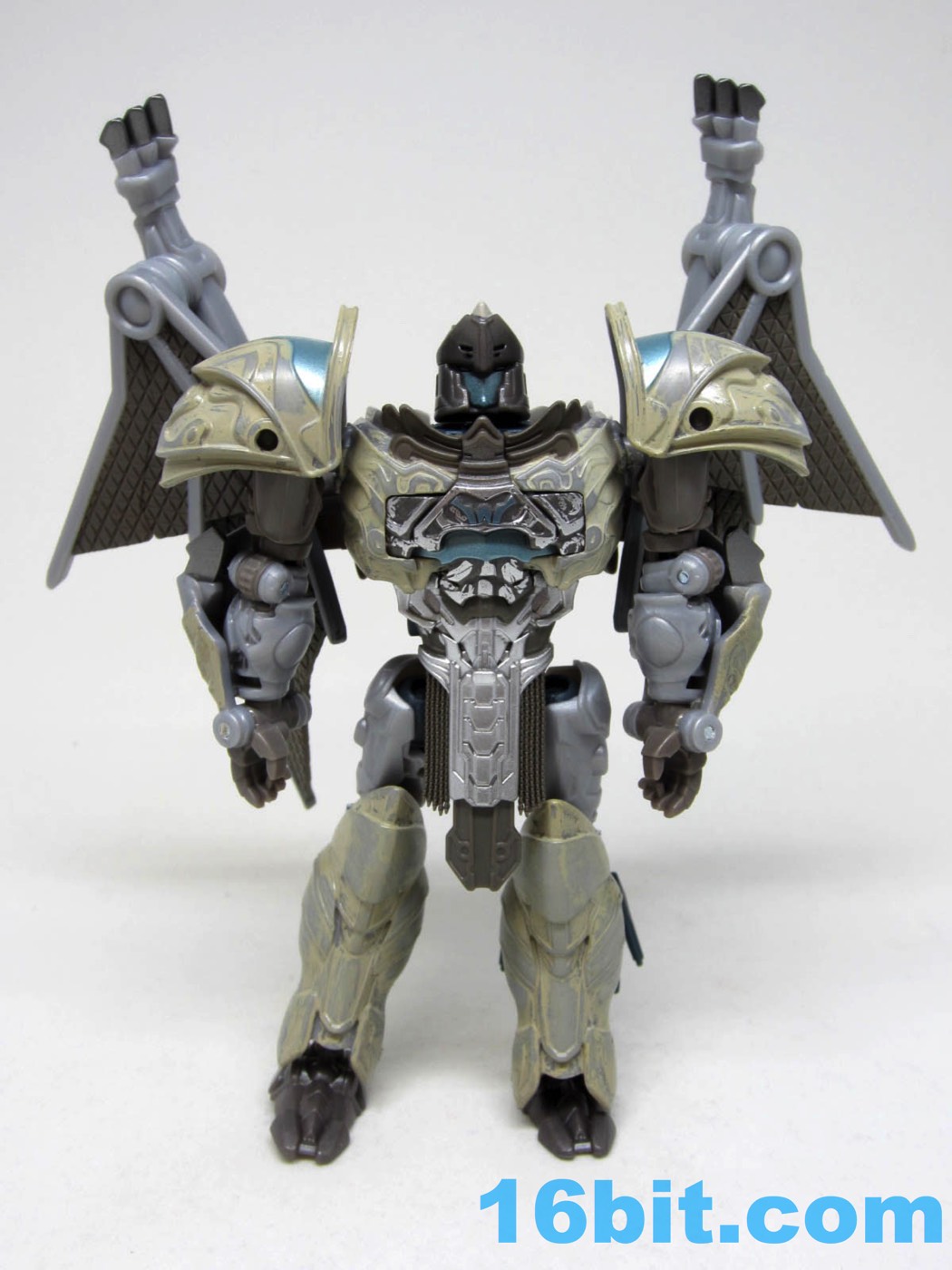 With The Last Knight we get characters with new names! Steelbane is sort of like Cybertron's Vector Prime - an ancient-looking knight robot - cast in grey with metallic blue. It's neat! The head looks like armor, and so does the body. The sword and the designs look a lot like the sci-fantasy stuff we're seeing more in video games lately, with cool designs and hints of energy from within. Out of the box, it was more than a little floppy - once you transform it from dragon to robot again, it feels a little bit better. As first impressions go, Steelbane had some issues.