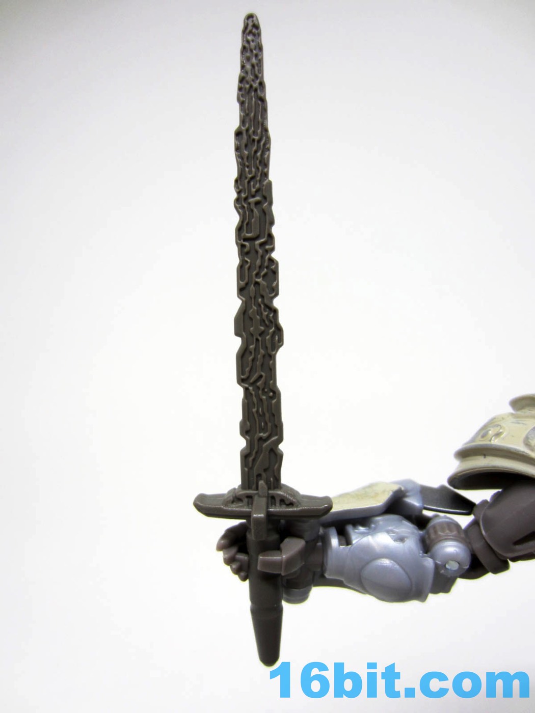 I like the sword, but it doesn't quite match the box art. This one has a lot more going on, seemingly forged out of some jagged space rock. If the grooves had blue energy flowing through them, it'd seem like it came out of Breath of the Wild. The grey is good, but I can't help but think casting it in clear plastic with a wipe of some sort would have given it incredible visual power. Oh, and a higher cost. A much higher cost. It's a perfectly nice little sword, and distinctive enough for the series to stand apart from the many other more mechanical or traditional swords.