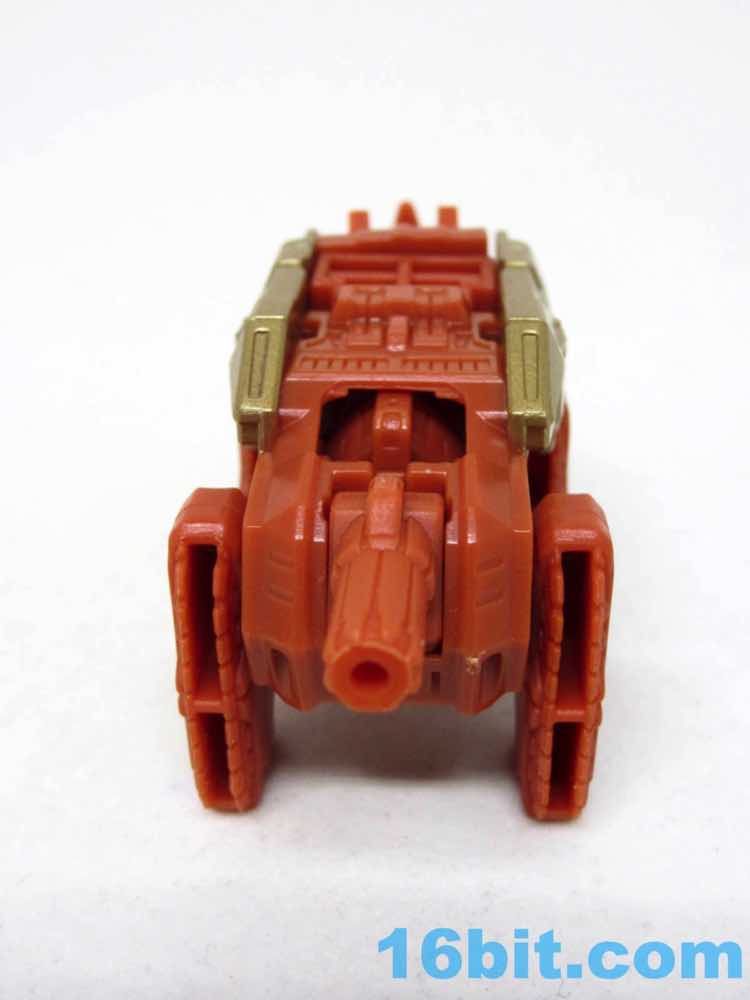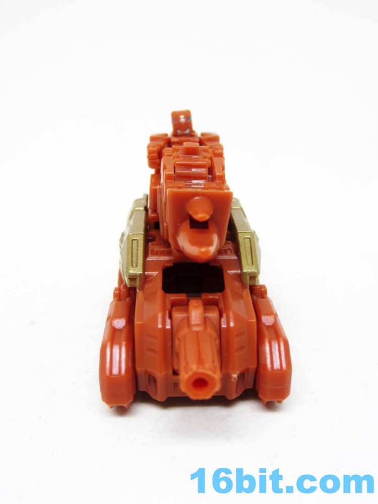 I'm digging the tank mode, which unfolds in strange ways to give us spikes jutting toward the enemy Thanks to the unfolding three-piece head, you can aim it up and down as well as swivel it all around. It works well - and there are foot pegs for the Titan Master to shuffle around on the back like a scooter. It's everything to like here. There are no rolling wheels, but it's five bucks - this is a decent alt mode for five bucks.