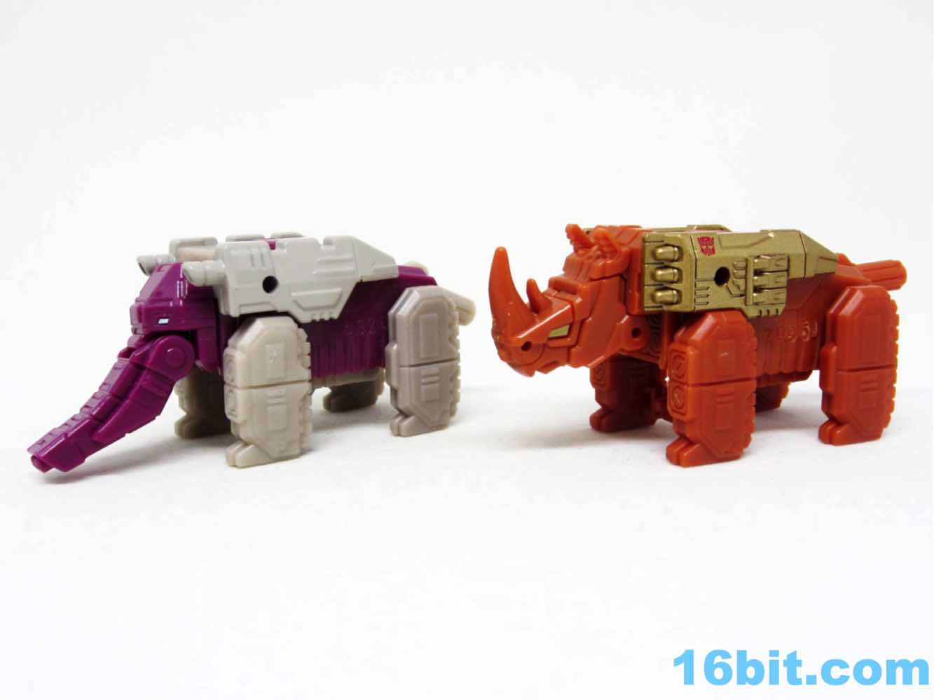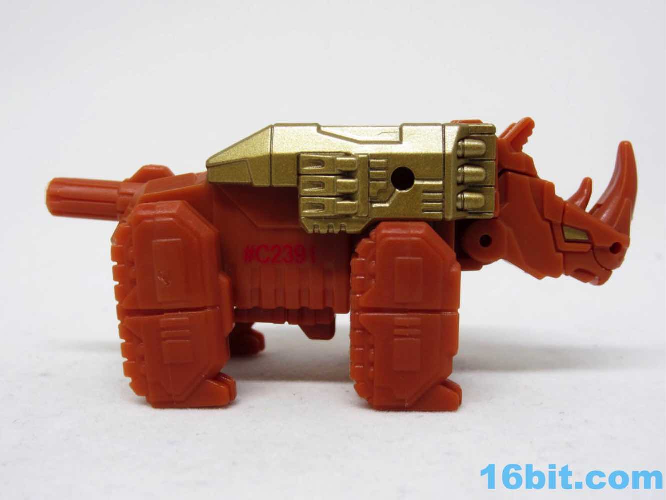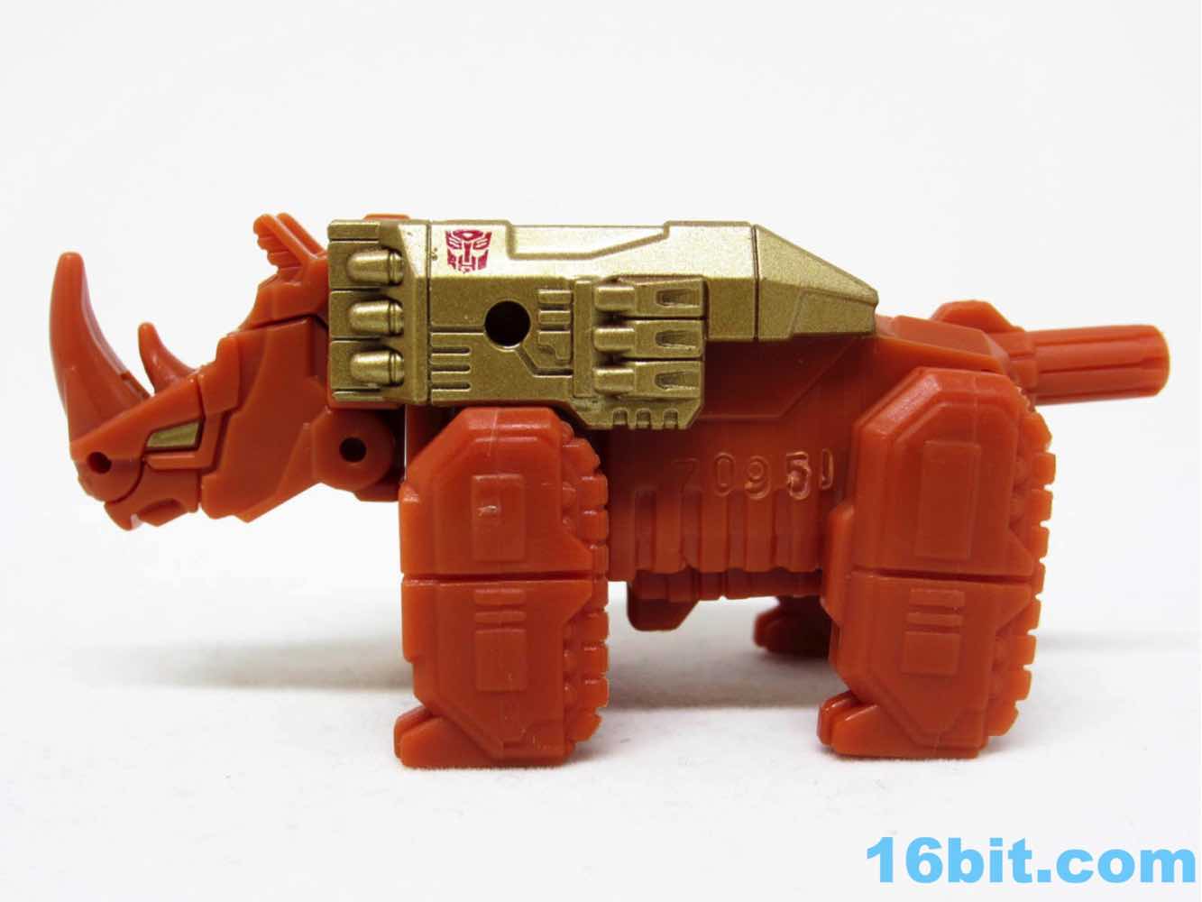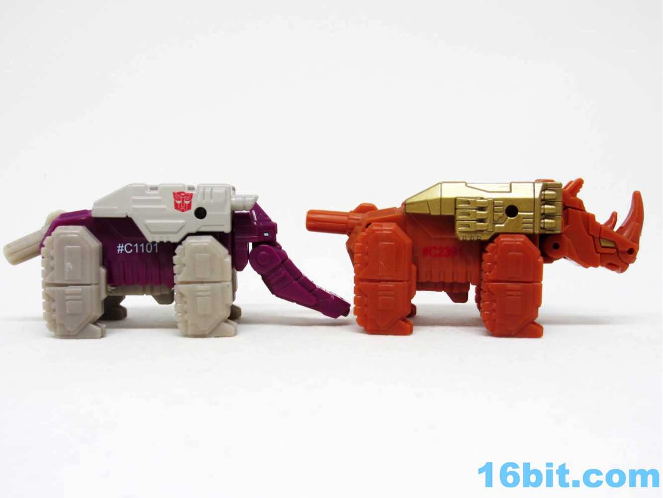 The rhino mode is the Shuffler elephant mode with a new head and new shoulder weapons. The tail is a 5mm peg, the head unfolds in three disturbing pieces, and the Autobot logo on the shoulder looks good. I appreciate how it has gold weapons like the original G1 Ramhorn, and as a toy unto itself it's pretty great. I imagine it would also be good in other colors with other names, were Hasbro included to exploit it as Rhinox or Tankorr or even Headstrong. The legs move in two distinctive groups, and the toy can swivel at the neck for the purposes of transformation. This is also notable in being the only redeco in the Titan Masters format to incorporate newly tooled pieces, everything else was a 100% new mold or a redeco - this just has some new parts, and that makes it great too.
