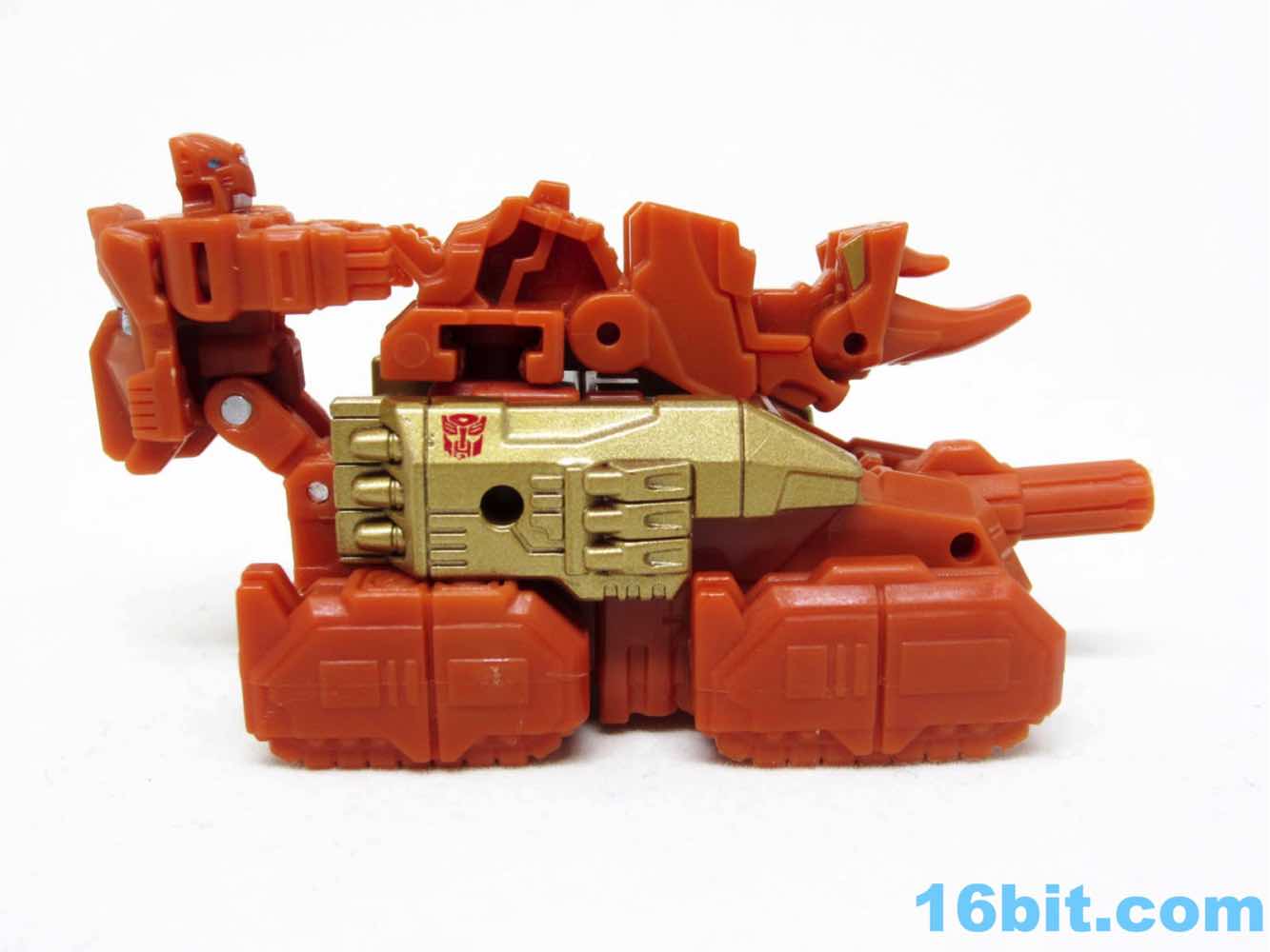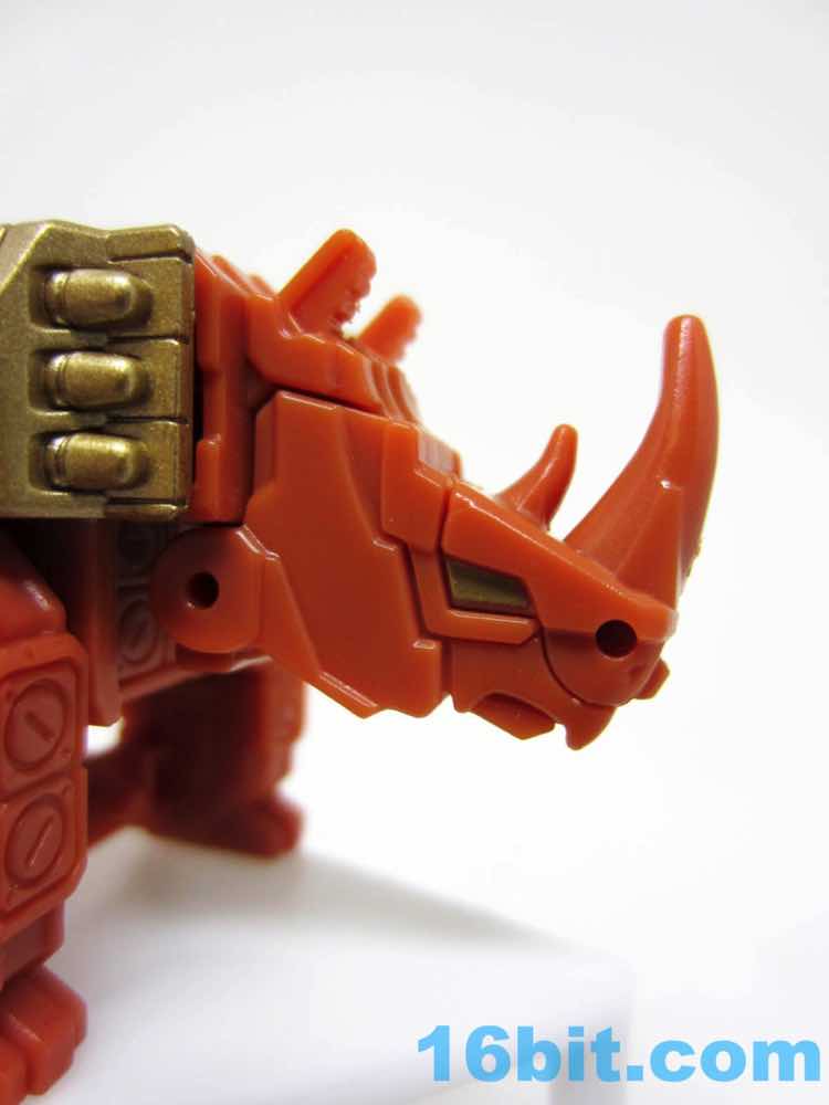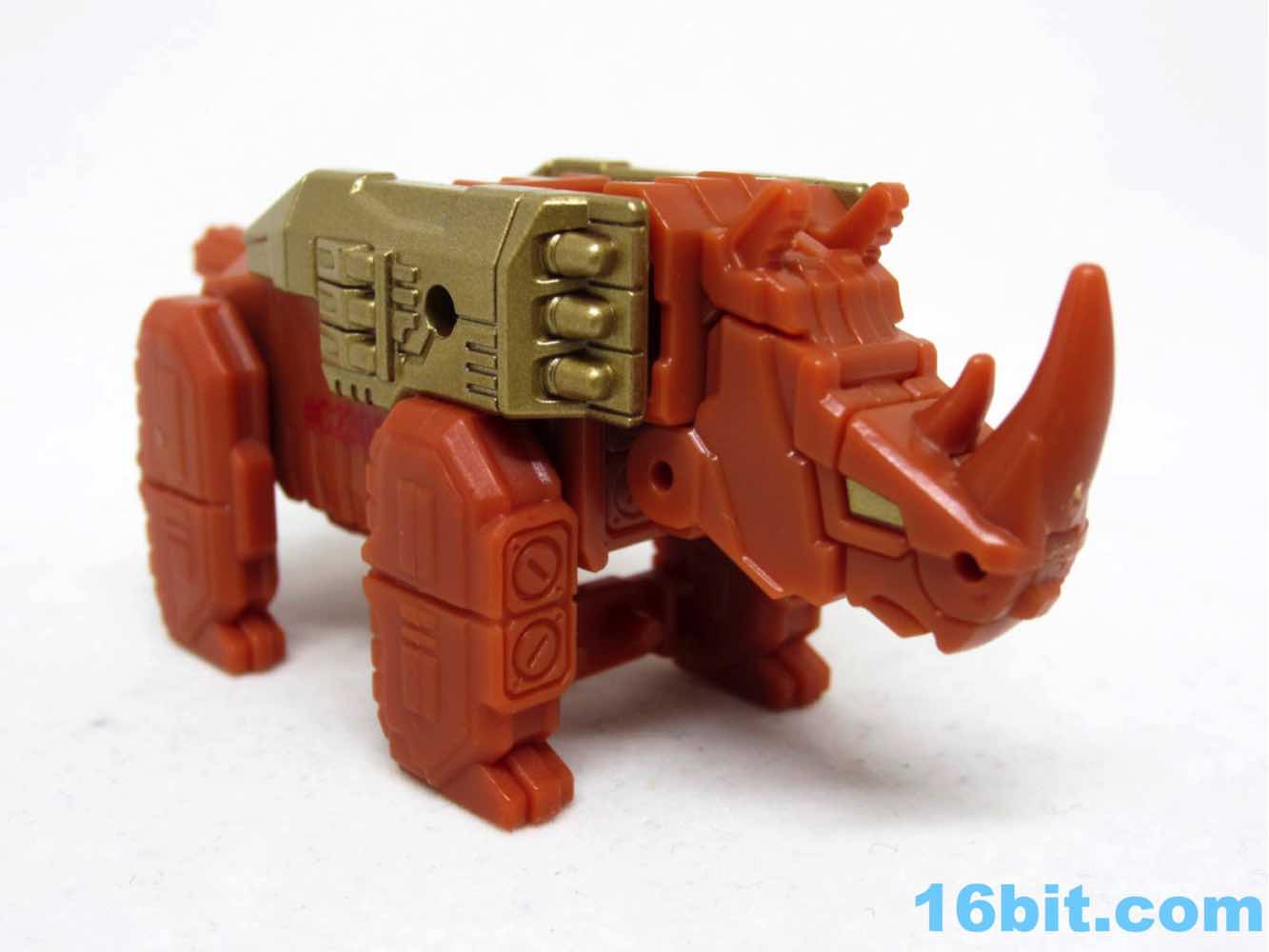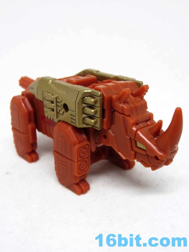The rhino mode is the Shuffler elephant mode with a new head and new shoulder weapons. The tail is a 5mm peg, the head unfolds in three disturbing pieces, and the Autobot logo on the shoulder looks good. I appreciate how it has gold weapons like the original G1 Ramhorn, and as a toy unto itself it's pretty great. I imagine it would also be good in other colors with other names, were Hasbro included to exploit it as Rhinox or Tankorr or even Headstrong. The legs move in two distinctive groups, and the toy can swivel at the neck for the purposes of transformation. This is also notable in being the only redeco in the Titan Masters format to incorporate newly tooled pieces, everything else was a 100% new mold or a redeco - this just has some new parts, and that makes it great too.