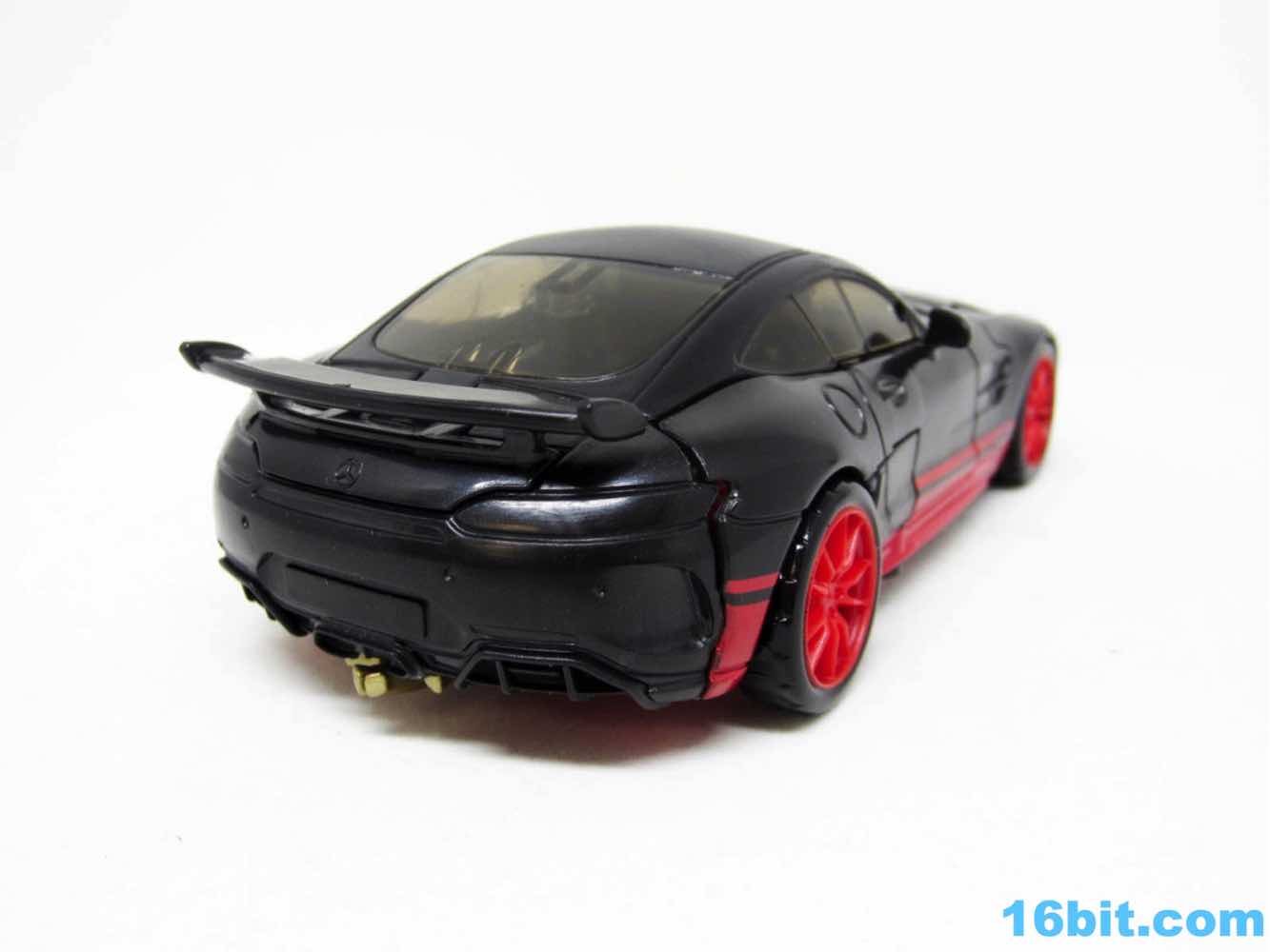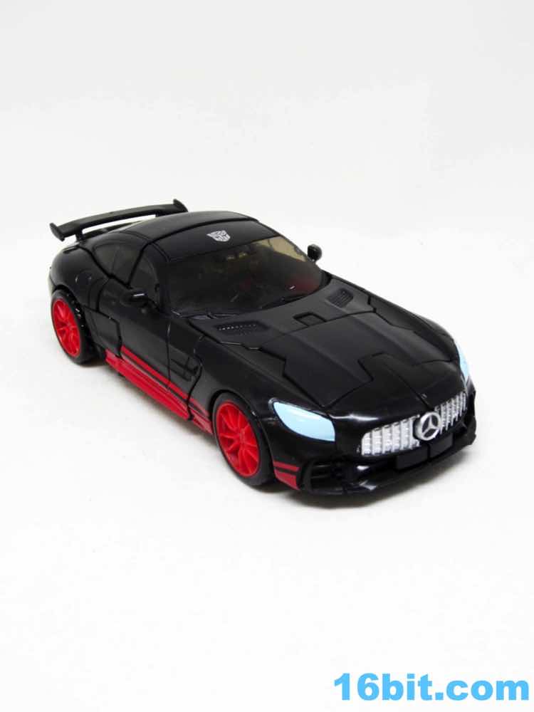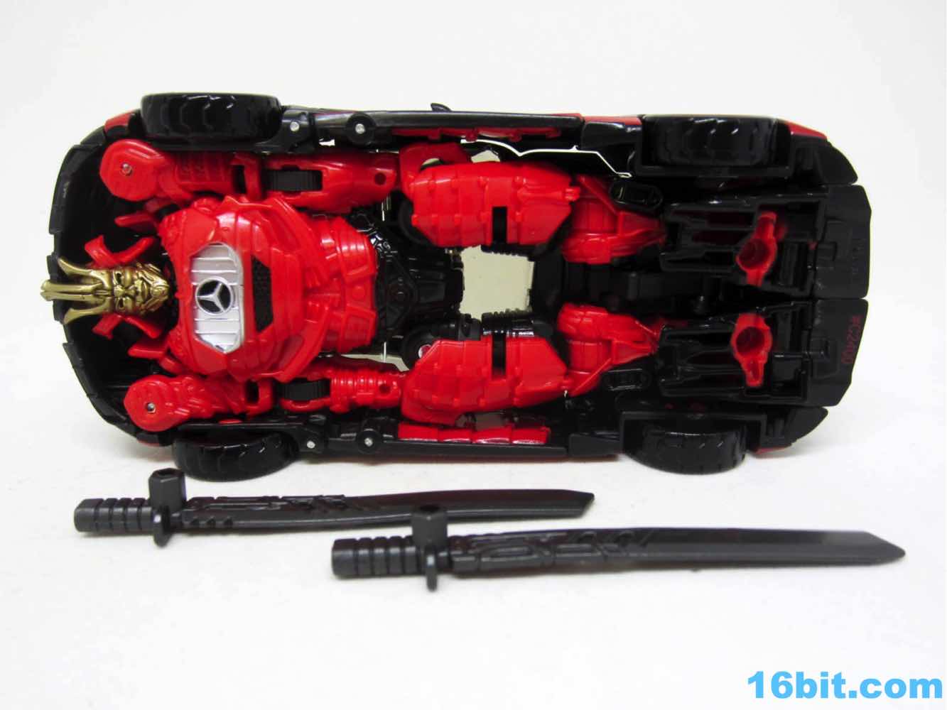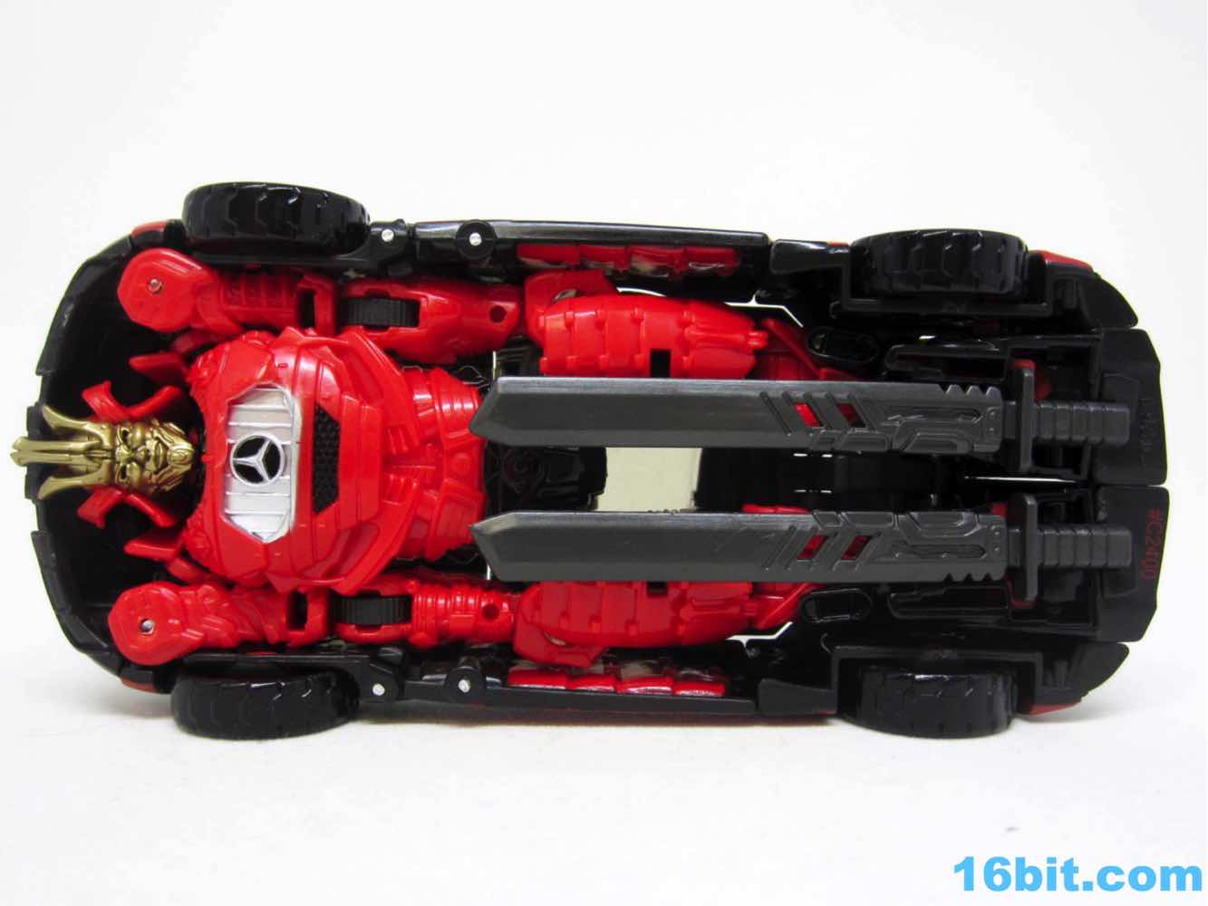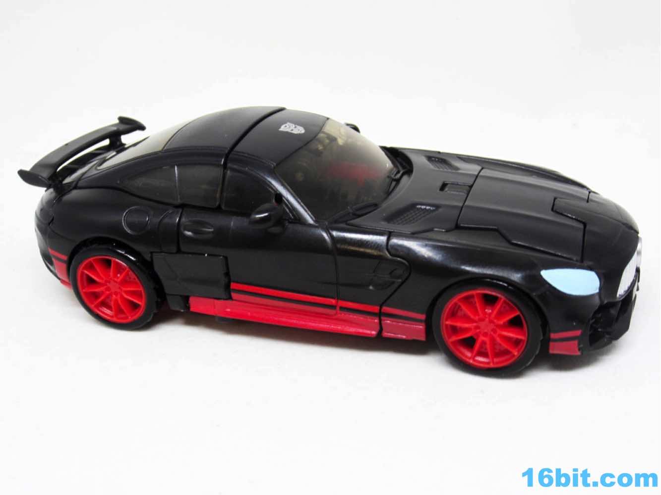 His four swords seem to be the same as the previous Deluxe toy, but cast in black. I can't find any obvious differences in them, aside from the black plastic feeling a little more flexible than the gold plastic. You can plug them in all sorts of places - his hands, 5mm ports on his back, and under the car in vehicle mode. The little swords tuck inside the car perfectly, while the big ones drag along the asphalt. Everybody did a bang-up job here.