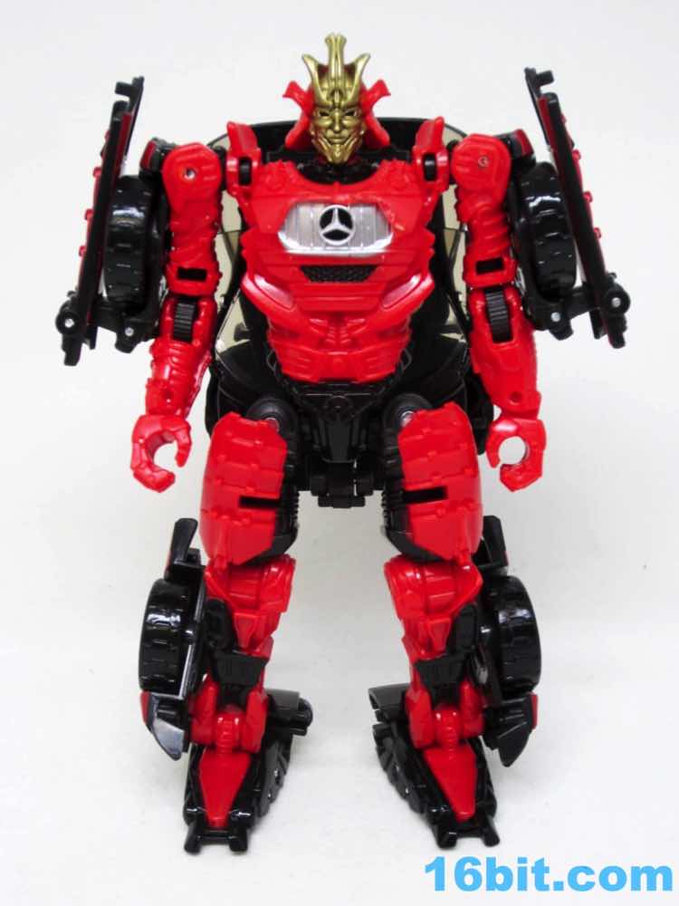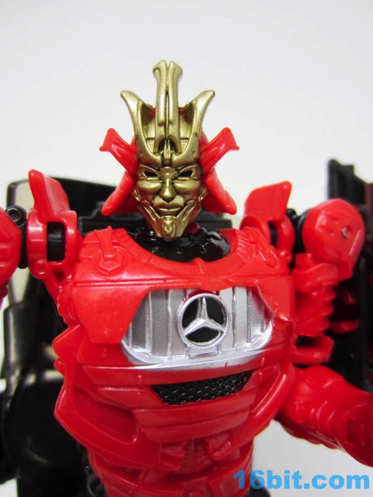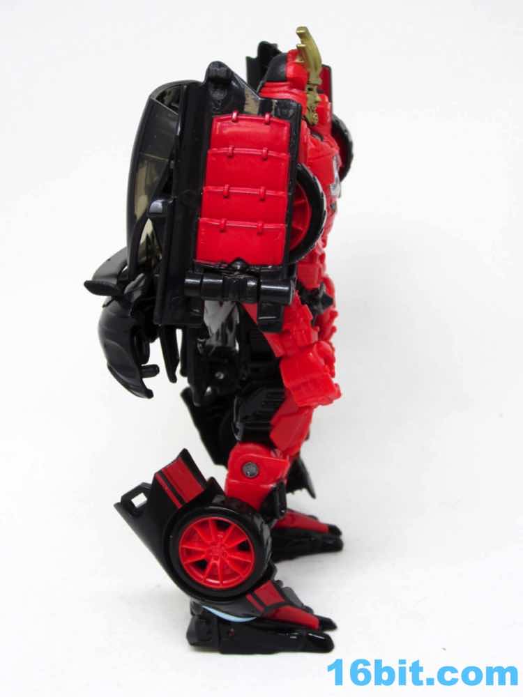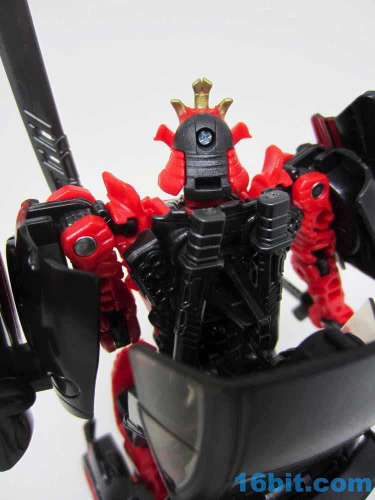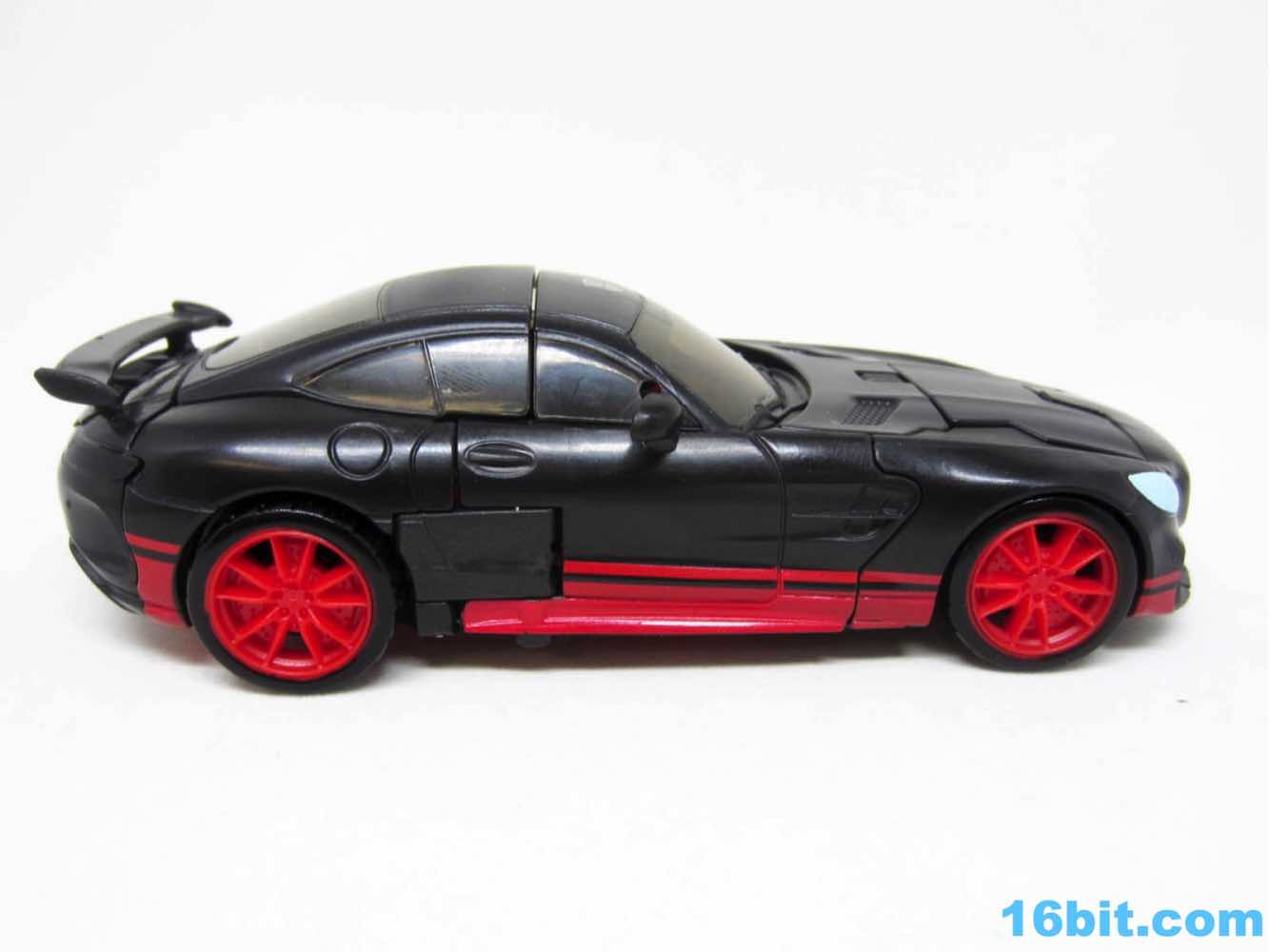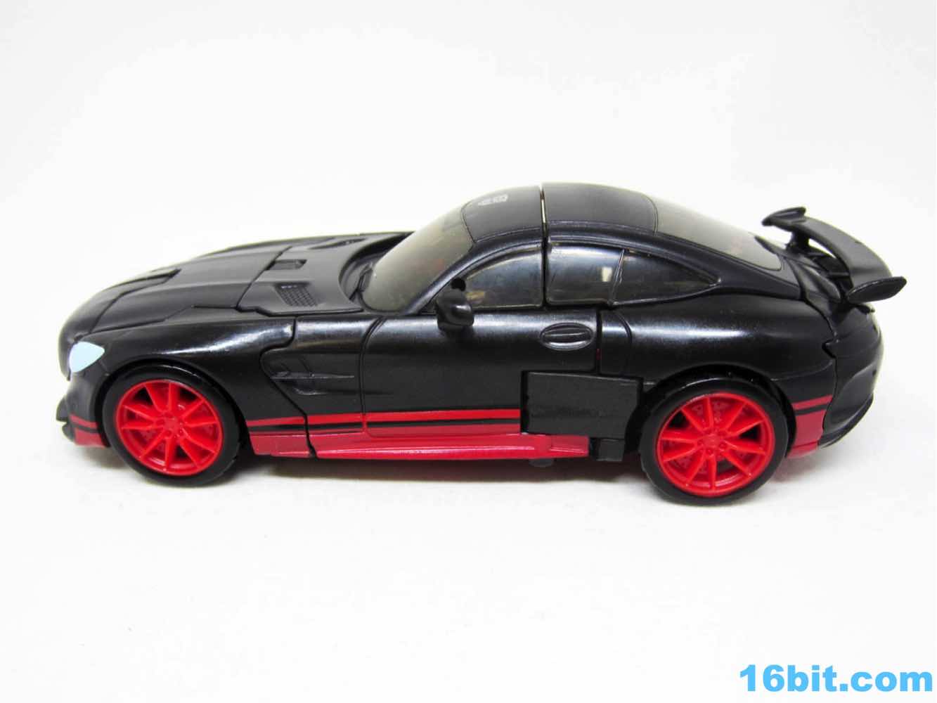 His four swords seem to be the same as the previous Deluxe toy, but cast in black. I can't find any obvious differences in them, aside from the black plastic feeling a little more flexible than the gold plastic. You can plug them in all sorts of places - his hands, 5mm ports on his back, and under the car in vehicle mode. The little swords tuck inside the car perfectly, while the big ones drag along the asphalt. Everybody did a bang-up job here.