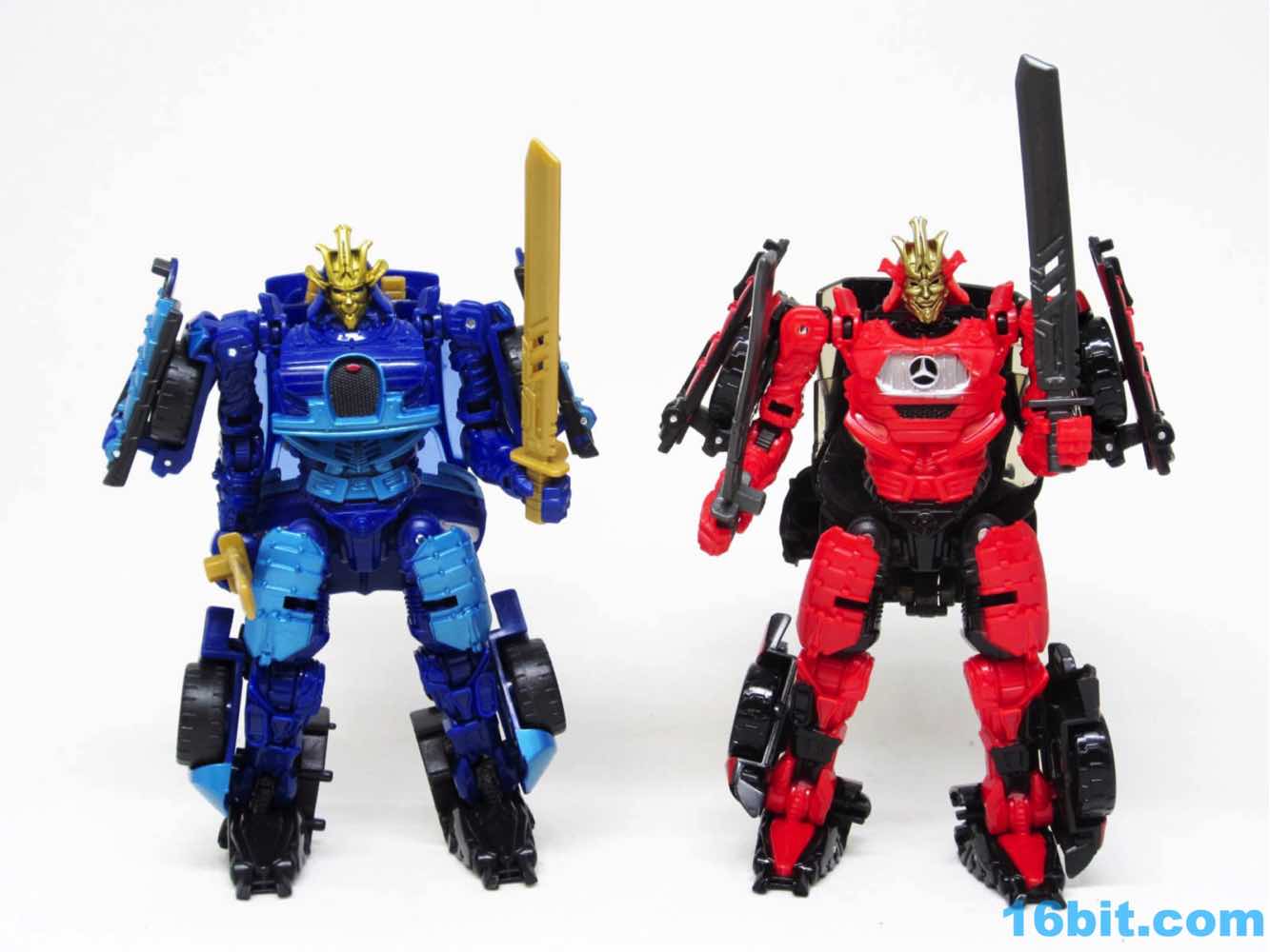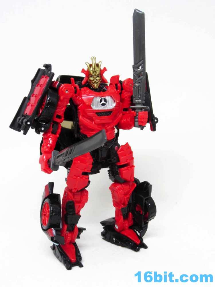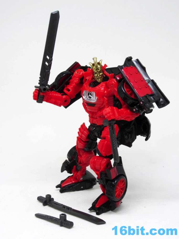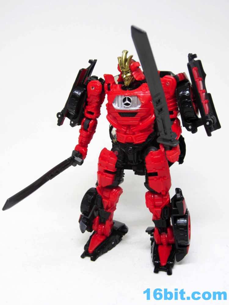 Roughly 19 points of articulation are on this robot which feels almost exactly like the last one - but it isn't. If you compare them side by side, the similarities are incredible - but it's a different mold, with a different alt mode. So many parts seem to be derived from the same sculpt if not the same mold, with arms and legs that are so similar to the original. The black plastic pieces - save for the swords - are clearly different, but much of the red is similar to the original. The tires are different, sure. But that head is barely different, and it's a fantastically designed noggin as it's so unlike much of what we get in any strain of Transformers toy.