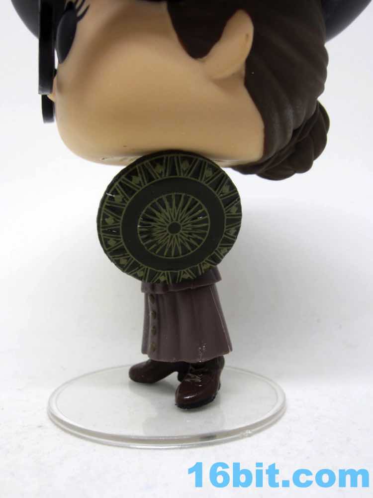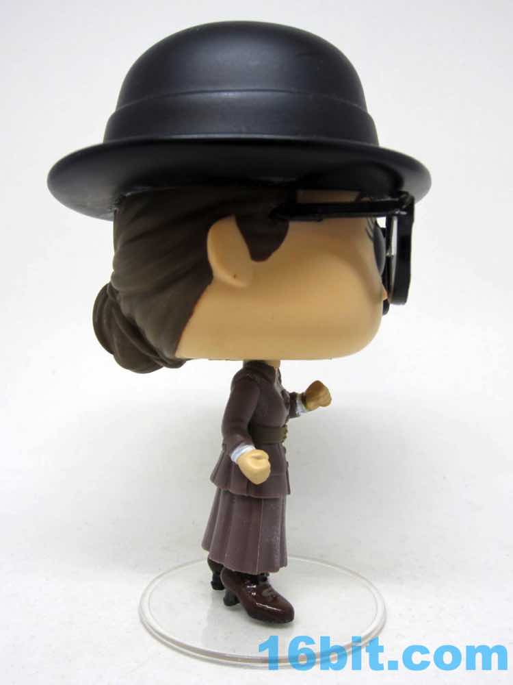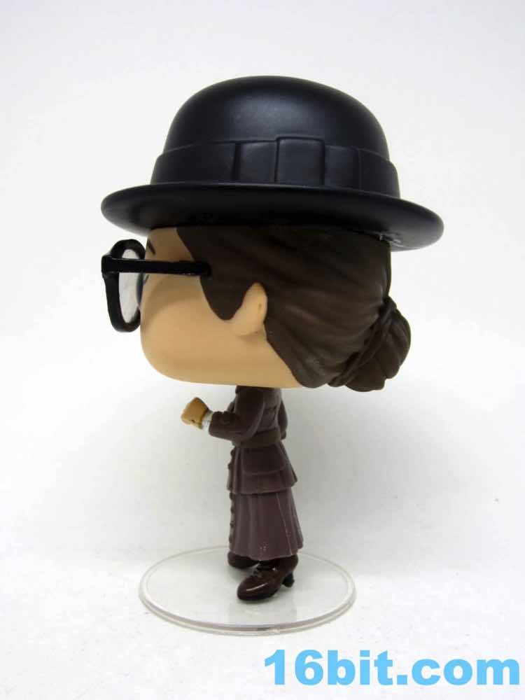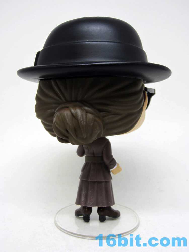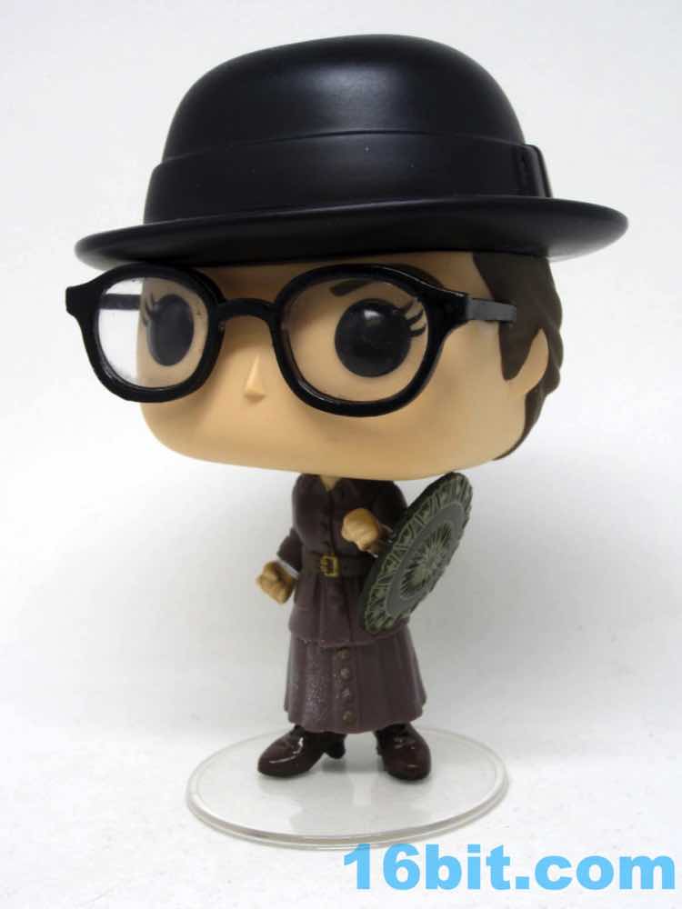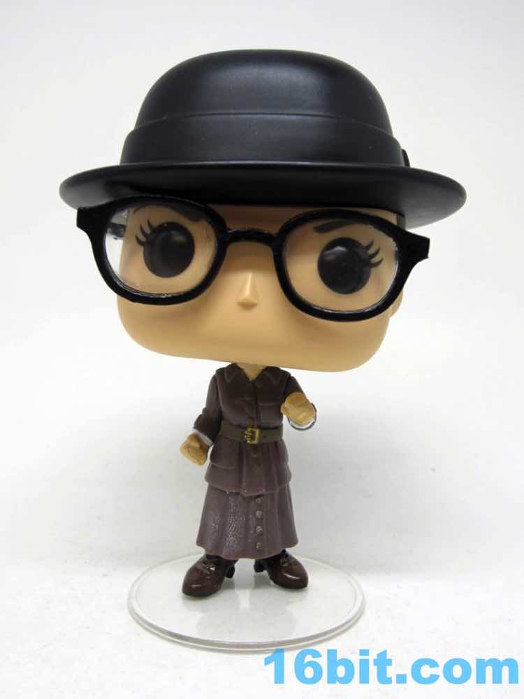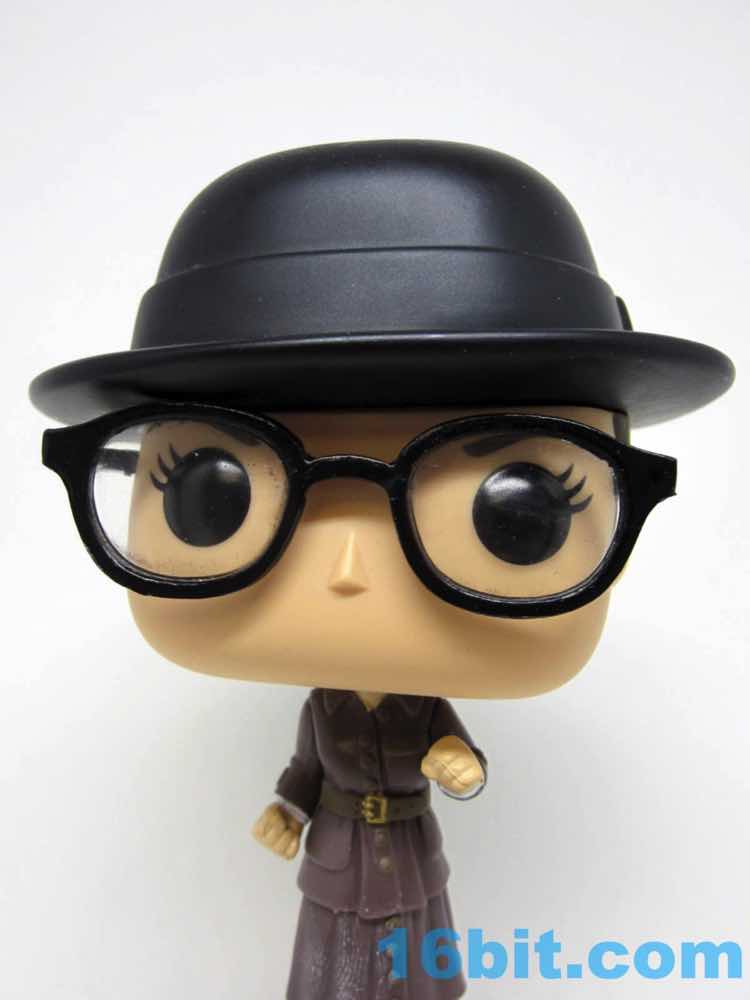 This 3 3/4-inch-ish scale figure has a jointed head and nicely painted shield that clamps on her left wrist. You can make out her power bands - the Bracelets of Submission - under the sleeves of her coat. Er, dress. Whatever it is, it looks really cool and Funko captured several layers of clothing on a tiny figure where you probably wouldn't even notice, but Funko also paints black soles and light brown laces on her dark brown shoes. They like detail. The packaging shows blush more pronounced than the figure but it's not like you're going to miss it - the expressive eyes with lashes and the big glasses with clear lenses would block them, anyway. Also, she has a swell hat. It's not removable, but it's cool.