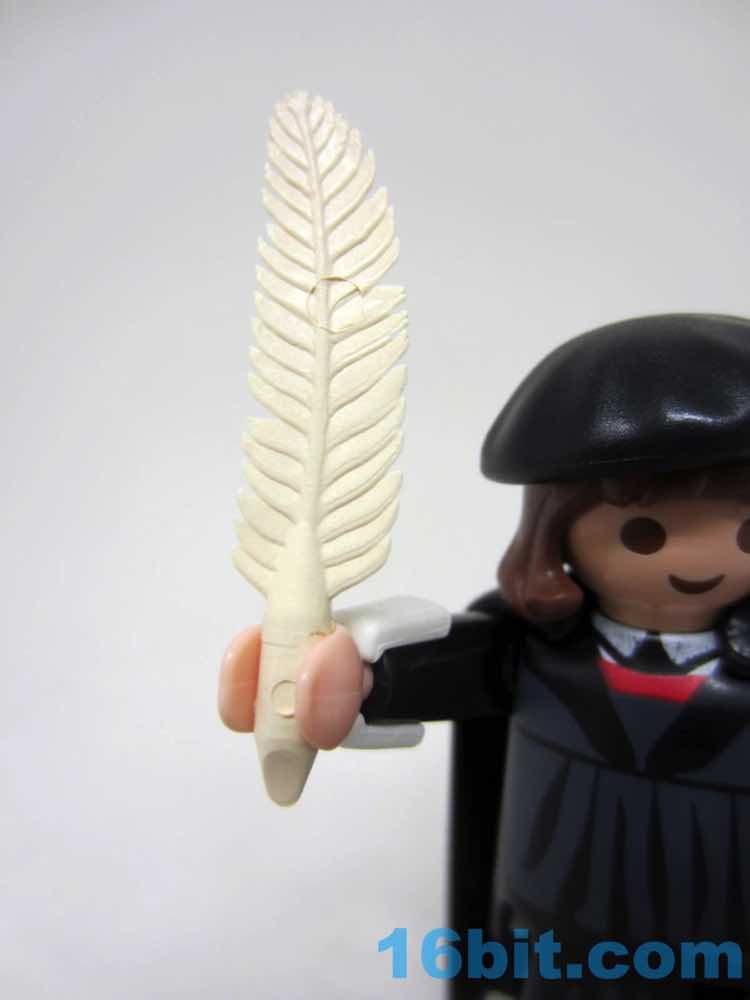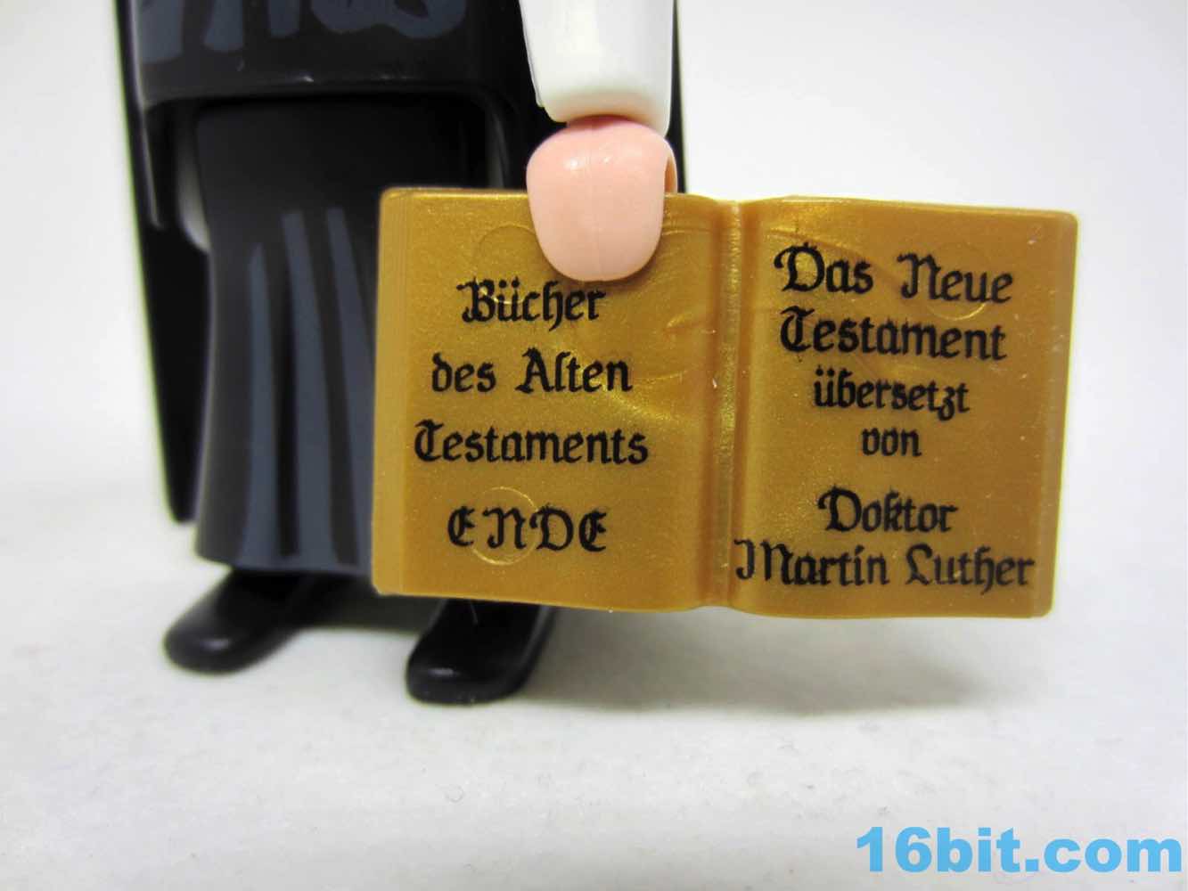 I'm endlessly enamored with historical figures in Playmobil, and with things that don't seem like appropriate toys for children. (Also dinosaurs.) Martin Luther seems about as exciting as socks on Christmas, which is what makes it such a bizarre thing to add to the old Playmobil toy shelves. The Ninety-five Theses aren't 99 Luftballoons, but he can hold them and for some reason they're gold - a decent replication of worn, aged, yellowing paper. The printing is crisp and clean, and auf Deutsch. He also includes a feathered quill, presumably to use to stage a photograph of him writing said book. They had cameras back then, right?