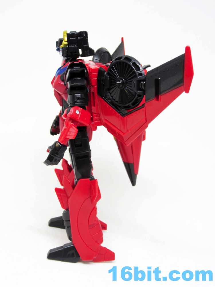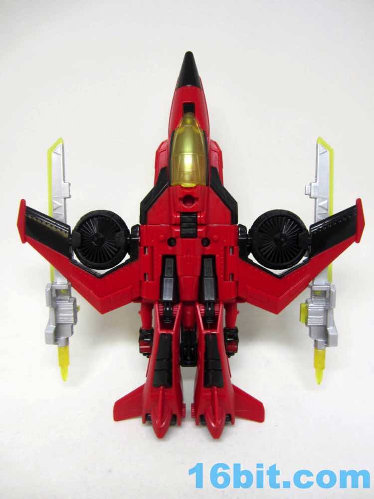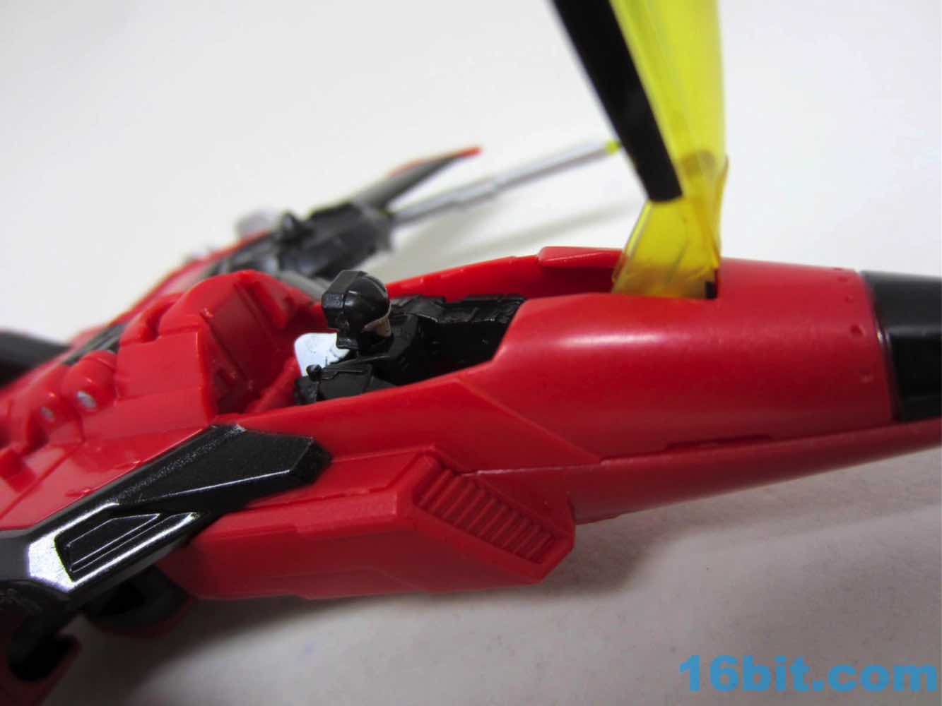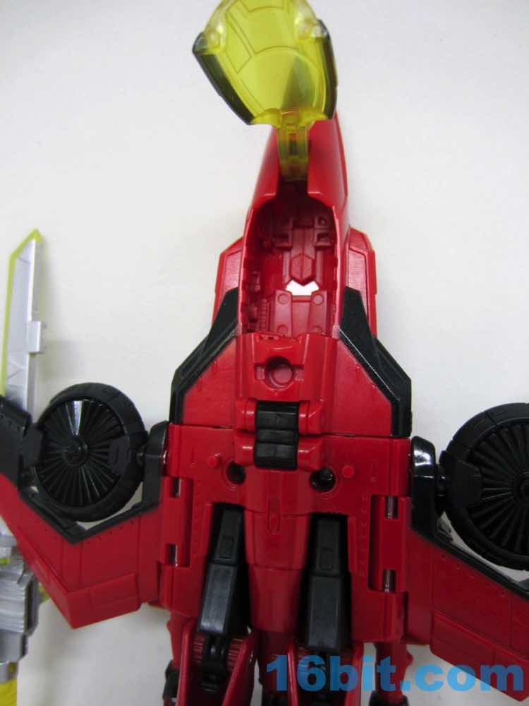 The jet mode is fun, and has a few moving parts. The fans are jointed, but they don't spin. There's a small hole behind the cockpit that looks like an X-Wing's astromech droid socket, but is actually for 5mm weapons to be mounted - fun! Small pegs on the back allow for tiny Titan Master robots to stand safely during flight. And of course, there's a landing skid under the opening cockpit for Scorchfire. Because Hasbro isn't completely sadistic, you also get on-wing storage for her two yellow and silver swords. Since you can actually do a lot of things with the jet, I can say I feel more impressed with it than some other toys. There aren't launching rockets or rear landing gear, but it still does a lot. Heck, it even retains the legs-as-the-back-of-the-jet gimmick as the other toys. I guess you can't win them all, but at least the detail is good and the angled wings look cool.