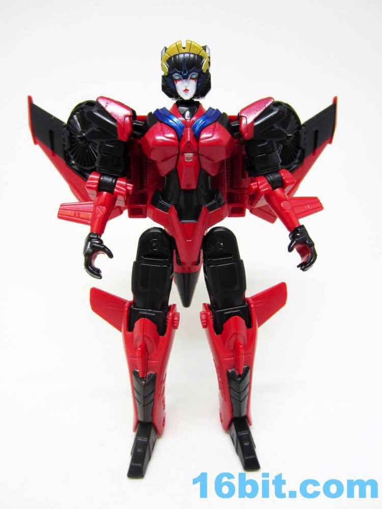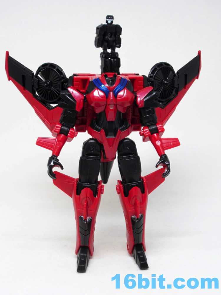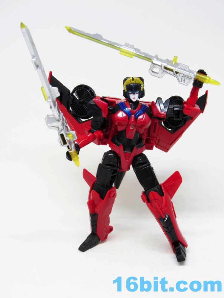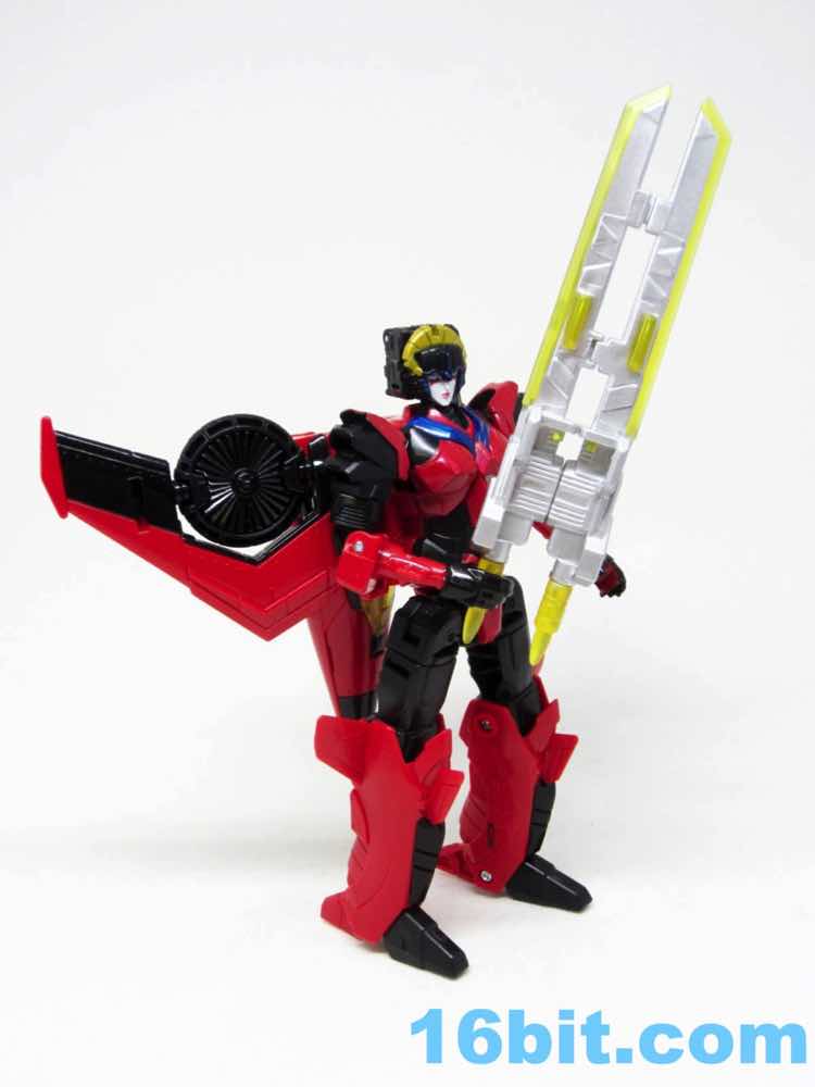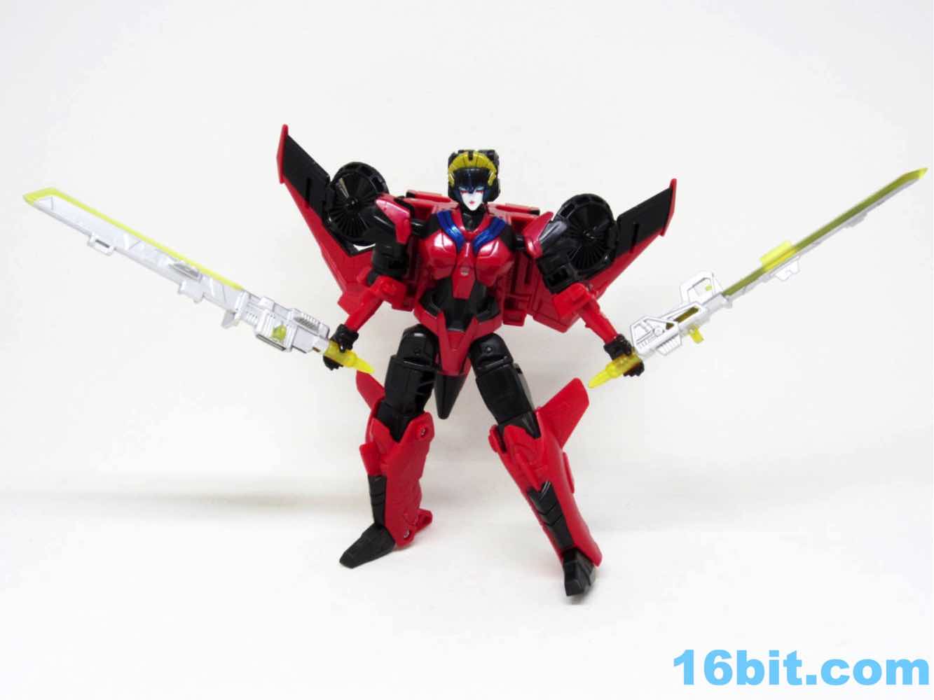I like the robot mode, but that isn't to say it's perfect. The head seems small on the larger body frame with fairly sturdy thighs recycles from Scourge/Highbrow. It doesn't break the toy, but the shoulder joints move in a way that you'll need to position carefully to make sure she doesn't look like she's having joint problems. Thankfully they have a good range of motion, and a surprising amount of detail. They painted the black parts red, with painted black hands and lots of sculpted bits to bring you a fairly decent Windblade figure. The original may look better overall, but this one has the deco of the comics and winder, brighter eyes. It's just that smaller face that may cause concerns - the figure itself is sturdy and can easily hold her two, giant, combining swords. I don't understand the significance of these weapons if they're meant for reuse, but the color looks nice against Windblade's black and red physique.